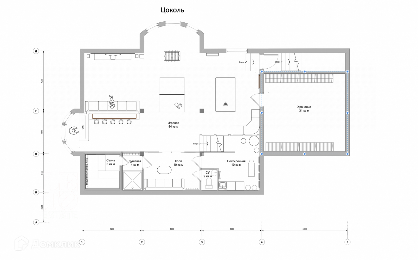Цокольный этаж - постирочная, кладовая, с/у, зона отдыха с бильярдом и домашним кинотеатром, сауна с душевой.