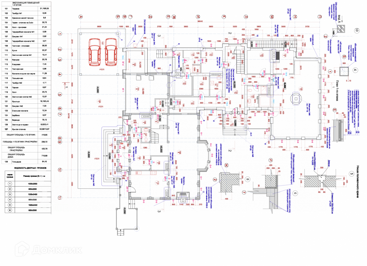 Первый этаж: прихожая, холл, 2 гардеробные, санузел, гостиная-столовая, кухня, кладовая, санузел, спальня, постирочная, котельная.