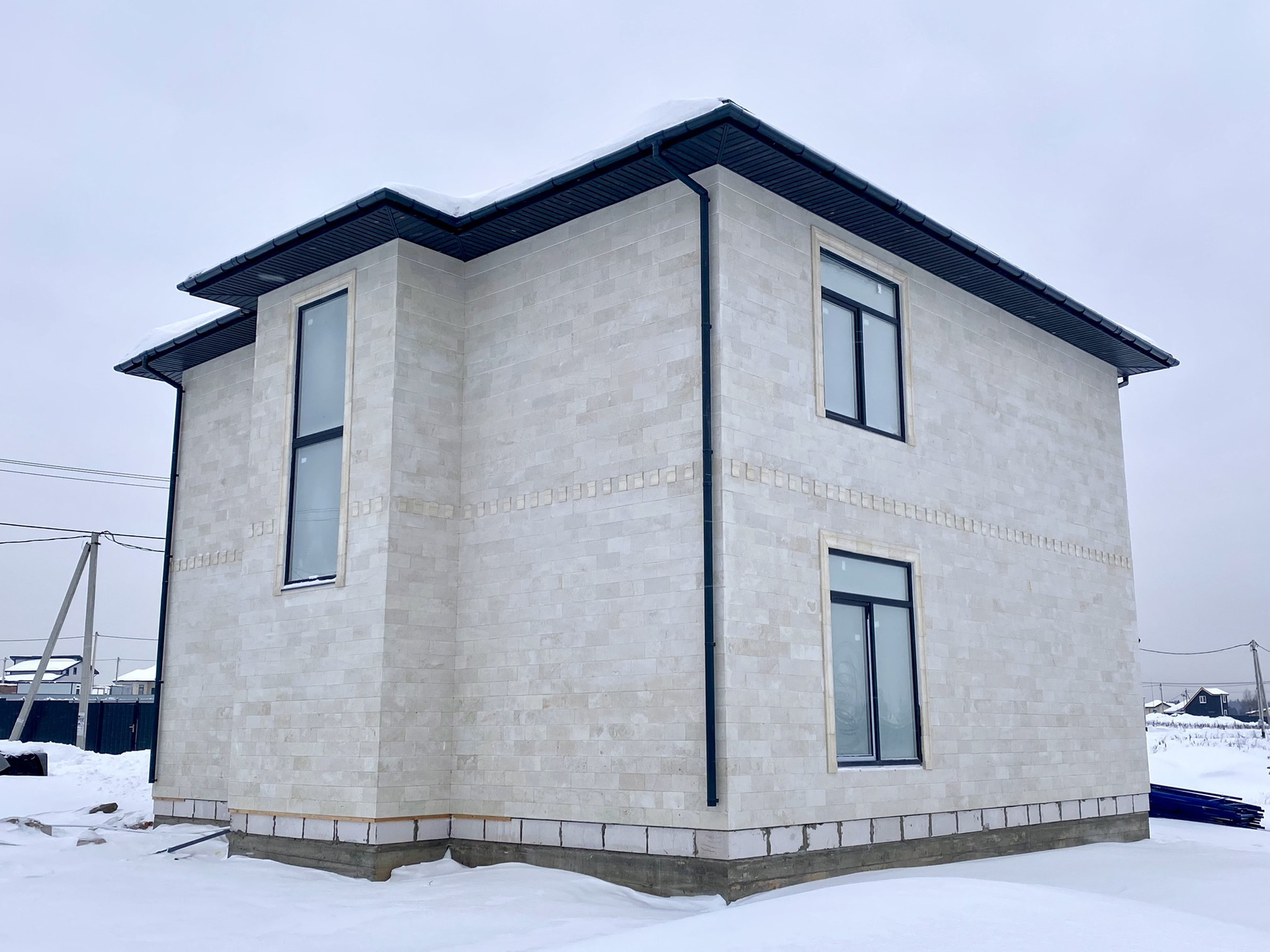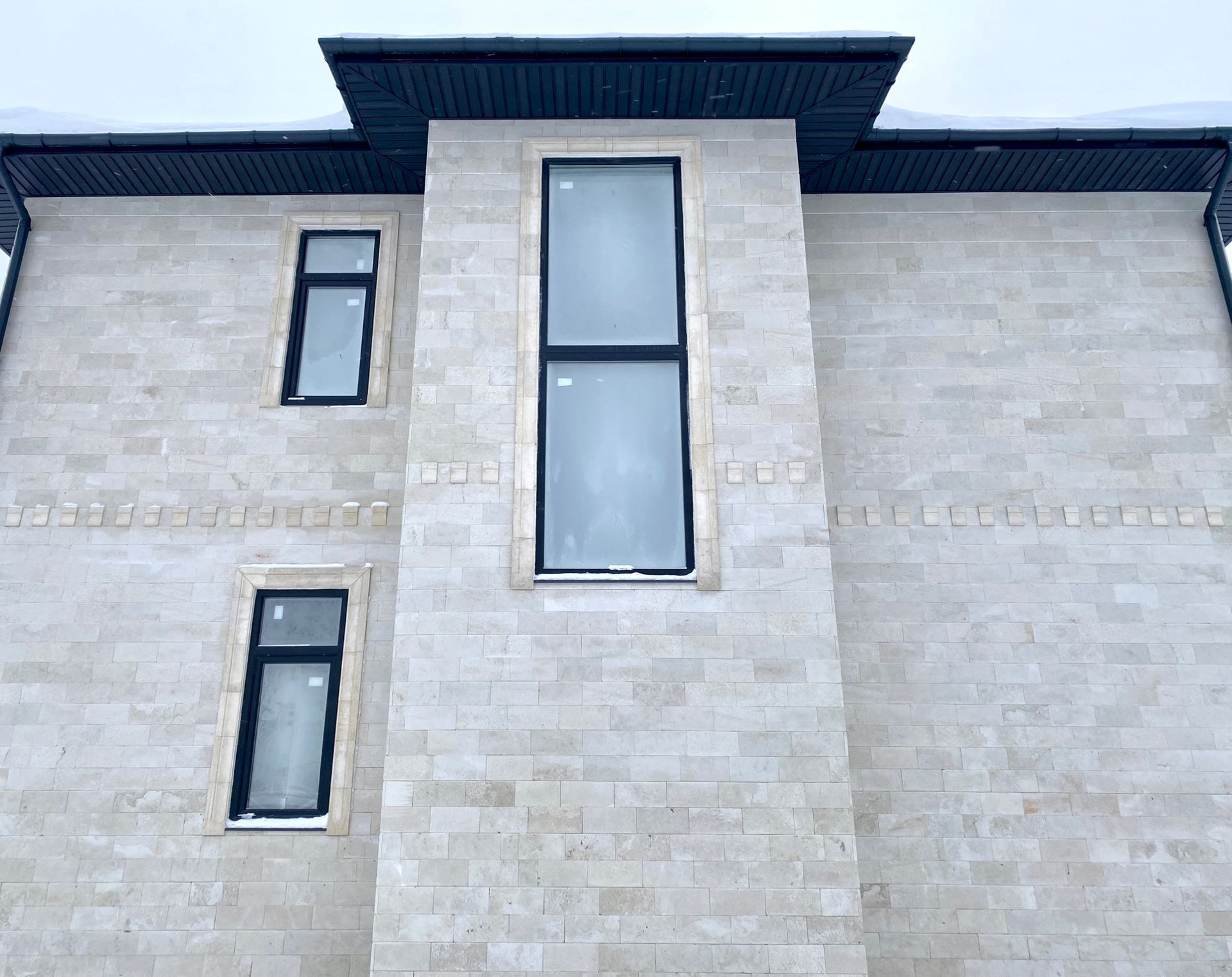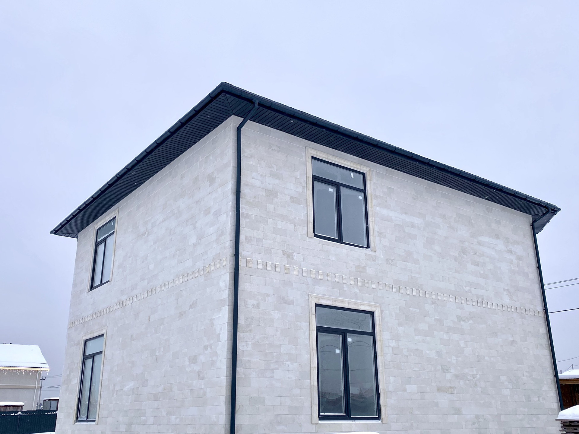 Фасад выполнен из дагестанского камня. Экстерьер выглядит изящно и свежо, в то же время оставаясь вневременным.  Правильные архитектурные пропорции, верно подобранный цвет и фактура отделочного материала, вертикальные линии, устремленные ввысь, зрительно делают этот дом аккуратным и приятным.