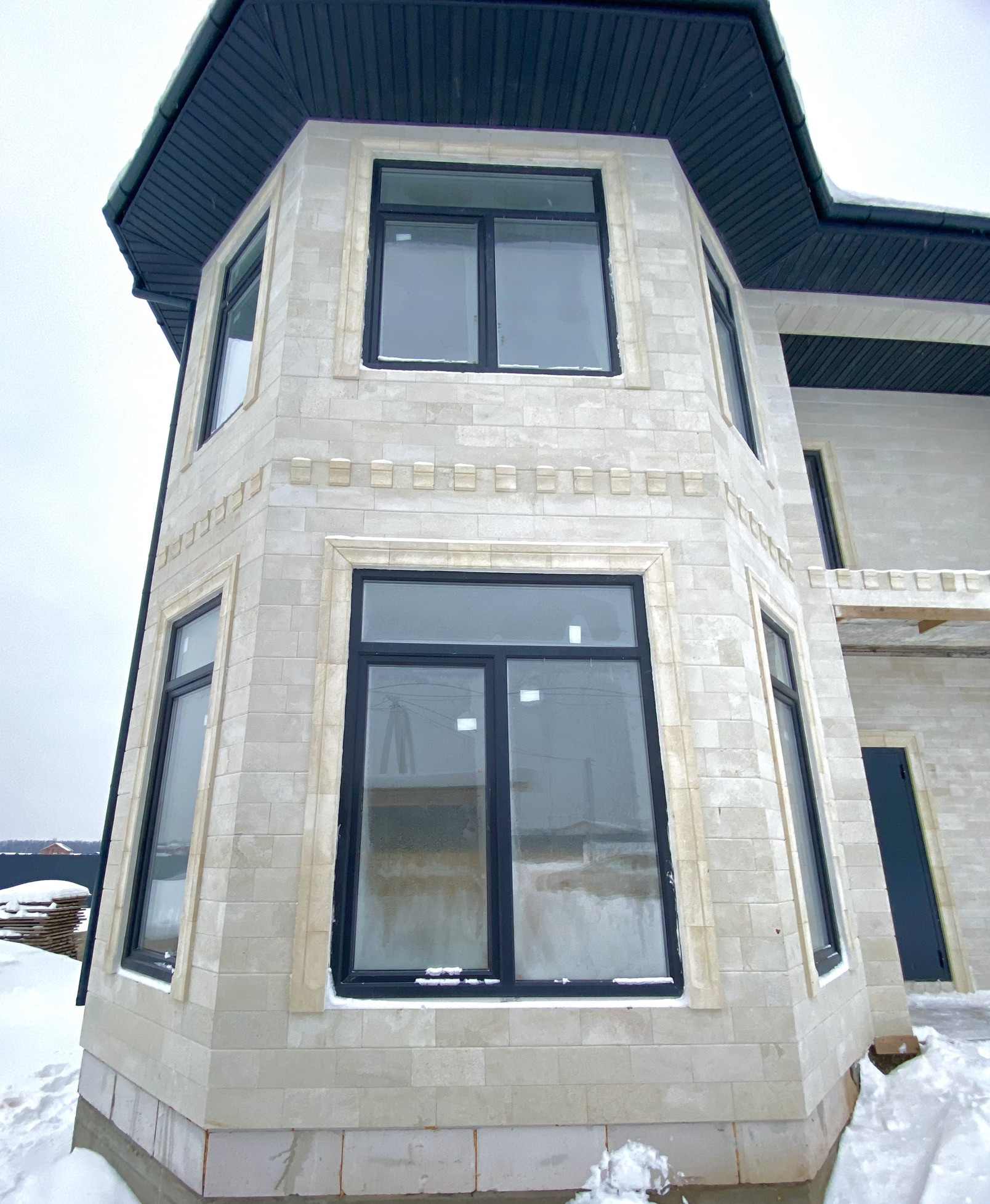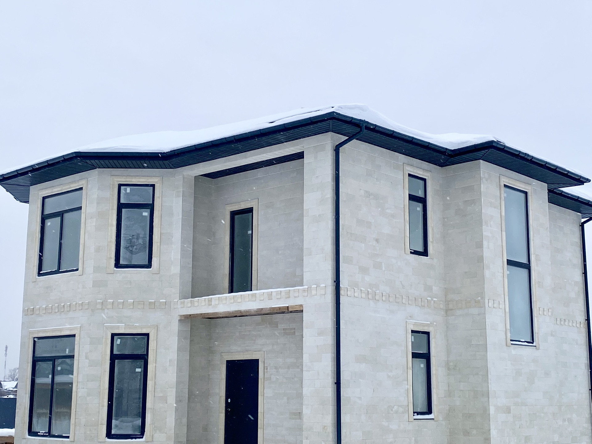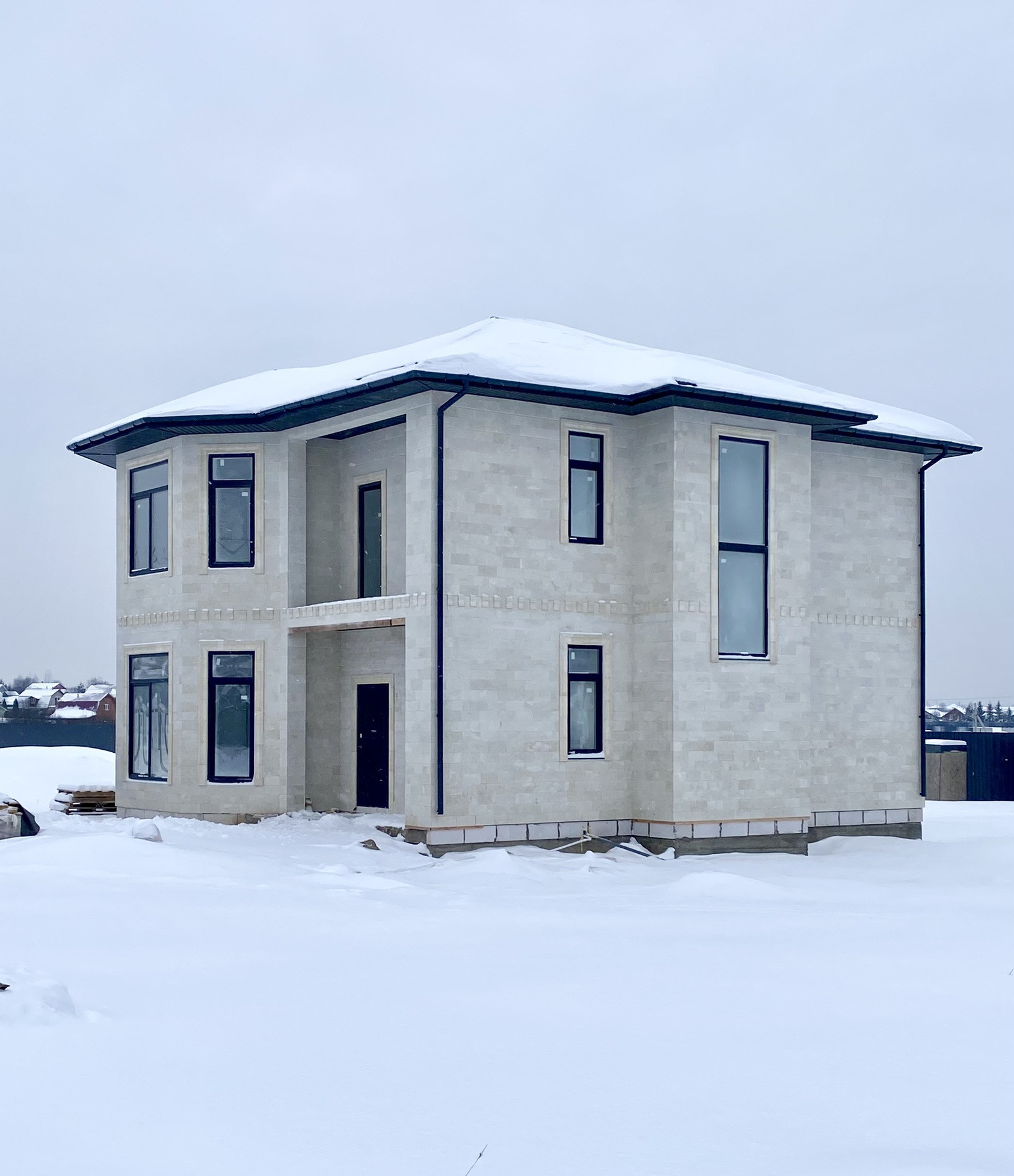 Фасад выполнен из дагестанского камня. Экстерьер выглядит изящно и свежо, в то же время оставаясь вневременным.  Правильные архитектурные пропорции, верно подобранный цвет и фактура отделочного материала, вертикальные линии, устремленные ввысь, зрительно делают этот дом аккуратным и приятным.