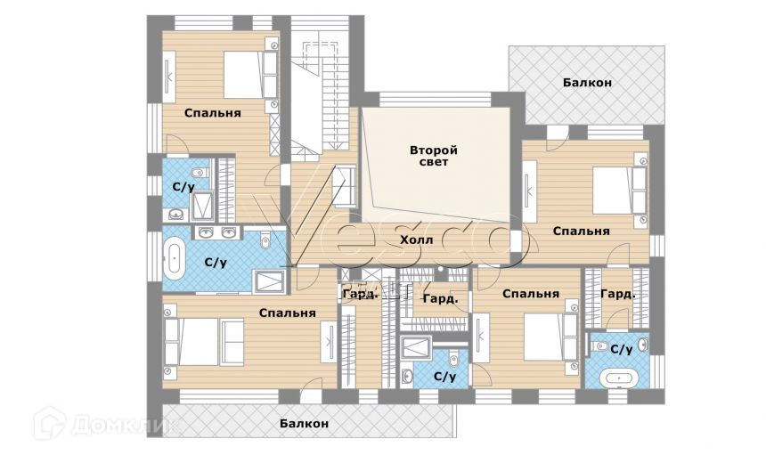 2 этаж - холл, 4 спальни с с/у и гардеробными.