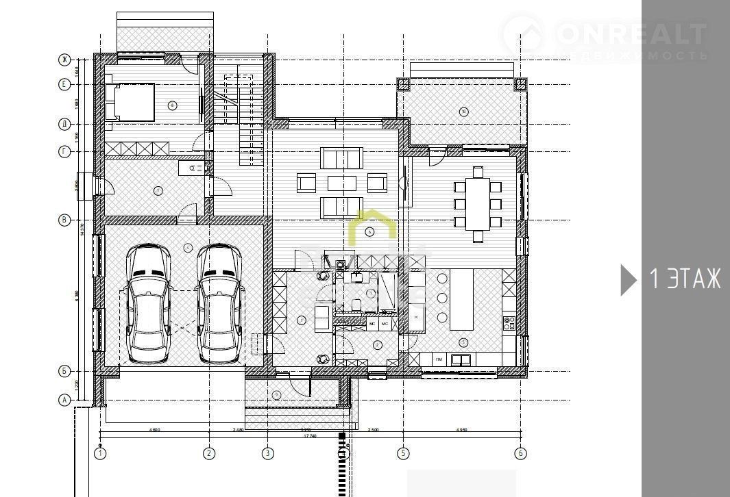 1 этаж: прихожая, постирочная, с/у, гараж на 2 а/м, кухня, гостиная, тех помещение, спальня, терраса.