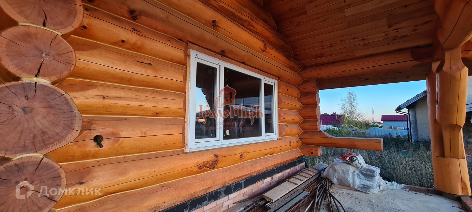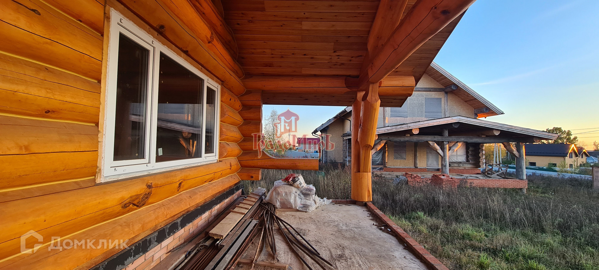 Возведен из рубленного бревна (380 - 420 мм) на залитом армированном фундаменте с полноценным подвалом и с перекрытием 1 этажа монолитной ж/б плитой. Заложены коммуникационные гильзы.  Подготовлены все точки подключения сантехники и электрики. В стоимость дома включен утеплитель и мягкая кровля.