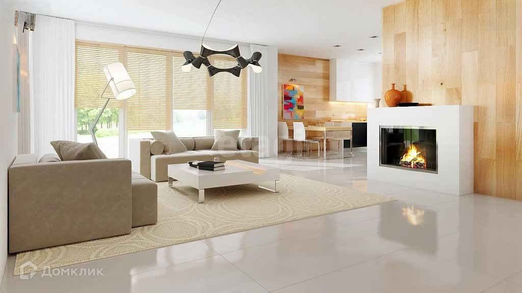 На первом этаже расположена большая гостиная с камином. В этом проекте она соединена со столовой и открытой кухней.