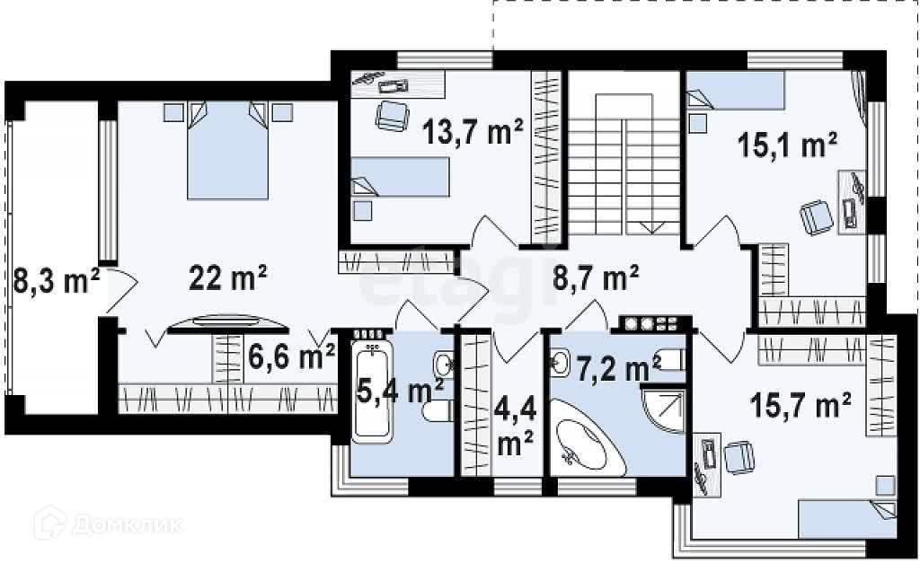Она состоит из трёх спален среднего размера и одной особенно большой комнаты 22 м2, с собственным балконом и ванной комнатой.