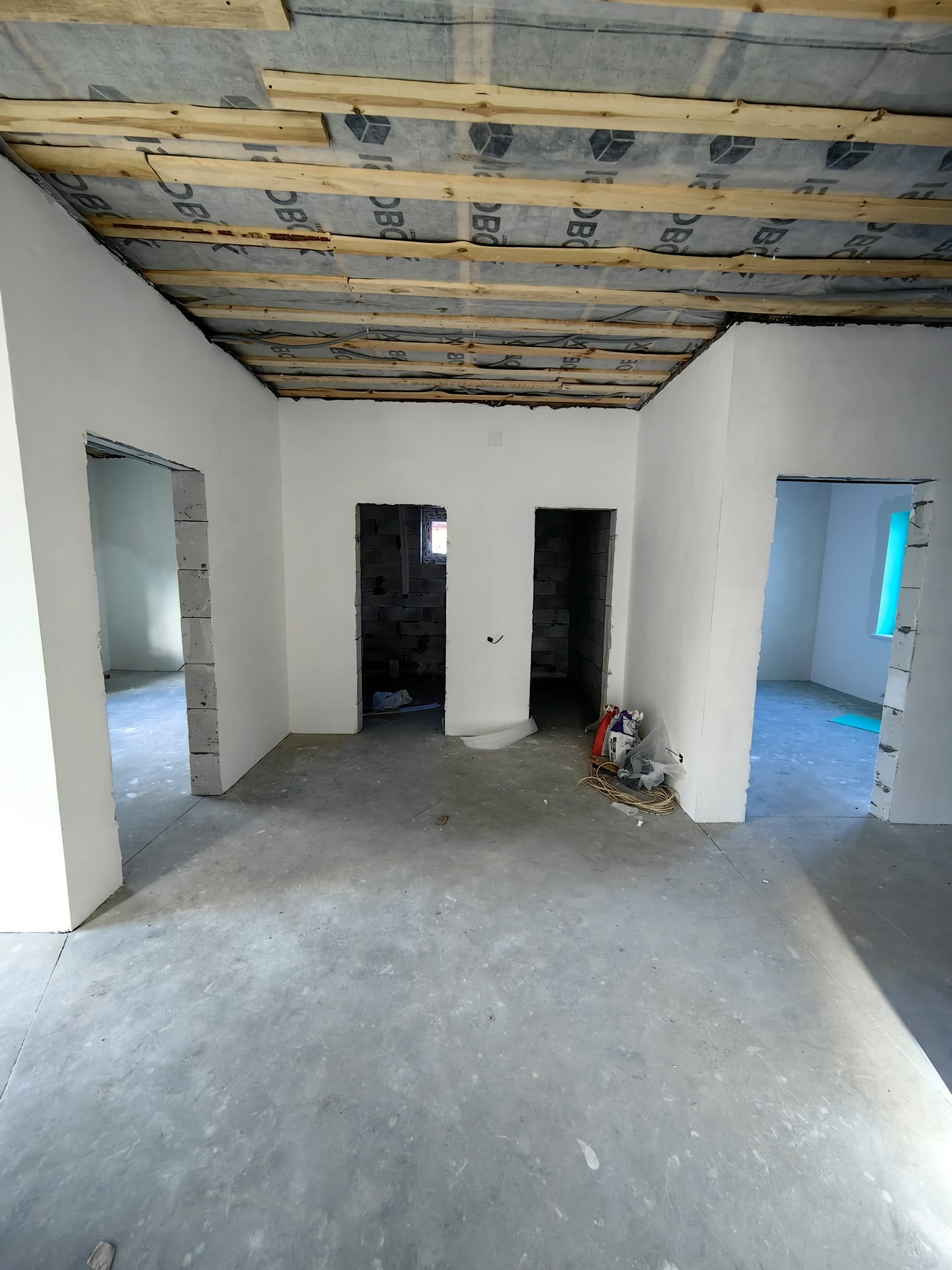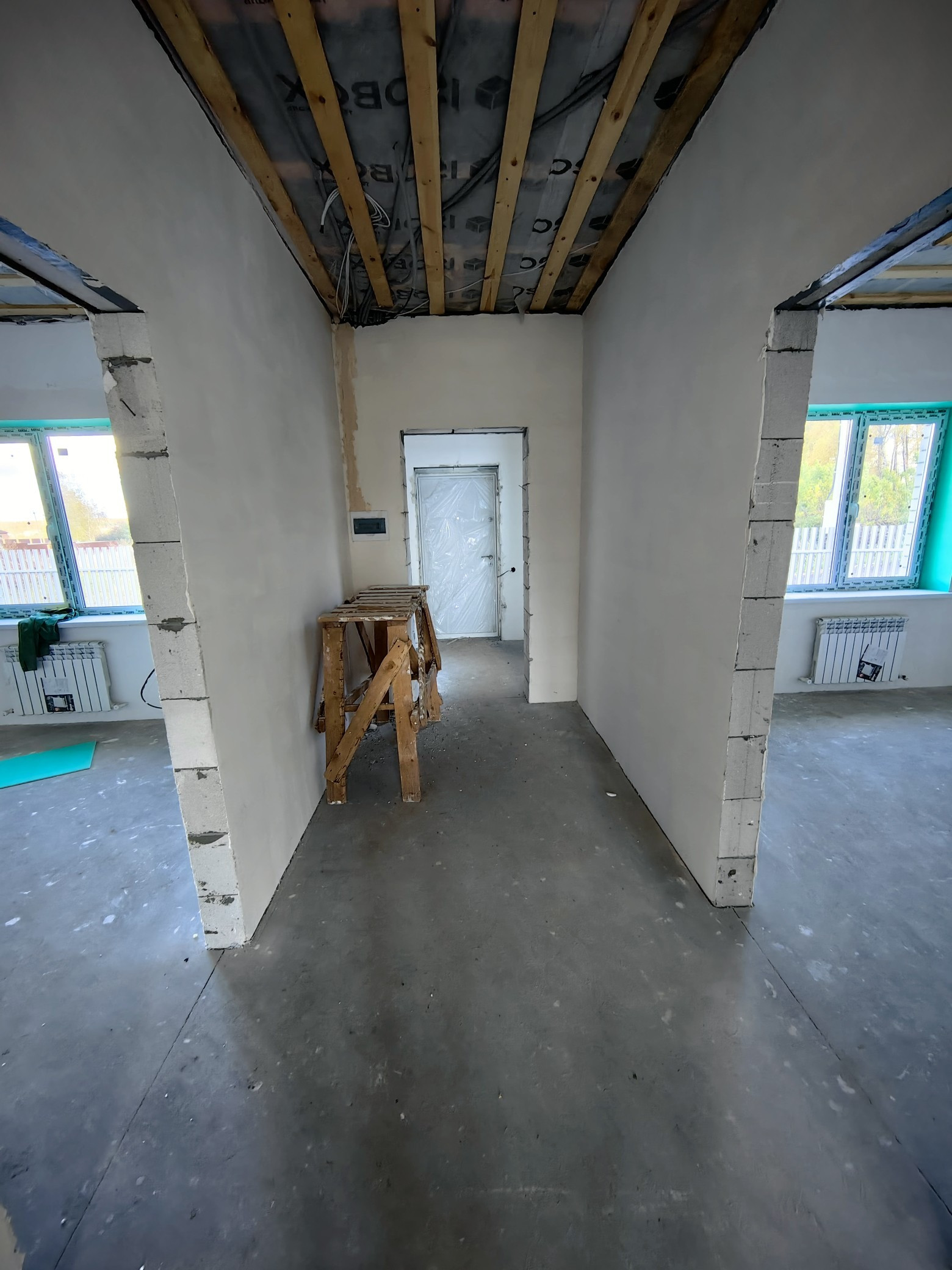 Пол монолитная плита, в доме сделанна разводка элекричества, отопления, установлены радиаторы, водяной тёплый пол, стоит газовый котёл, а так же сделана штукатурка и шпатлевка, откосы подоконники. Вода скважина, электричество, газ, септик выгребная яма(на 3 колеца по 1,5м диаметр).