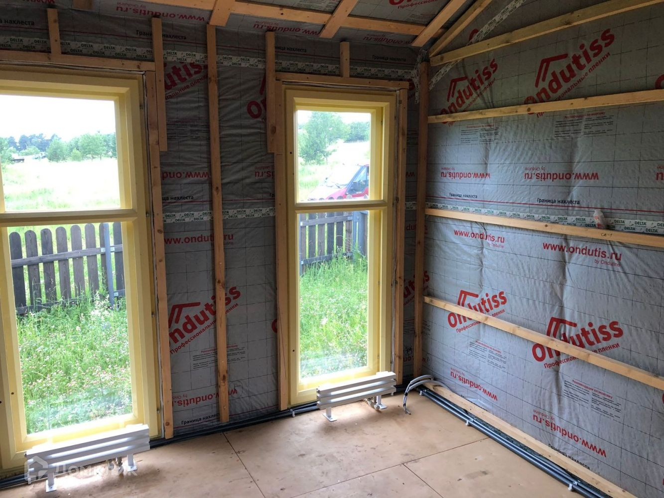 Тепловой контур, подключены вода + электричество 15 кВт, проведен магистральный газ по контуру участка , без чистовой отделки.