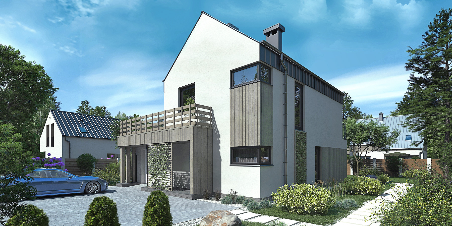 Дополнительно входит в стоимость: Въездная группа от улицы к дому с подготовкой под 2 машиноместа и забор единой стилистической концепции. Между соседями - 3д сетка.