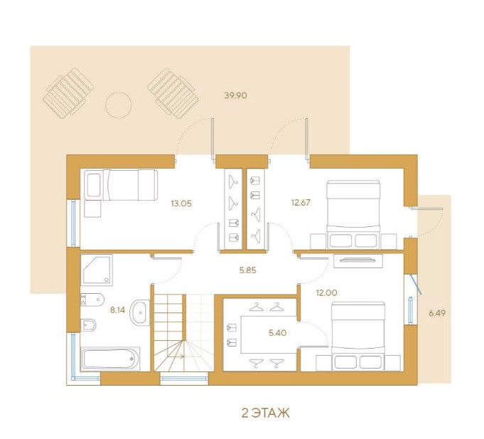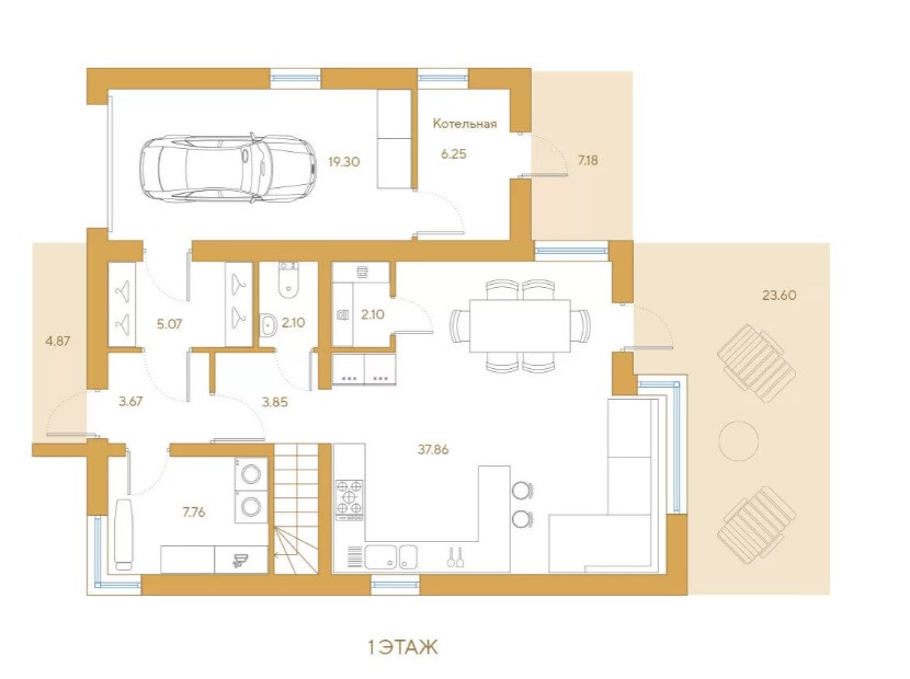 Пространство первого этажа представлено кухней-гостиной 38 м кв, кабинетом (или теплым гаражом) -19м. Три спальни с видовыми окнами находятся на втором этаже. Террасы по 40 метров и 23 метра, будут идеальным местом для семейных торжеств.