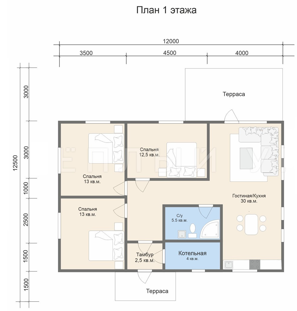 -Электросети: вводной щиток с автоматами, скрытая разводка кабеля в гофре (по 4 точки на помещение, по 1 точке на террасе и балконе, в кухне-гостиной 8 точек)