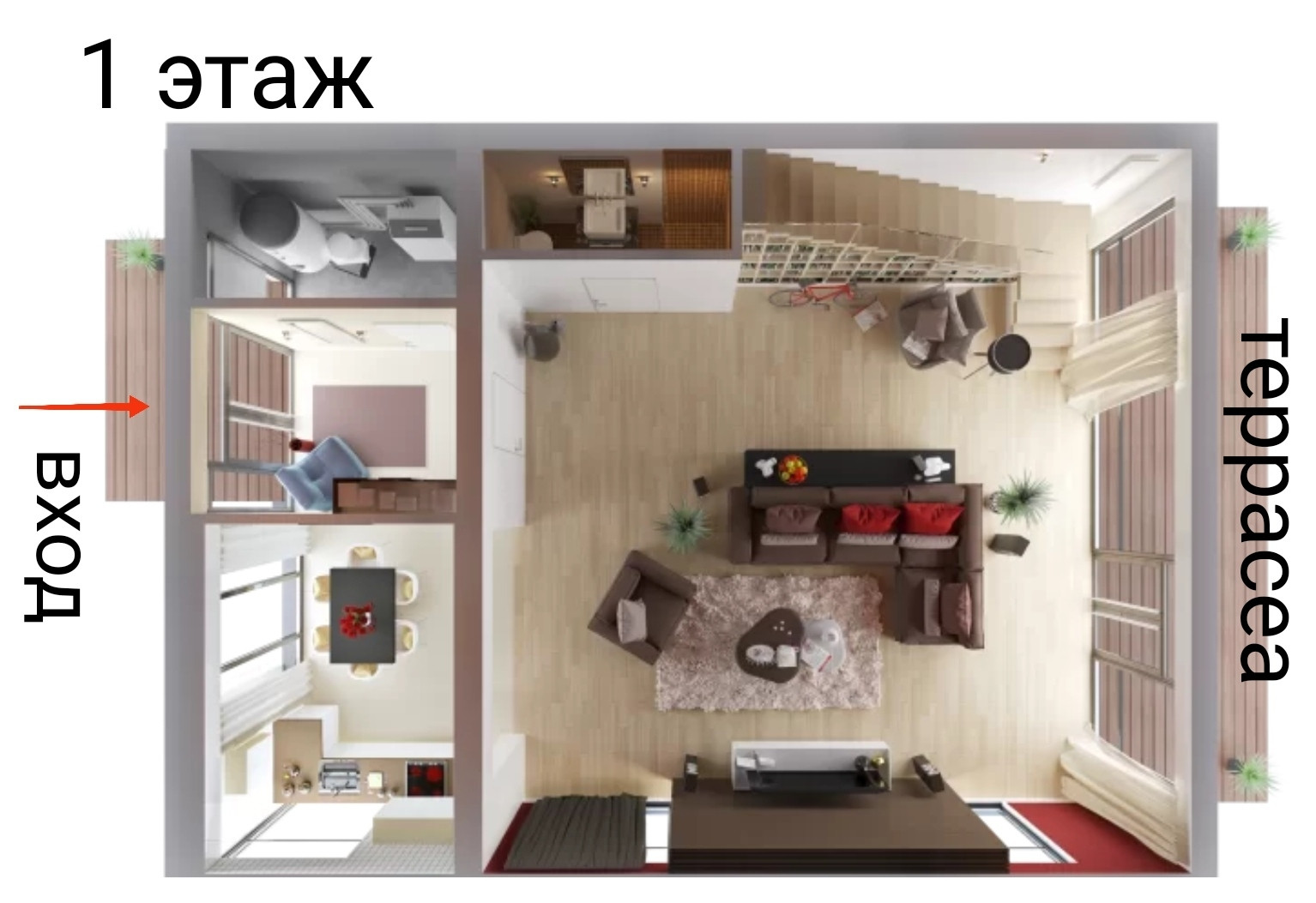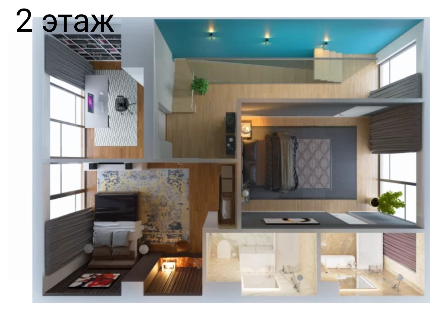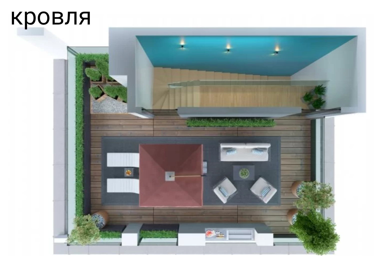 на площади 238 м² вы можете расположить 5 спален, оформить гостиную и столовую, объединенную с кухней а на эксплуатируемой крыше- террасе 47,6 м².,под открытым небом, можно организовать зону отдыха ,зимний сад