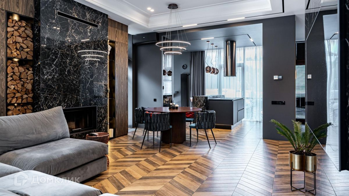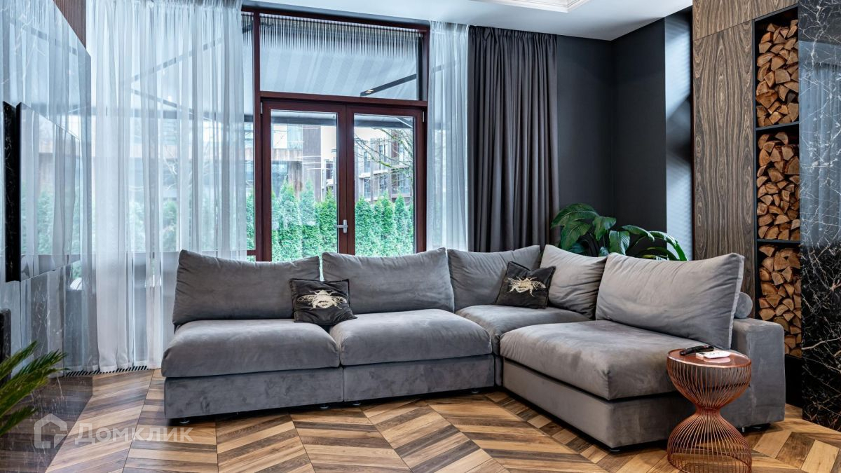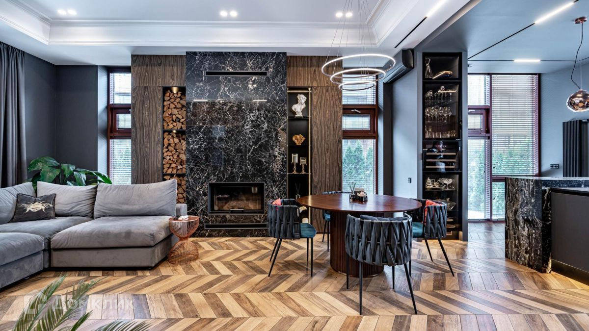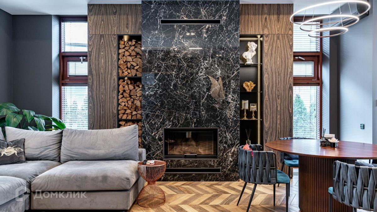 Уютная гостиная с действующим дровяным камином станет любимым местом для душевных посиделок с близкими.