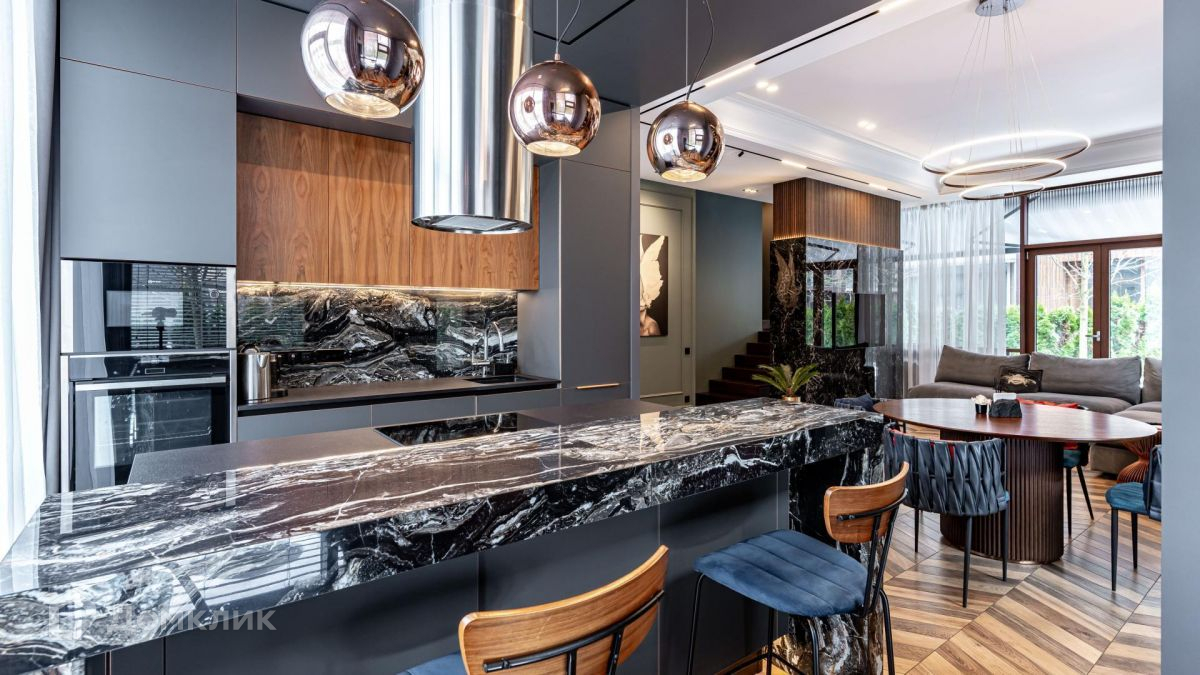 В доме выполнен дизайнерский ремонт с применением высококачественных материалов: натурального шпона дуба, декоративной штукатурки, краски "Little green" и "Benjamin moor".