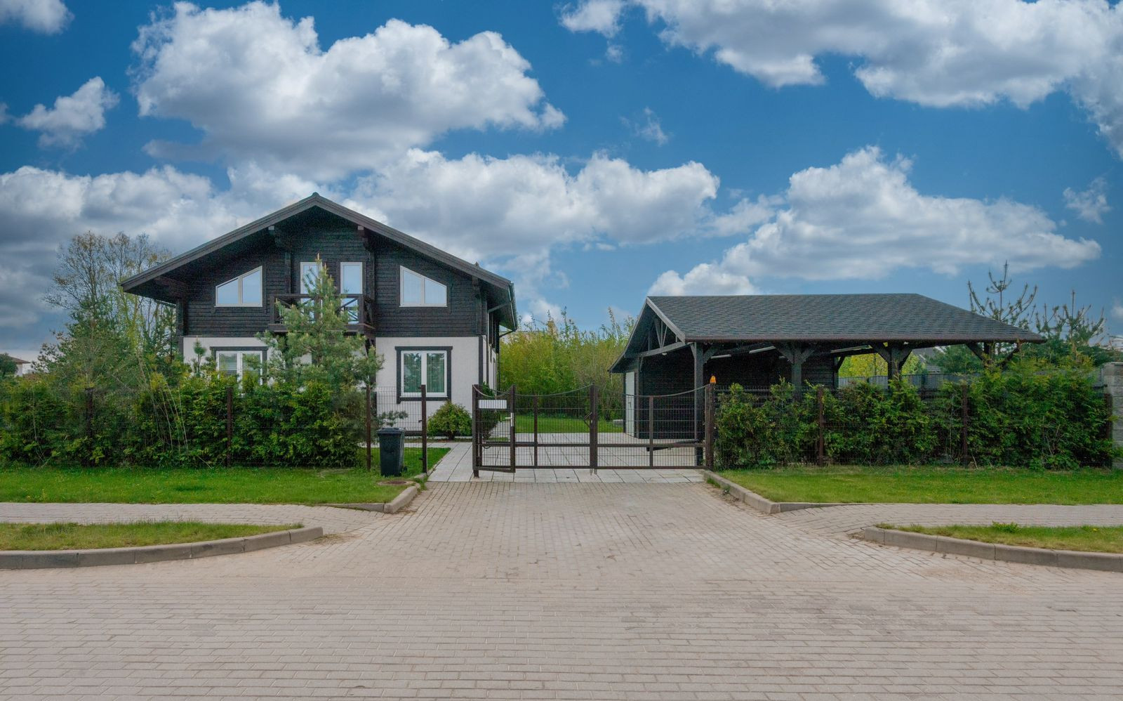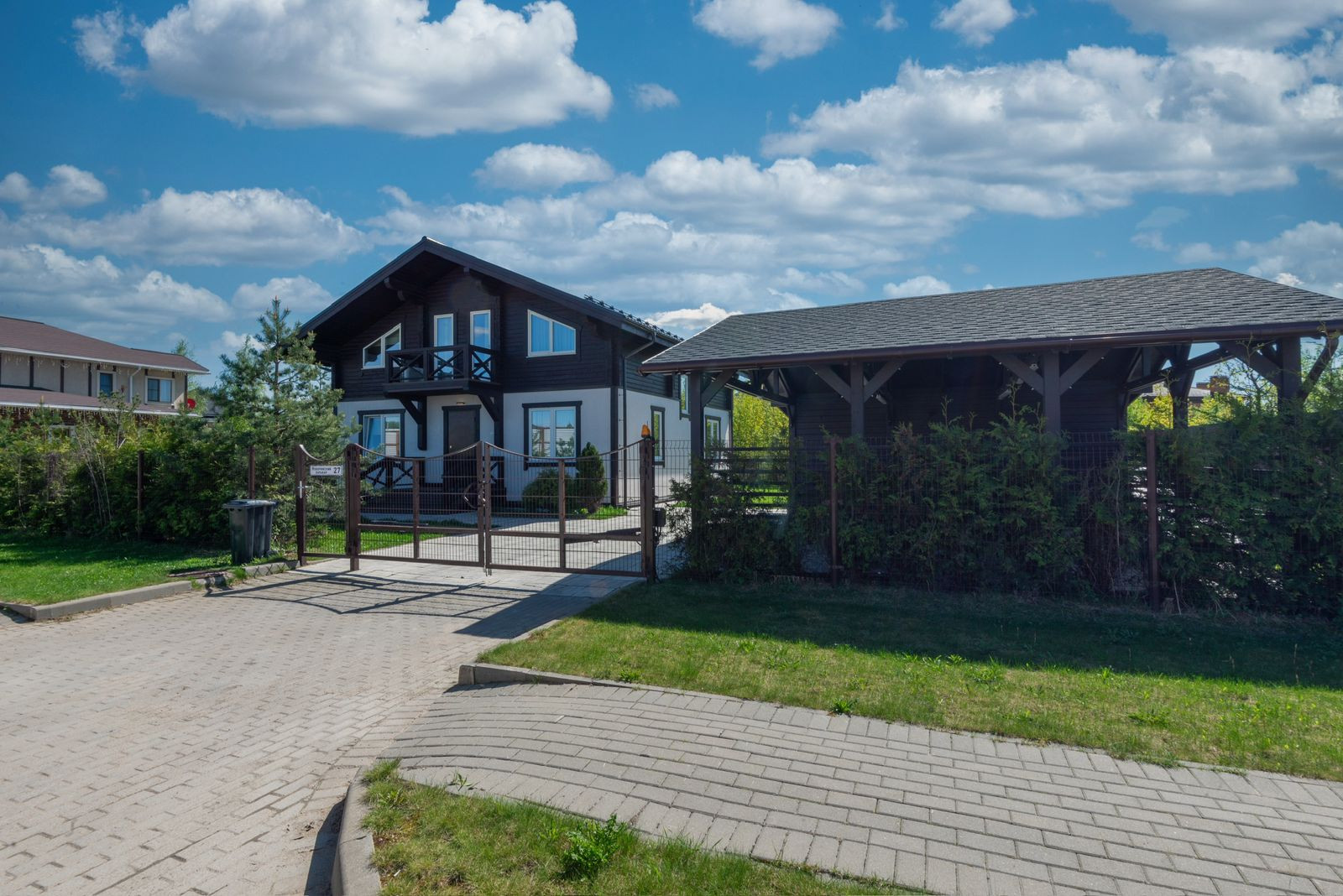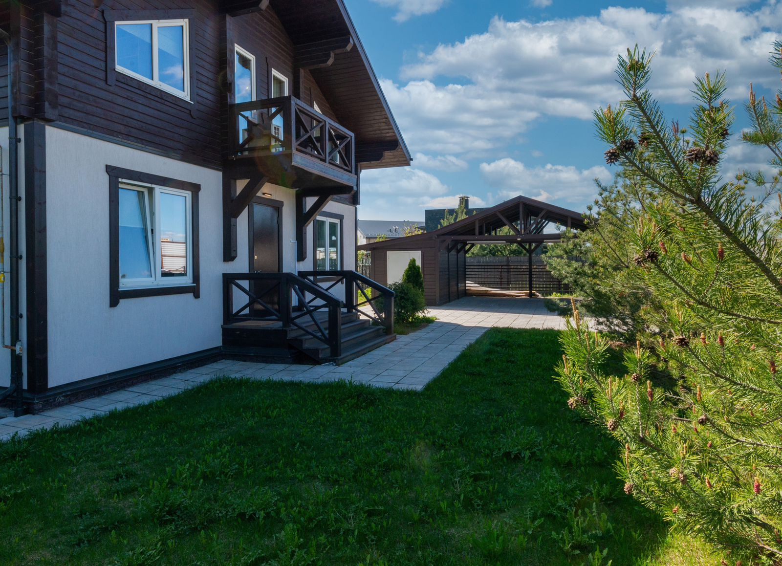 На участке 15 соток, выполнен ландшафтный дизайн. Вдоль забора высажены туи и сосны. Установлена немецкая система "автополив" с регулировкой. Видеонаблюдение по периметру всего участка. Автоматические ворота открываются с пульта. Навес на два автомобиля. Большая терраса.