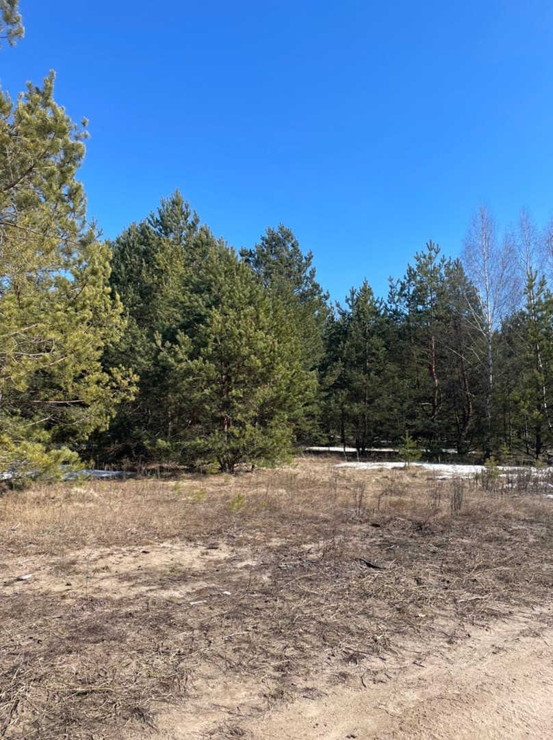 на участке сосны, рядом озеро, лес.