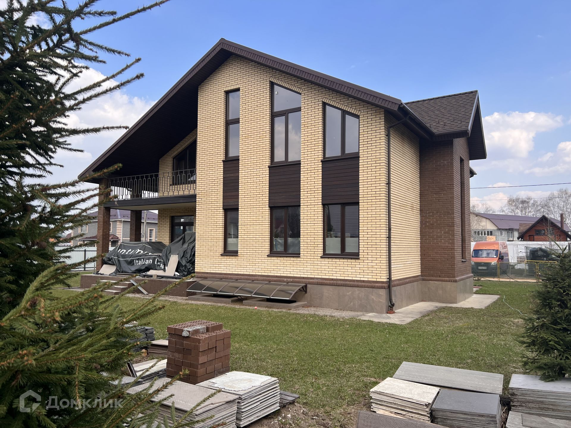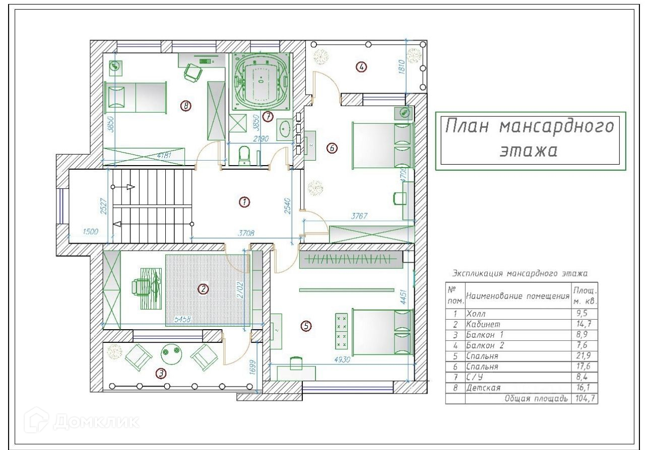 На втором этаже (мансардный) две спальни, детская комната, кабинет с балконом. Высота потолков до 5 метров.