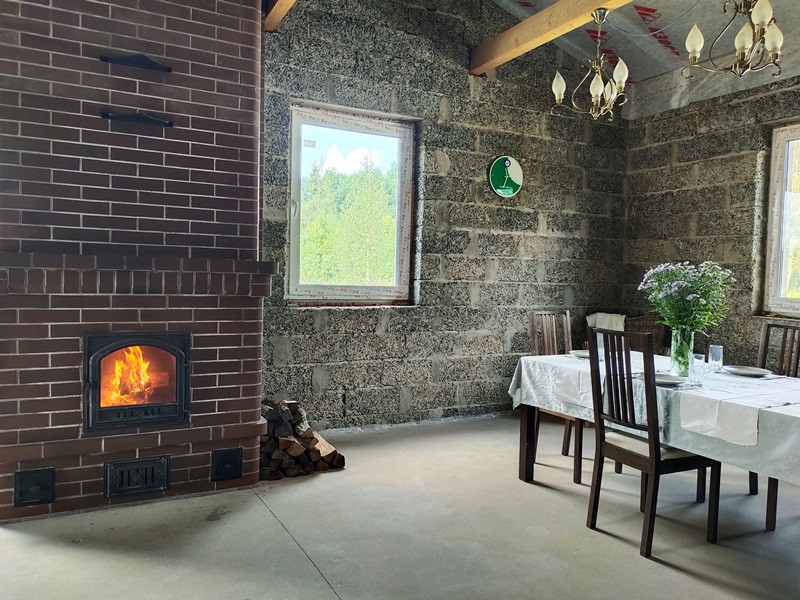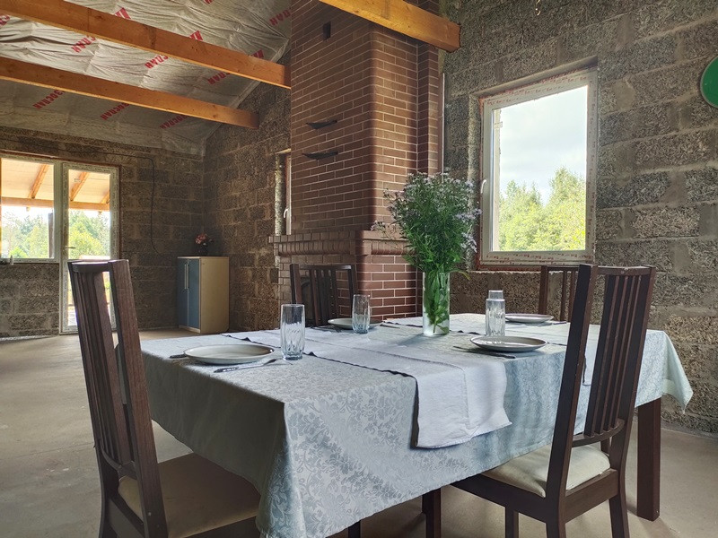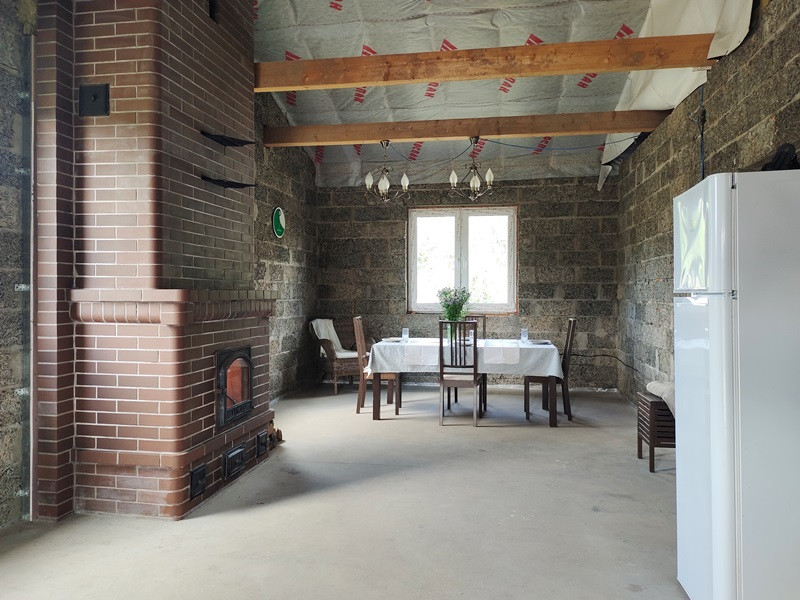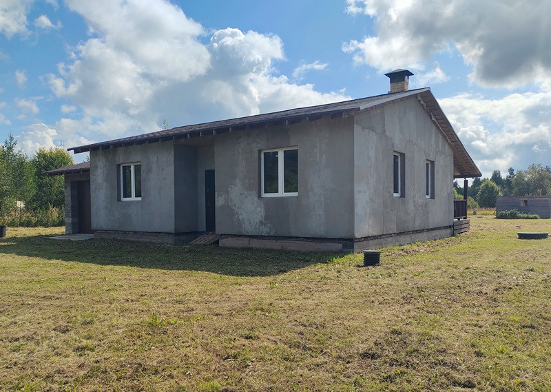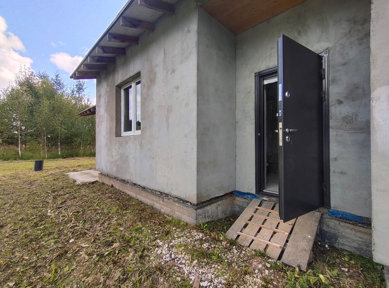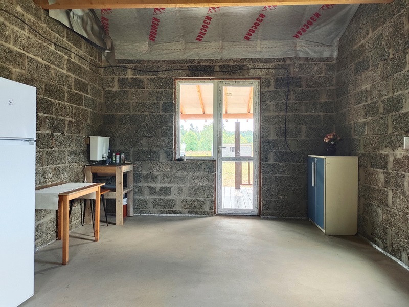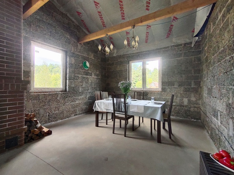 Планировка дома продумана. Две раздельные комнаты через холл друг от друга. Те, кто в одной из них, не будут мешать тем, кто в другой. Санузел просторный. Большая кухня-гостиная с высокими потолками, камином по центру и выходом на террасу. Терраса вдоль дома, широкая.