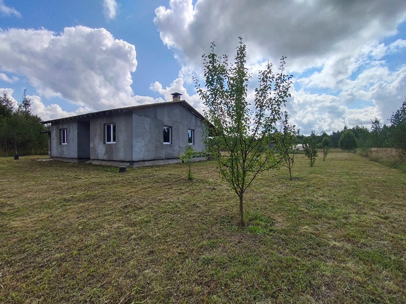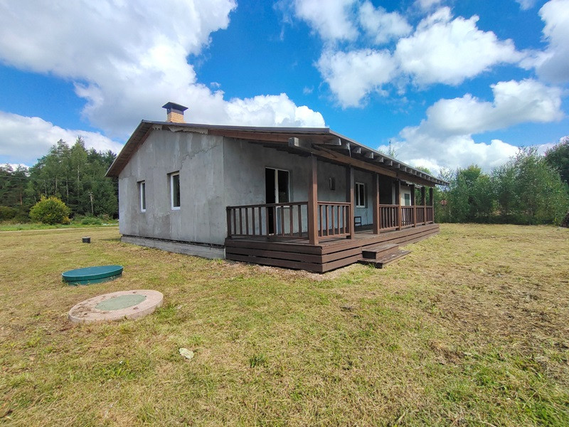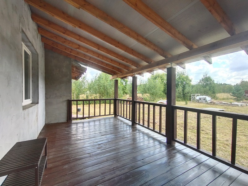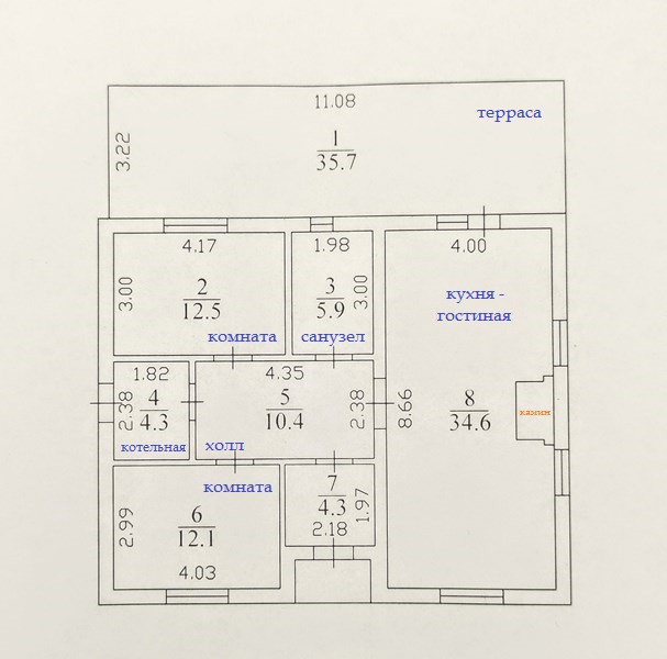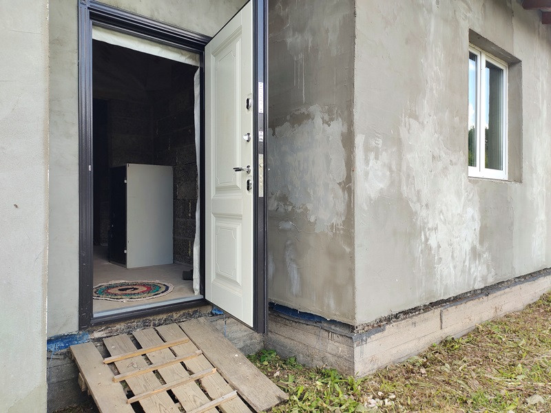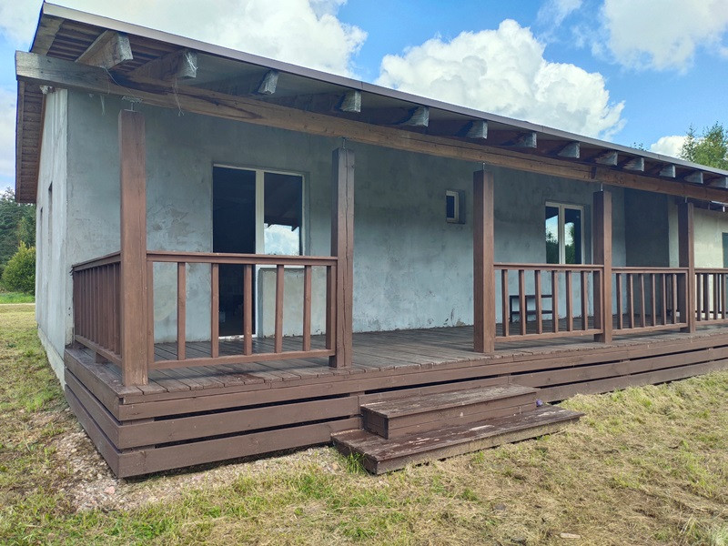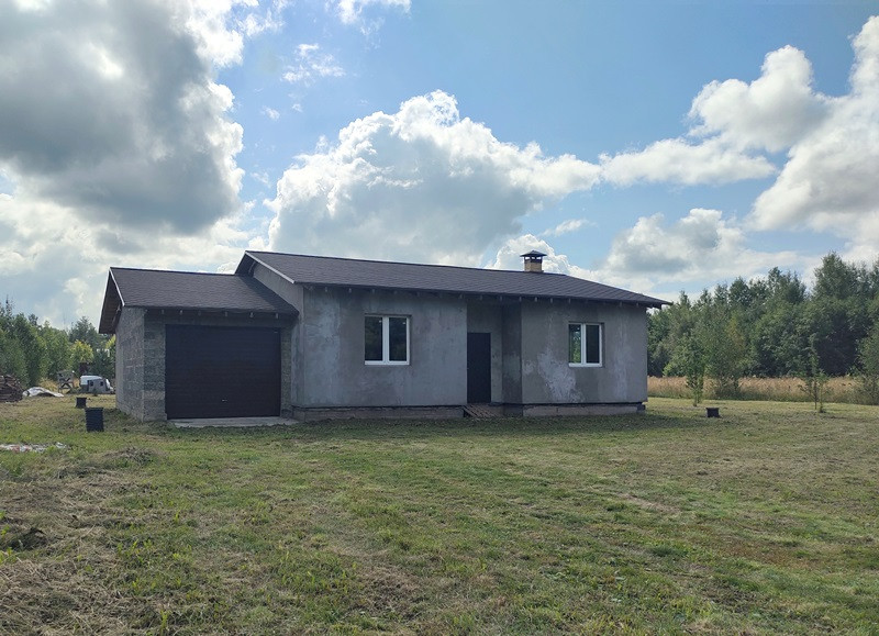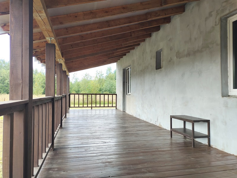 Планировка дома продумана. Две раздельные комнаты через холл друг от друга. Те, кто в одной из них, не будут мешать тем, кто в другой. Санузел просторный. Большая кухня-гостиная с высокими потолками, камином по центру и выходом на террасу. Терраса вдоль дома, широкая.