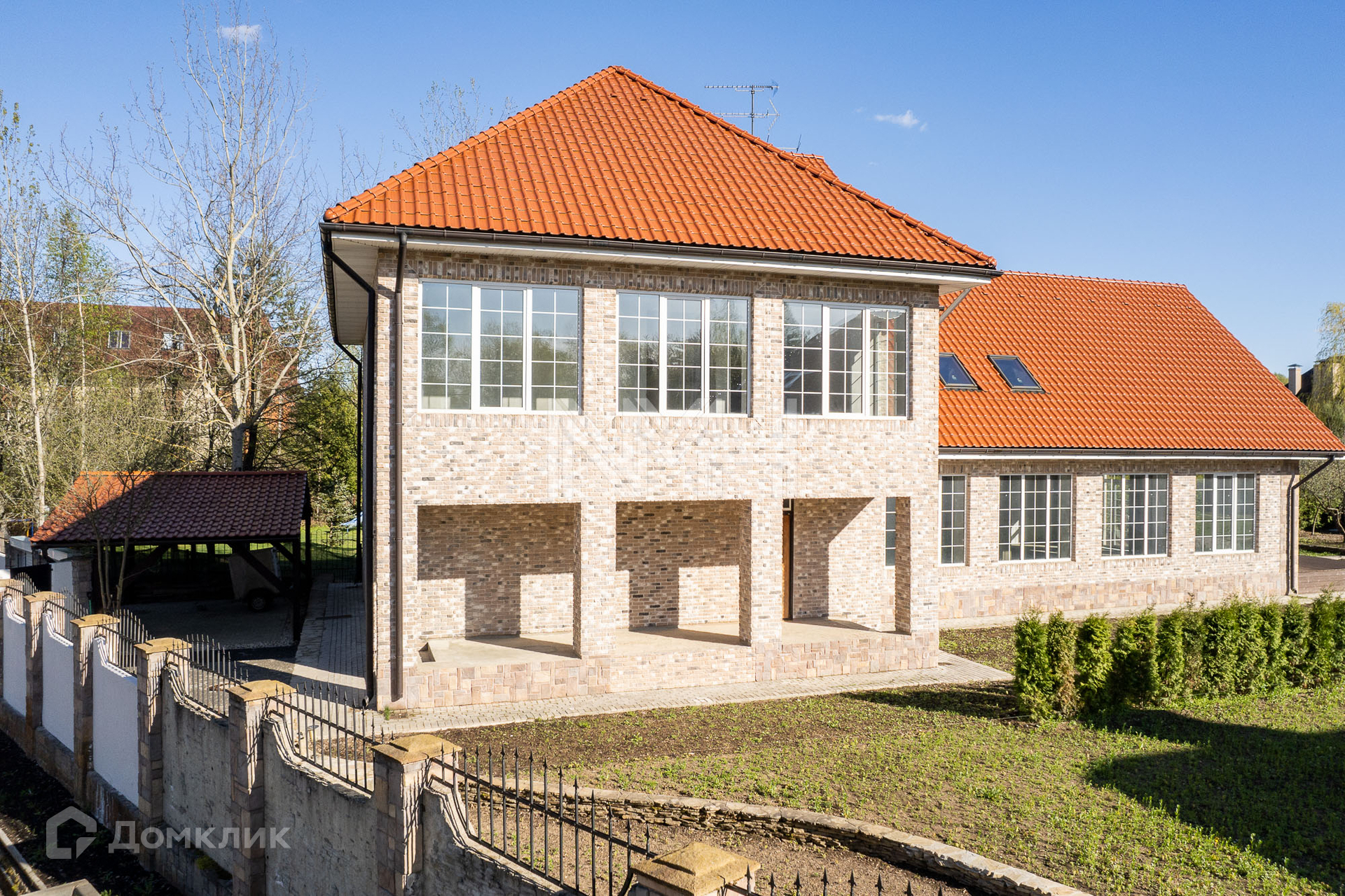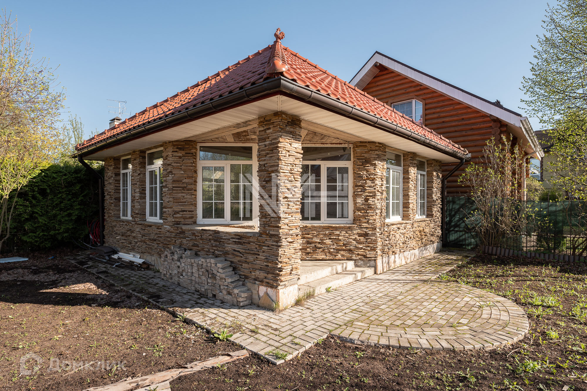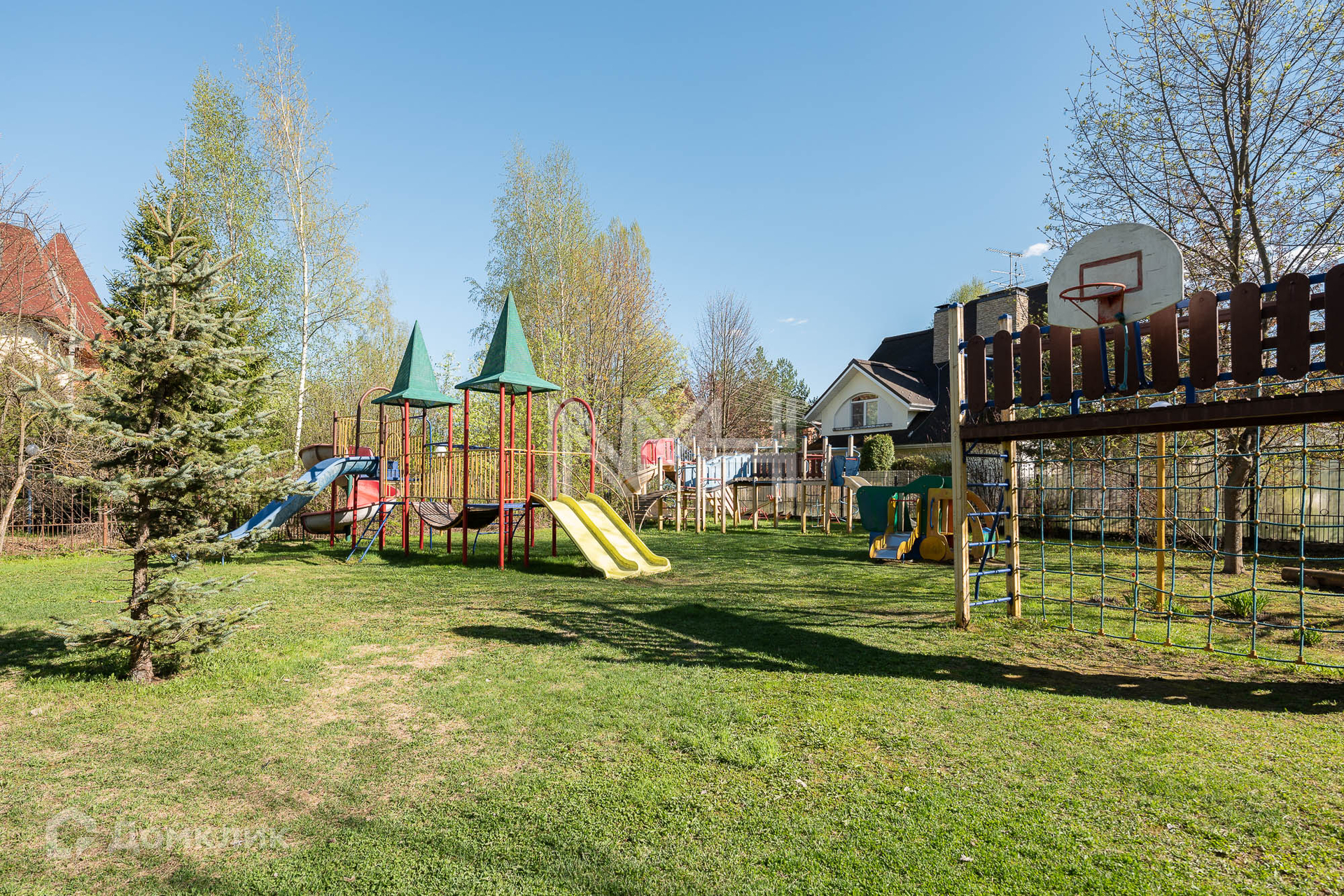 Участок 15 соток с газоном и туями. Остекленная закрытая беседка, детская площадка на соседнем участке. Дорожки и парковка вымощены брусчаткой. Участок огорожен забором на бетонном основании. Соседи все построены и живут.