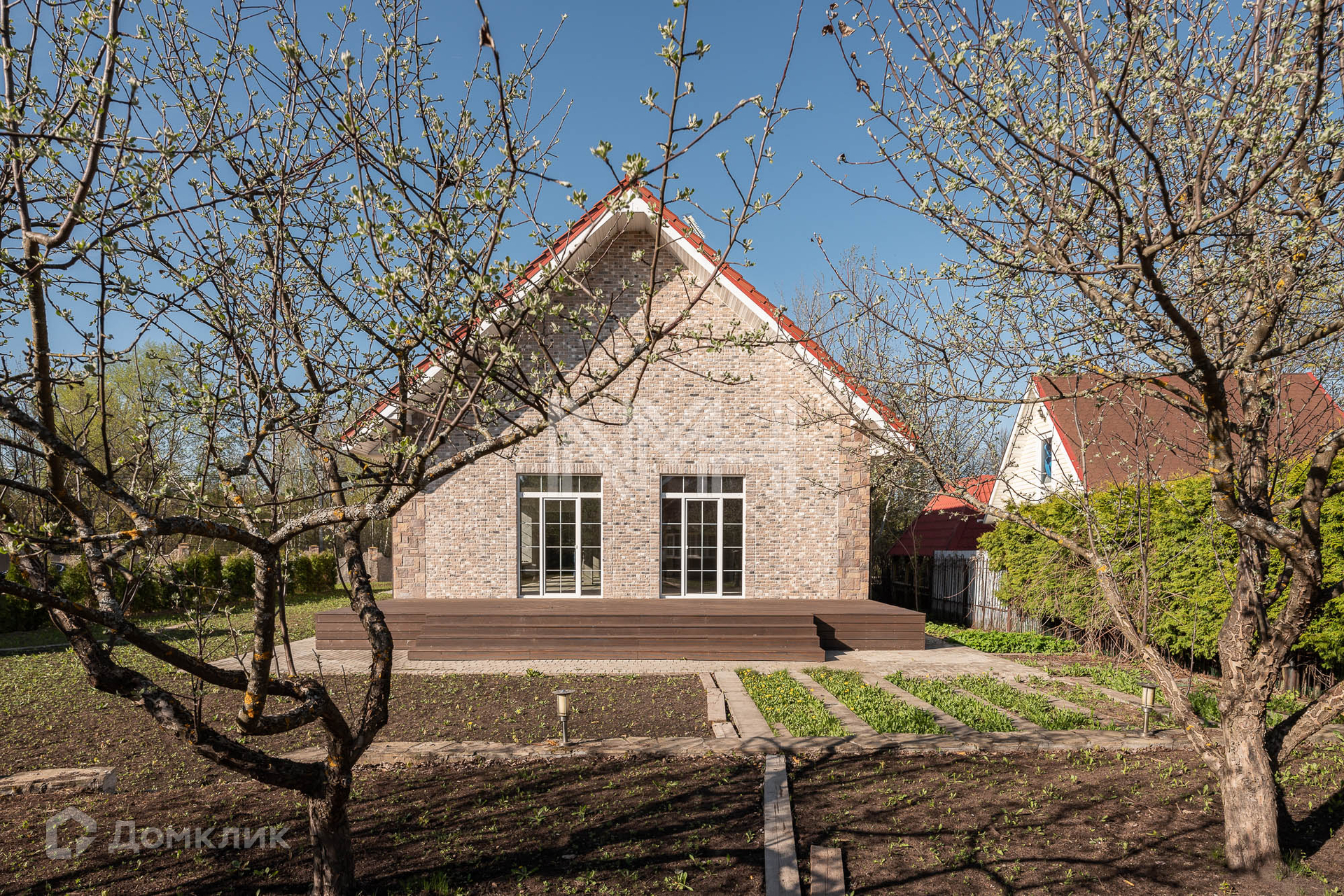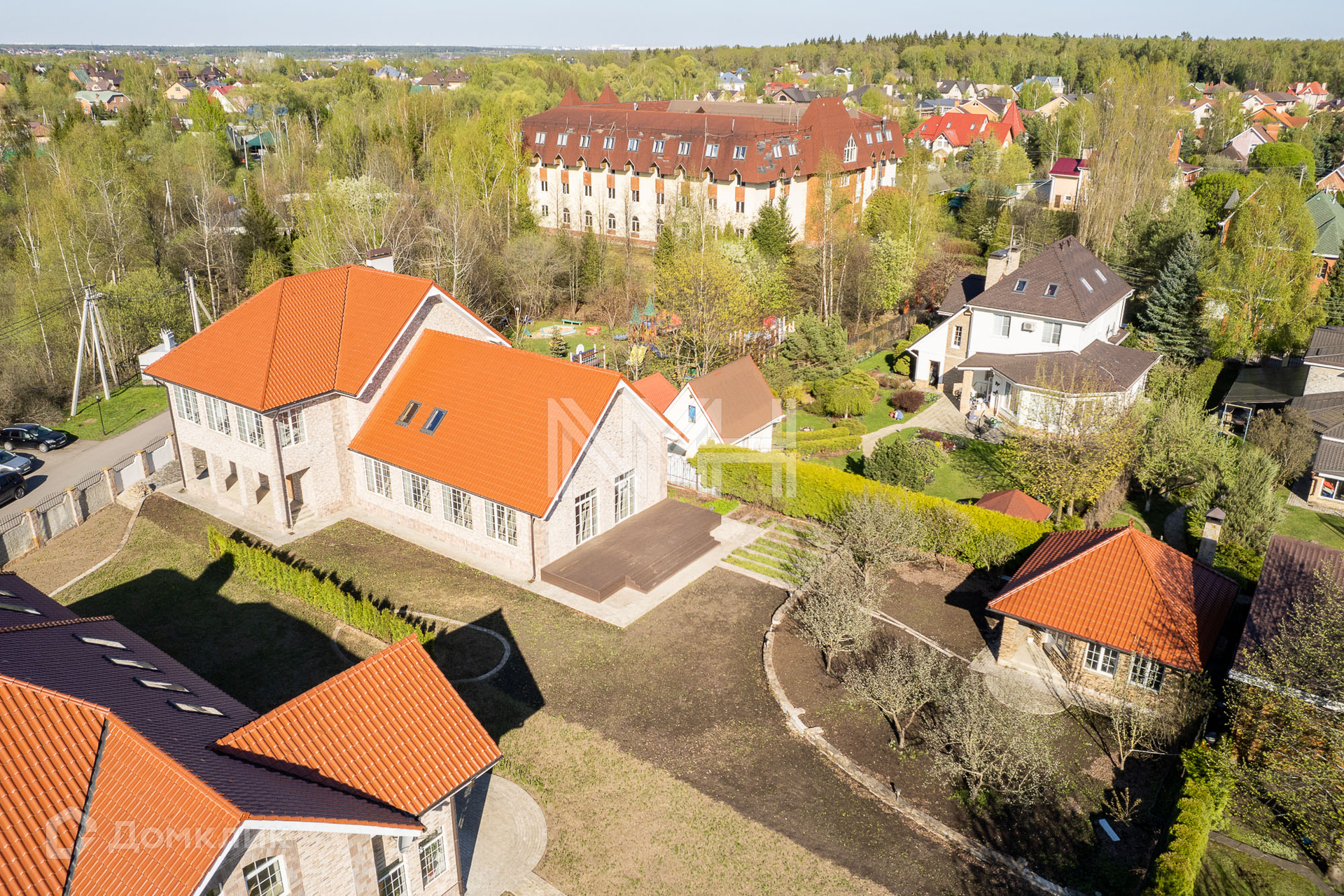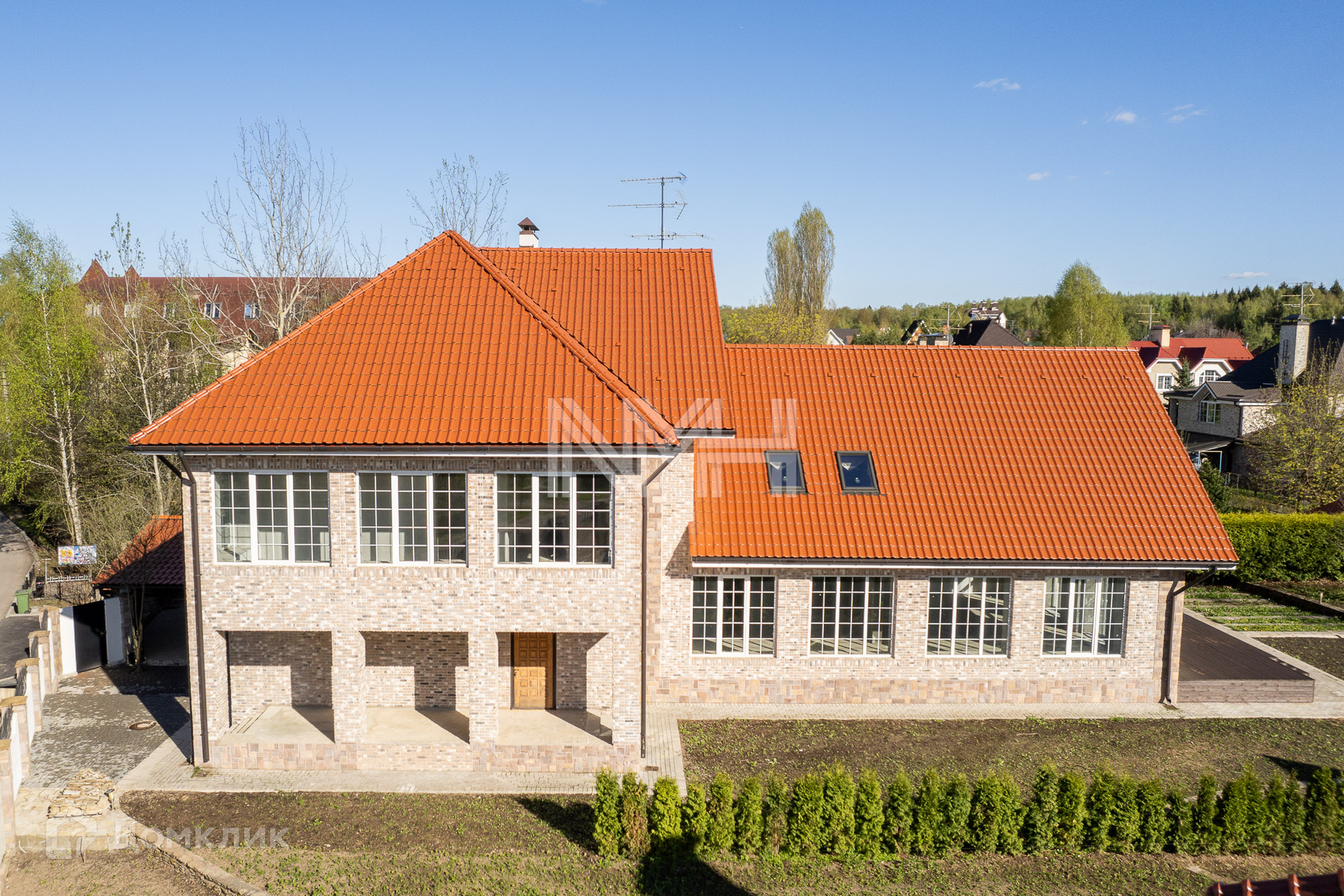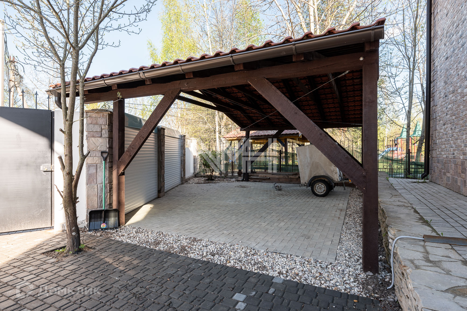 Участок 15 соток с газоном и туями. Остекленная закрытая беседка, детская площадка на соседнем участке. Дорожки и парковка вымощены брусчаткой. Участок огорожен забором на бетонном основании. Соседи все построены и живут.