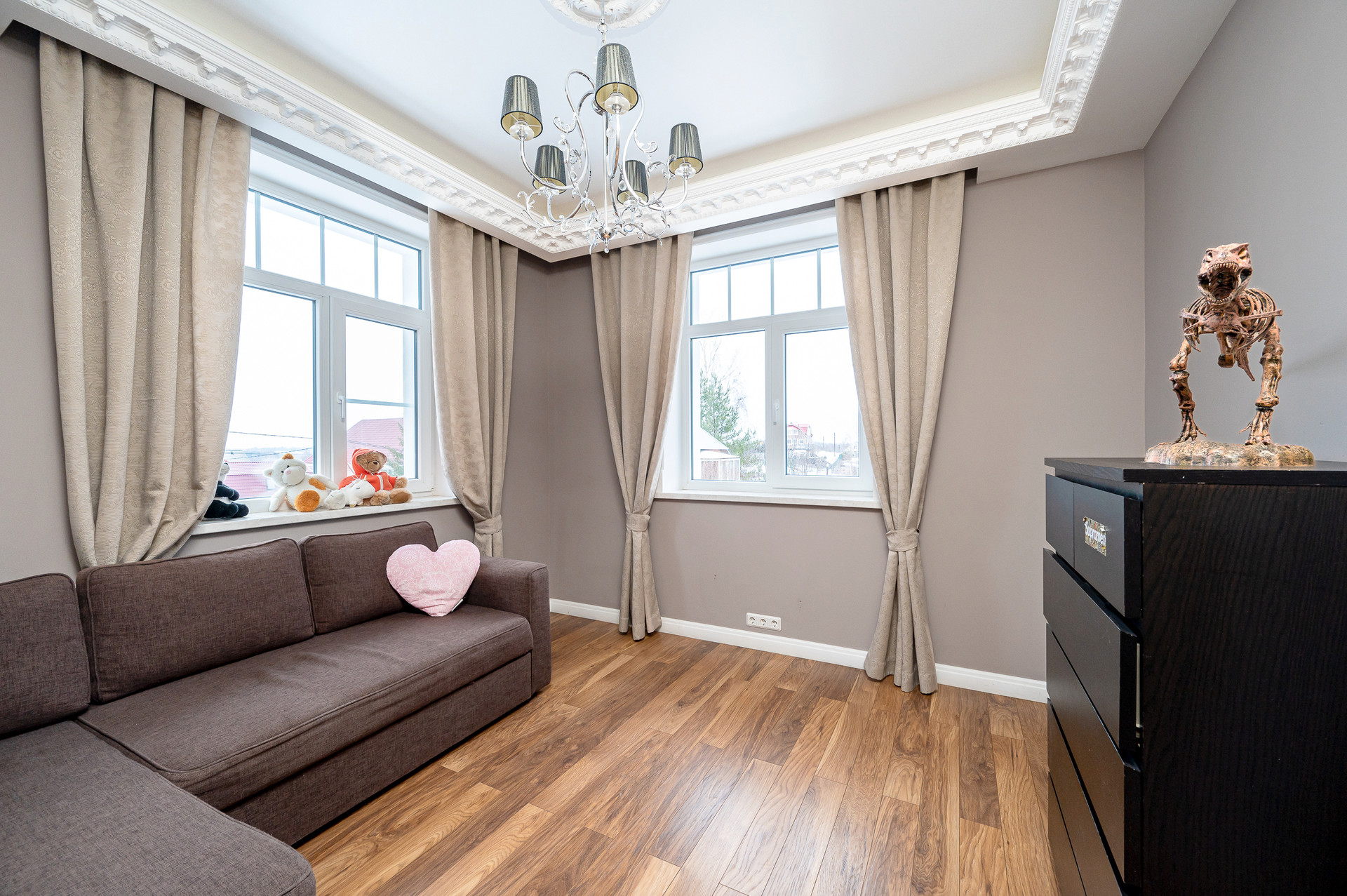 - просторная гостиная с выделенной зоной домашнего кинотеатра и эркер с панорамным окном от пола до потолка