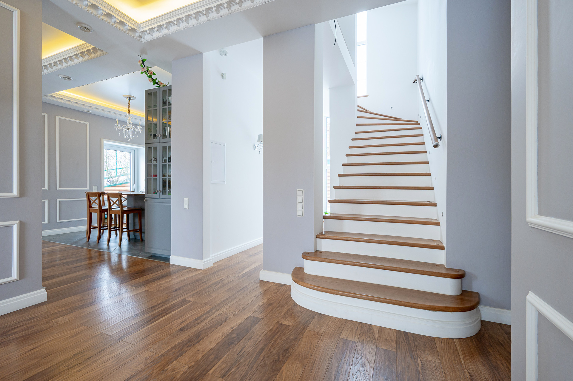 В доме активно использовано разноуровневое и зональное освещение, а так же возможность изменения цвета освещения, что позволяет создавать разные сценарии и гибко подстраивать свет под настроение и состояние жильцов.