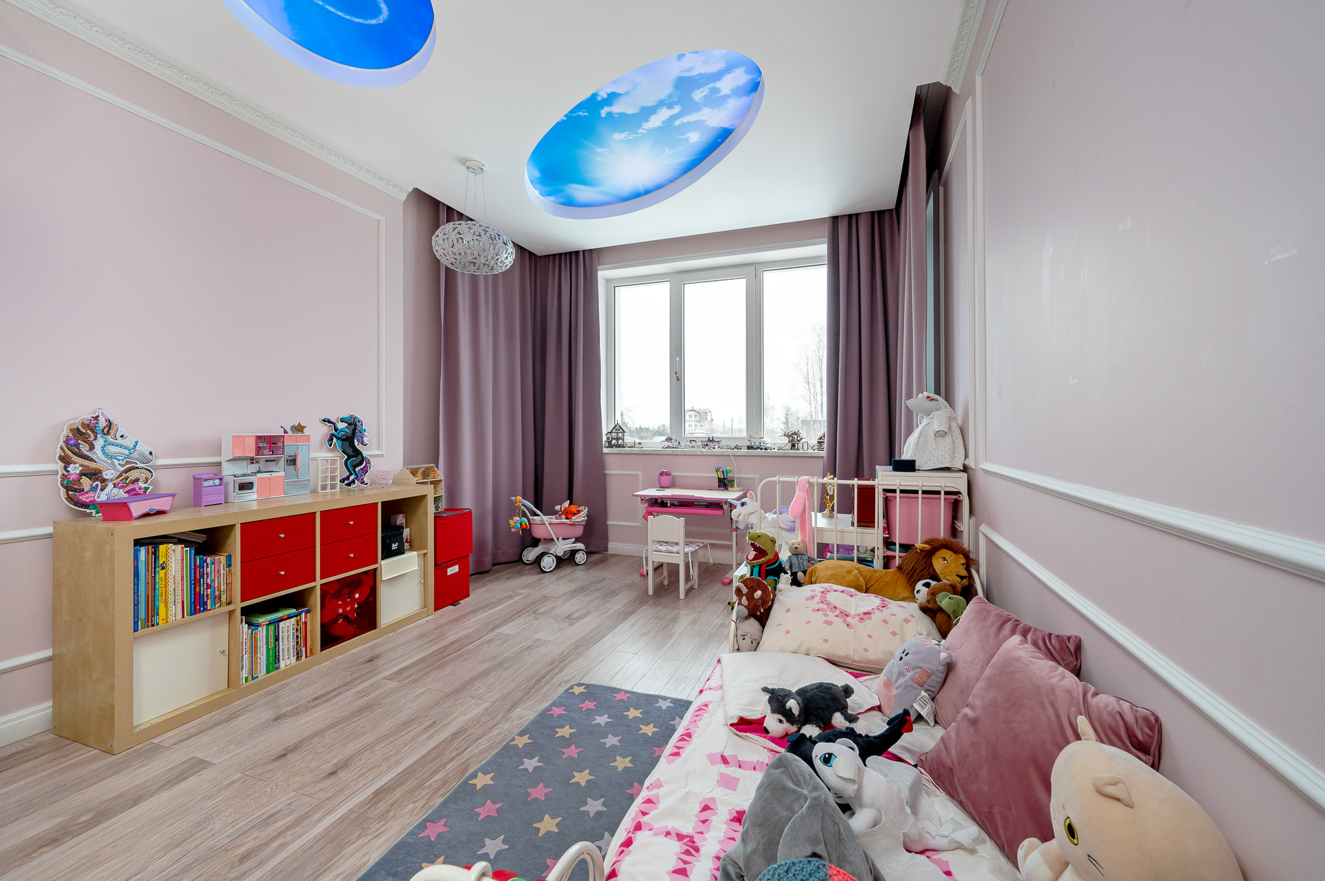 - 5 спален (1 мастер спальня с собственным санузлом и гардеробом, 3 спальни с санузлом для них, 1 гостевая спальня на отдельном этаже)