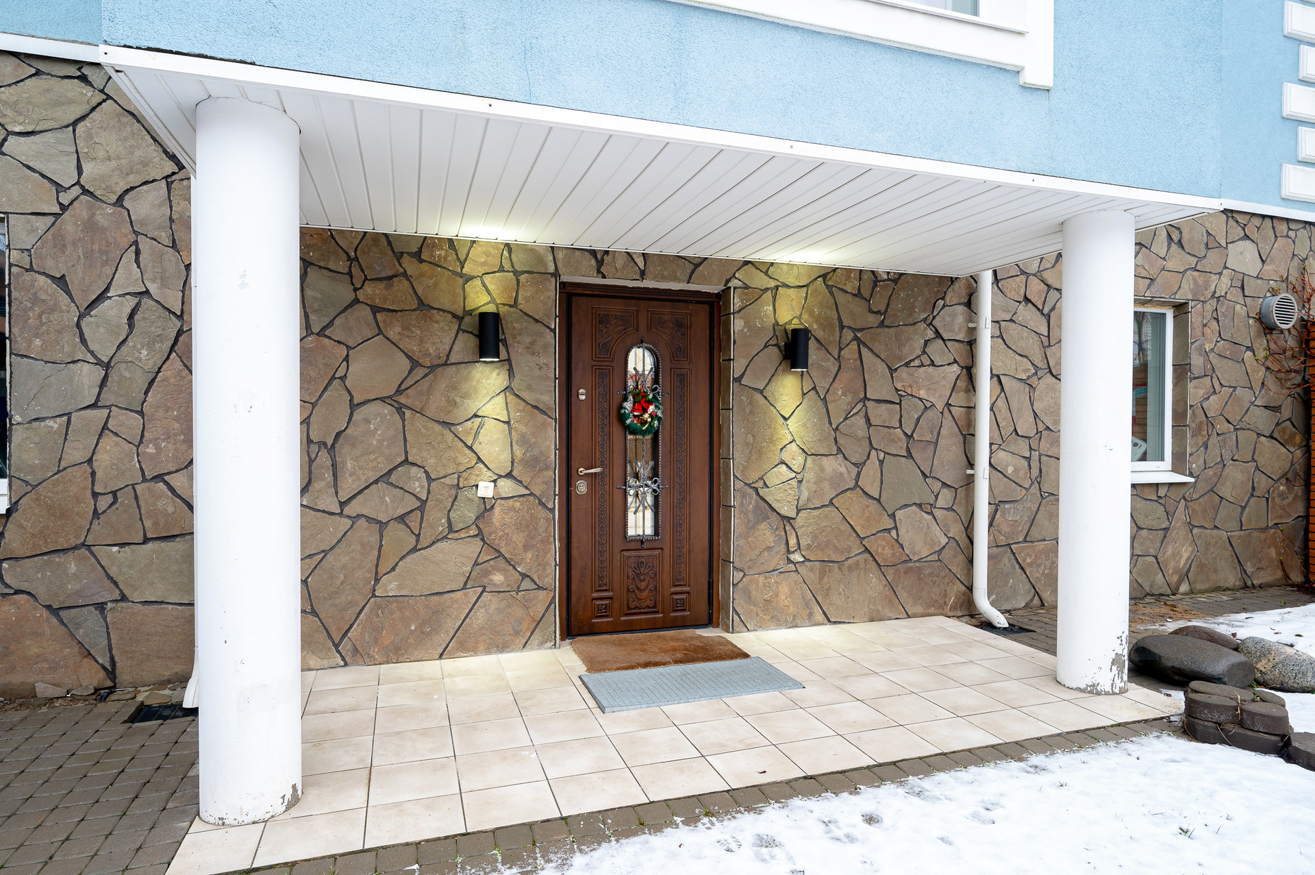 Окна и двери выполнены из 6-камерного профиля Deceuninck Favorit Space c использованием i-стёкол, что обеспечивает высокую энергоэффективность дома и минимальные затраты на его отопление.