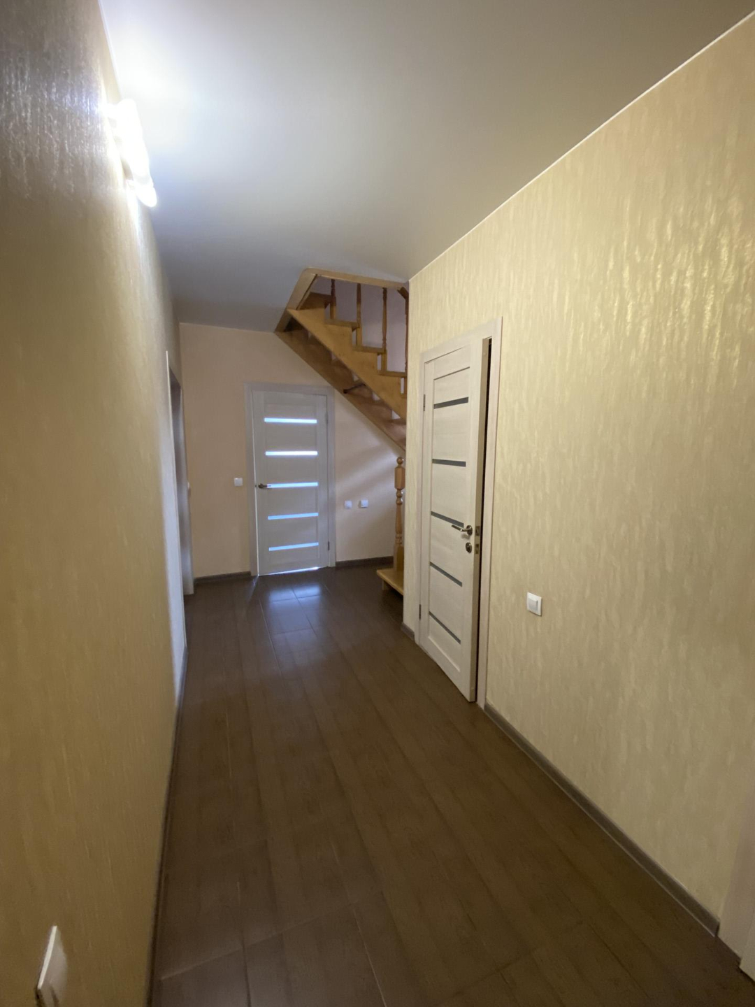 В доме на первом этаже находятся просторная кухня, большая гостиная, санузел и бойлерная (в которой установлен газовый котел BUDERUS) с выходом в гараж площадью 30 кв.м. Потолки натяжные, полы – ламинат, плитка, под плиткой – теплый пол.