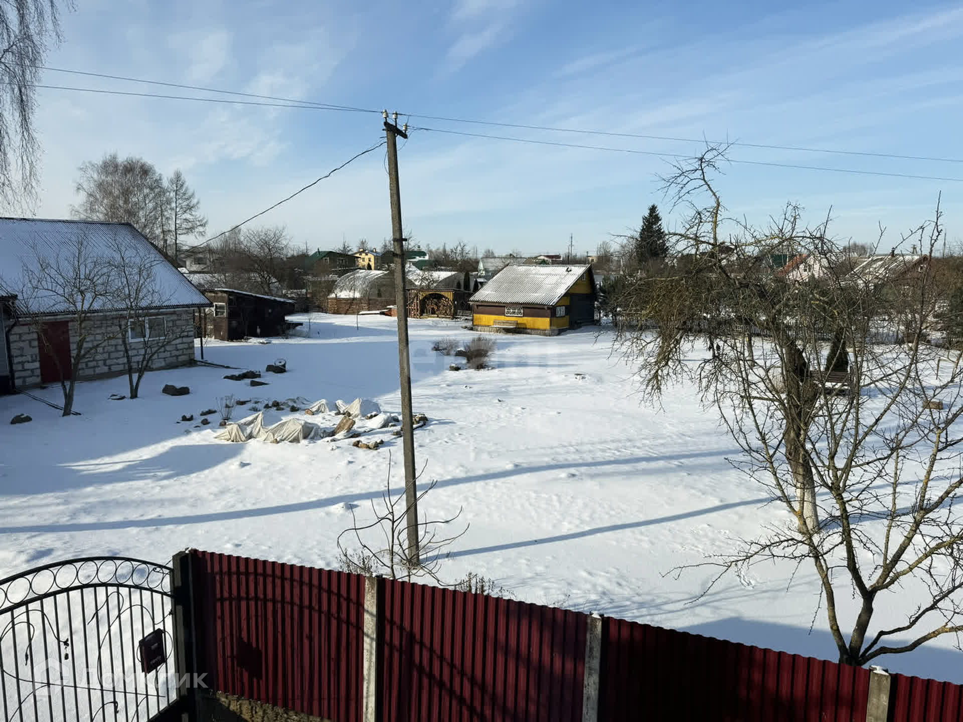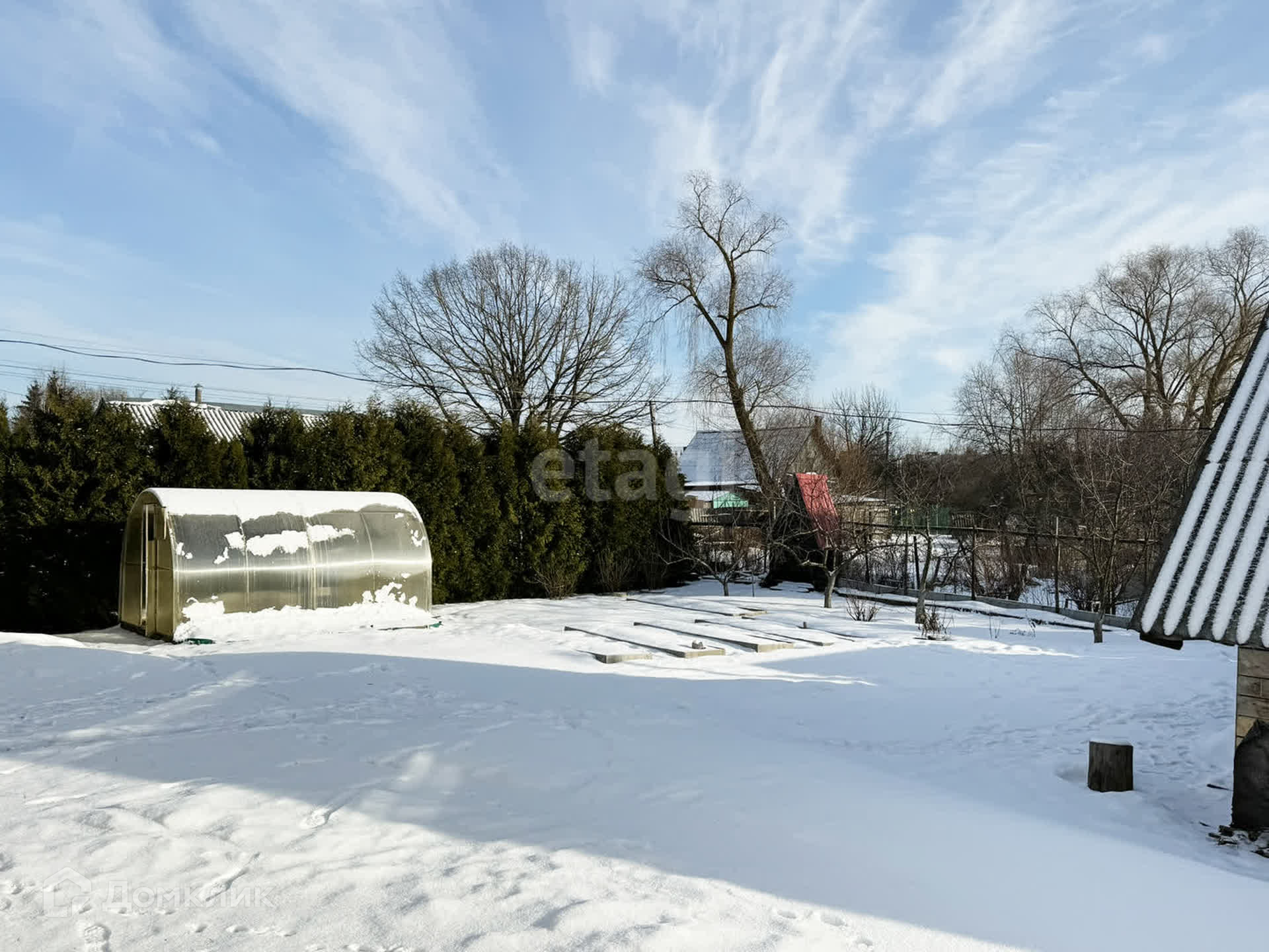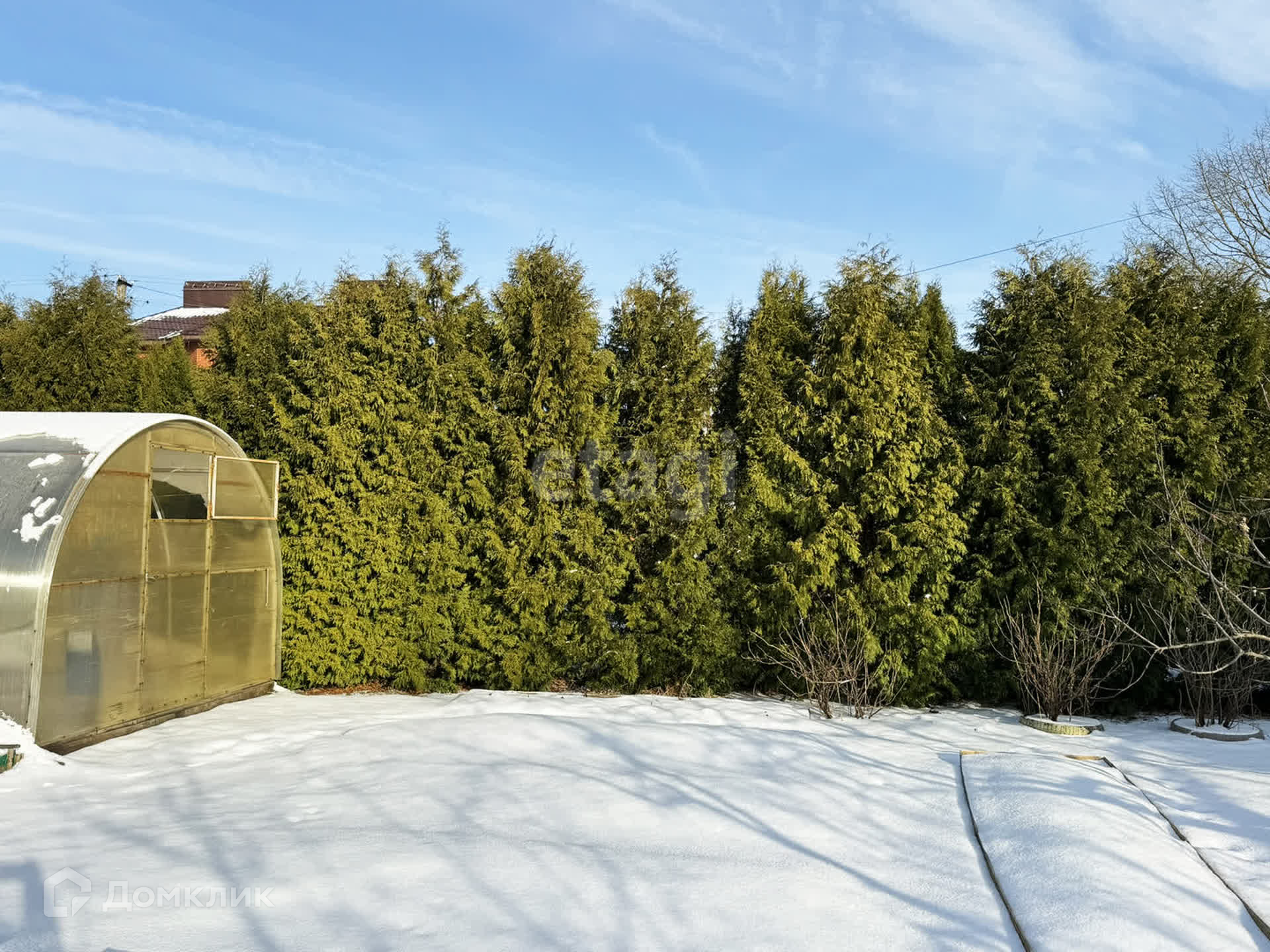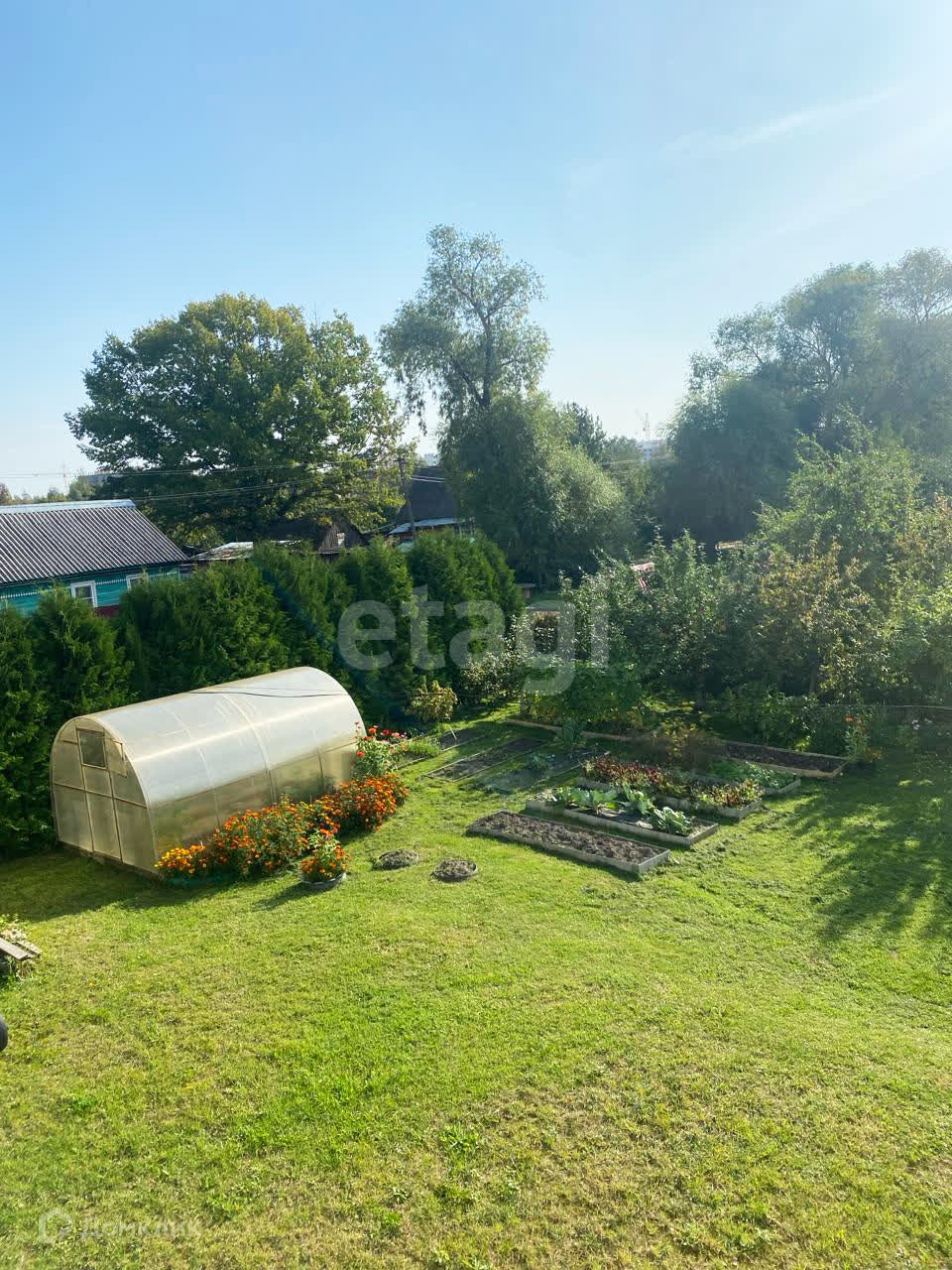 Участок 9 соток, по периметру огорожен забором из профлиста и сетки-рабицы. Участок ухоженный, имеется теплица, несколько грядок, живая изгородь из 30 туй, плодовые деревья, кустарники и цветники, газон, много места для отдыха.