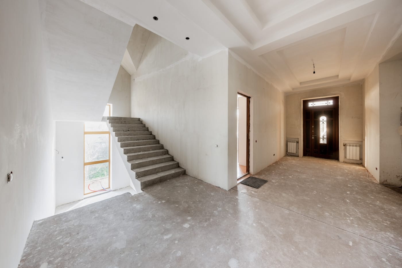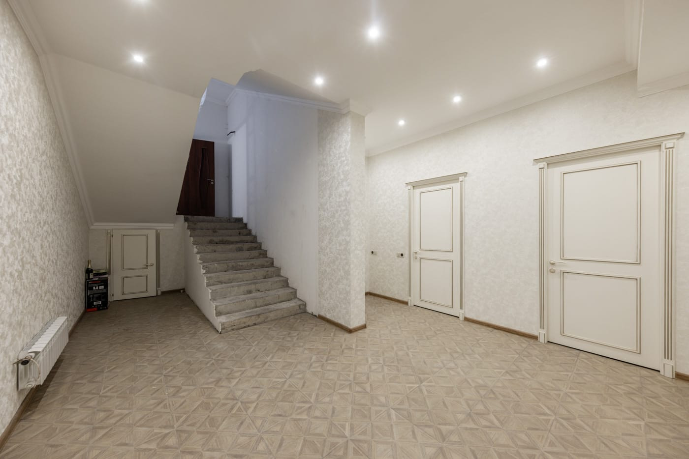 На первом этаже (состоянии WHITE BOX) располагается прихожая, холл, кухня гостиная, гостевой с/у, кабинет с с/у и гардеробной, (высота потолка первого этажа 3,3м).