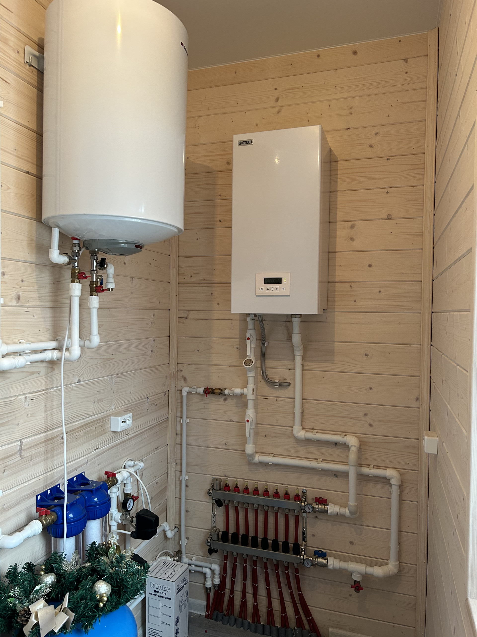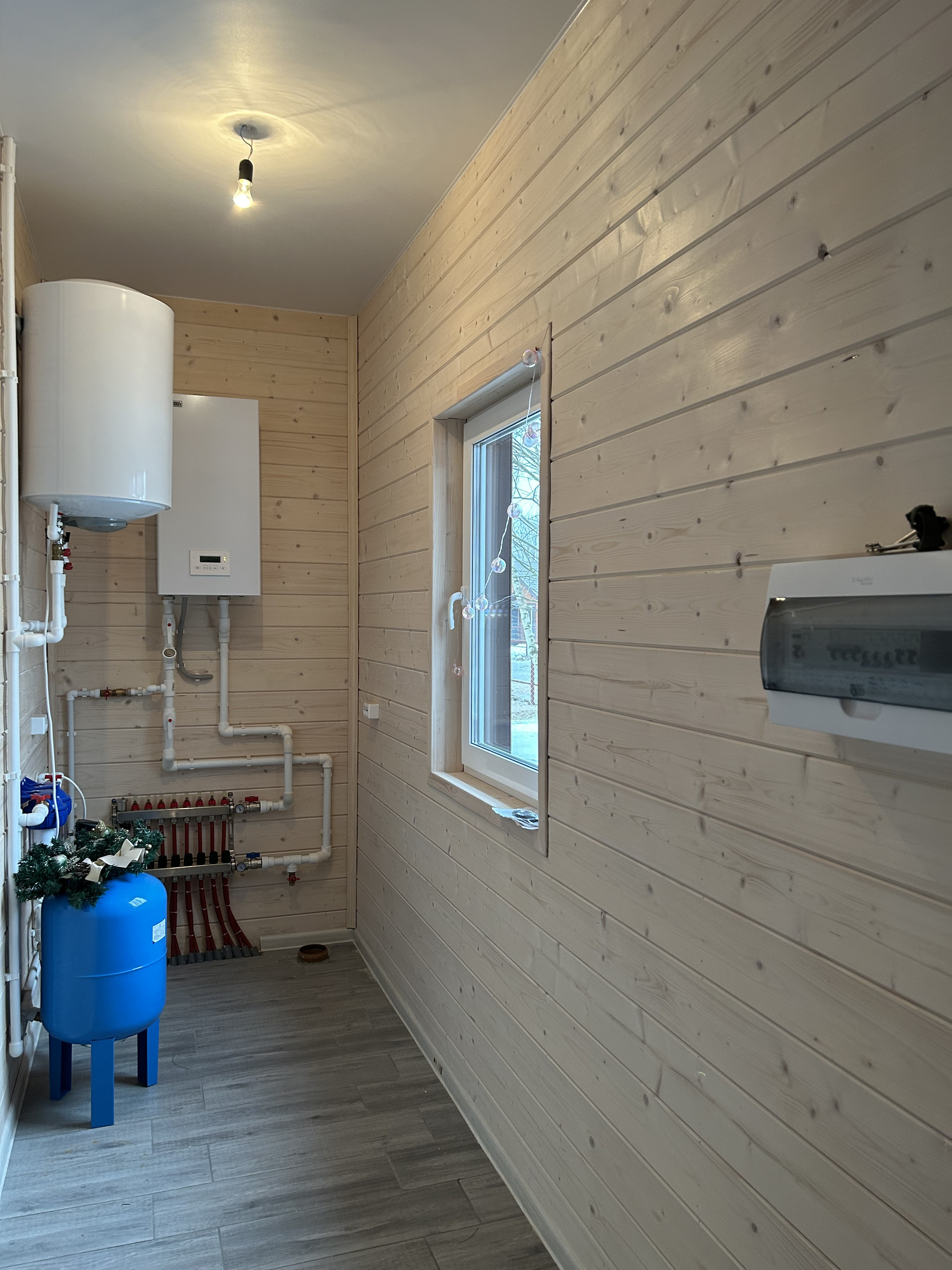 Ваш дом - полы с подогревом, потому фундамент здесь монолитная плита, которая нам позволила залить стяжку и сделать теплые полы. Сделан жидкий теплый пол, проложены трубы теплого пола сшитый полиэтилен. Экономичный расход электричества по сравнению с обычными радиаторами. Рабочая температура водяного теплого пола составляет 30-35 °С, а радиаторов 55-90 градусов, тем самым для того, чтобы котел нагнал нужную температуру в системе, ему необходимо намного меньше потреблять электричества. Ваш дом построен из бруса с дополнительным утеплением стен и кровли для зимнего проживания