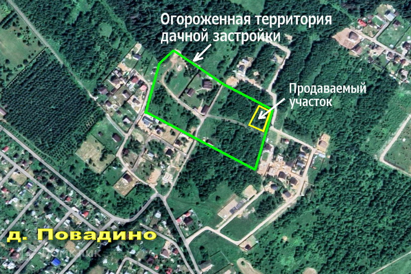 Участок расположен в огороженной дачной застройке на окраине деревни Повадино. Тихое, красивое место в окружении леса в удалении от магистральных дорог (3 км от Пятницкого шоссе).