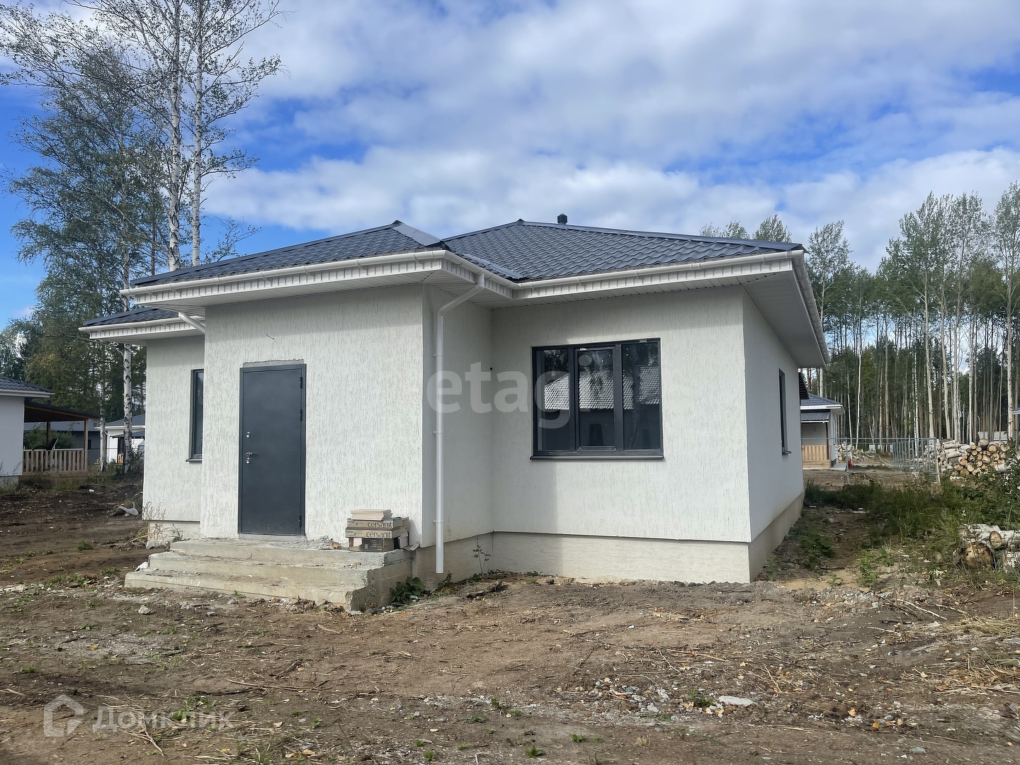 В доме выполнена, отделка под ключ: на стенах - обои, на полу ламинат, сан узле плитка, натяжные потолки. В дом можно заезжать и расставлять мебель.