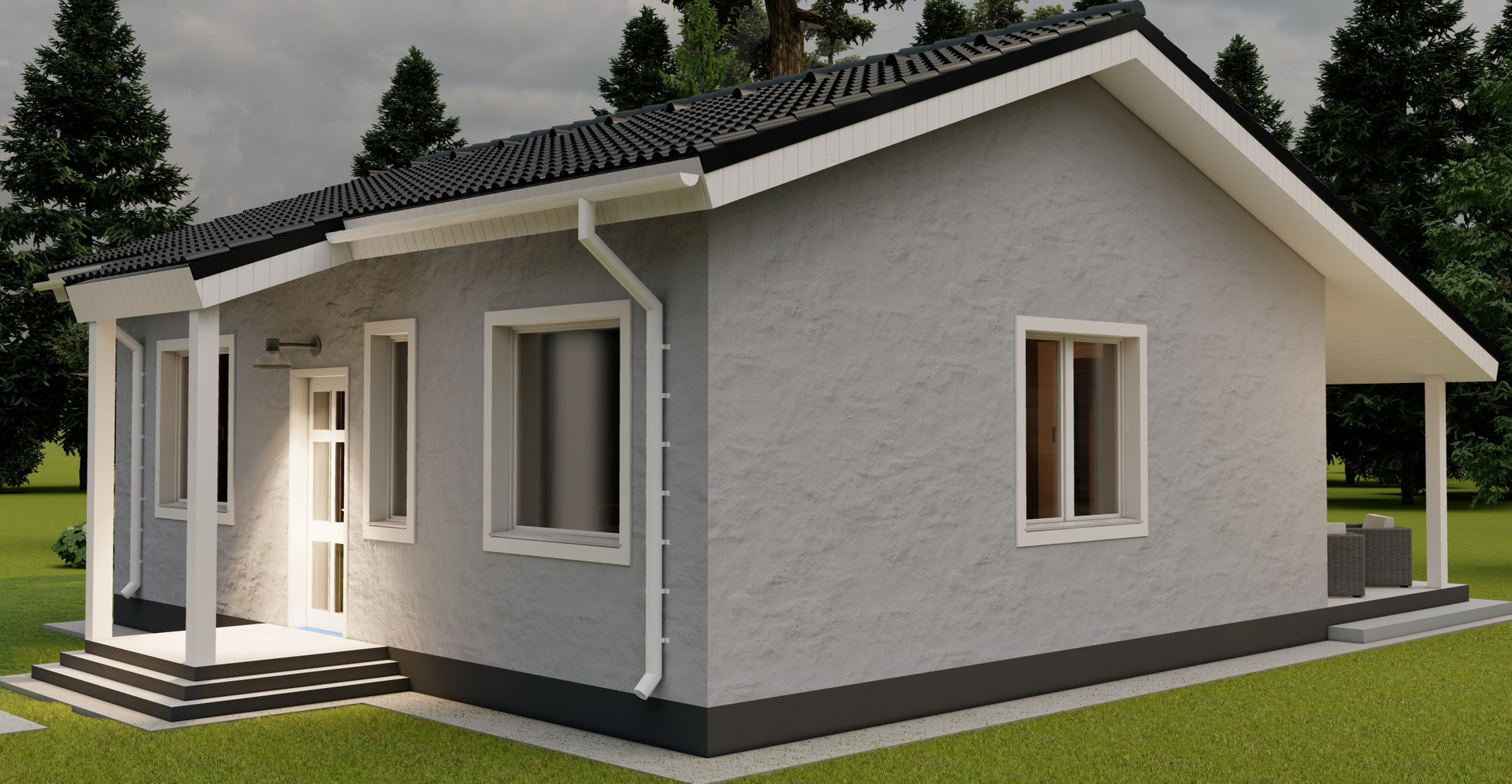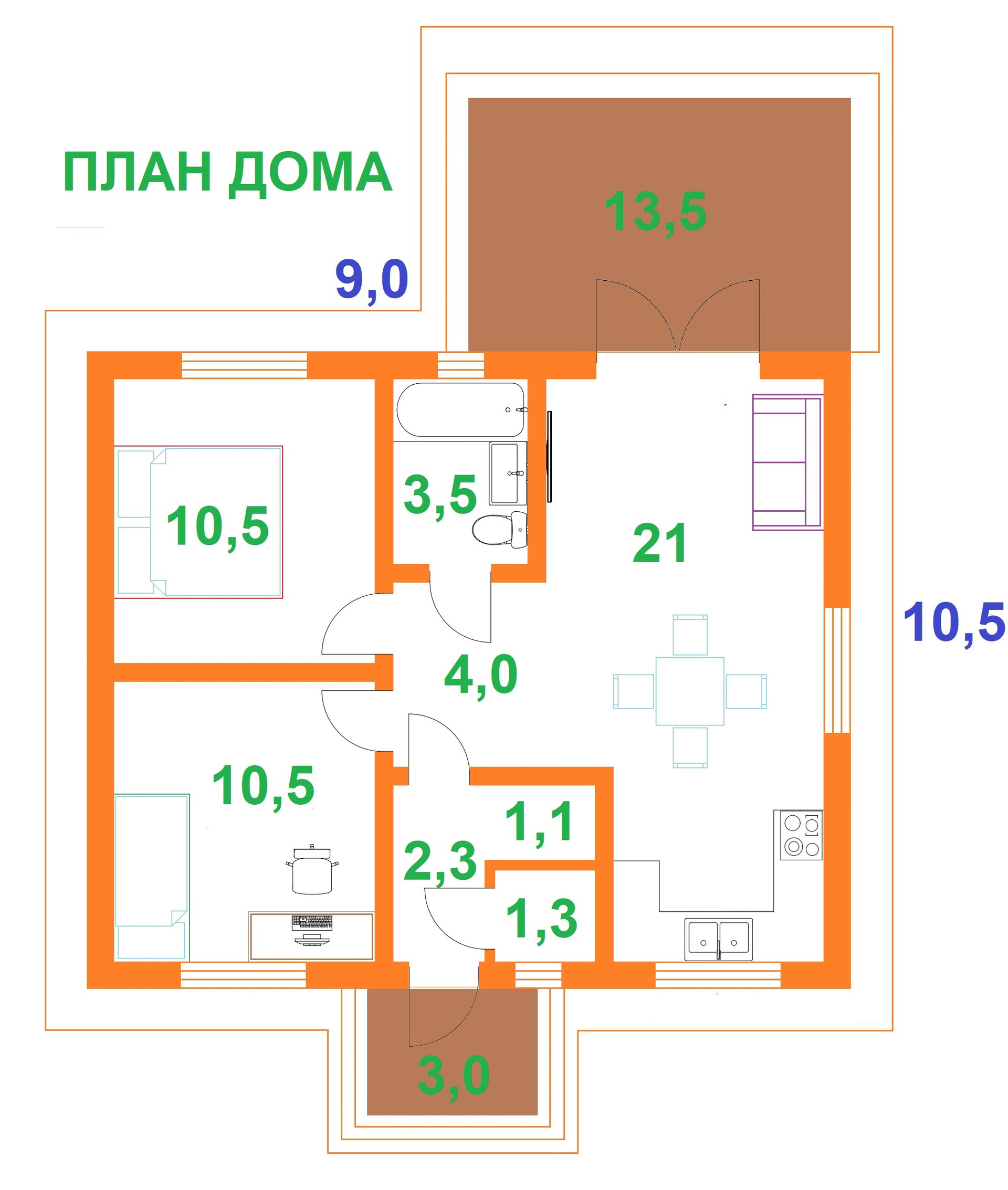 В доме 11 помещений: 3 жилых комнаты до 21 кв.м., онда из них с кухонной зоной, санузел, теплый тамбур, гардеробная, котельная, холодная кладовая, холл-коридор, крытые терраса и крыльцо