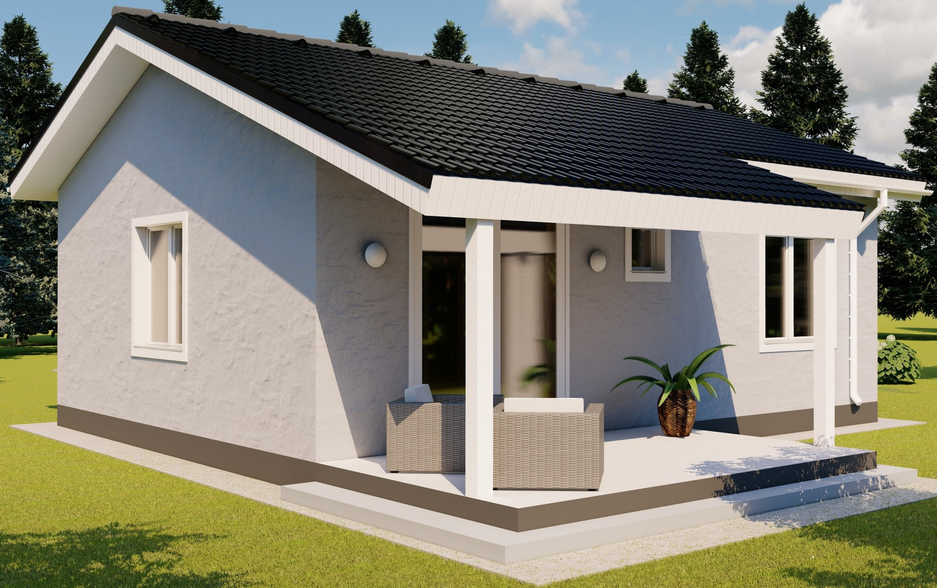 Часть окон расположено на юг, восток и запад - поэтому в доме светло и солнечно, с раннего утра до позднего вечера. В кухне-гостиной большое панорамное окно в пол с видом на поле и лес