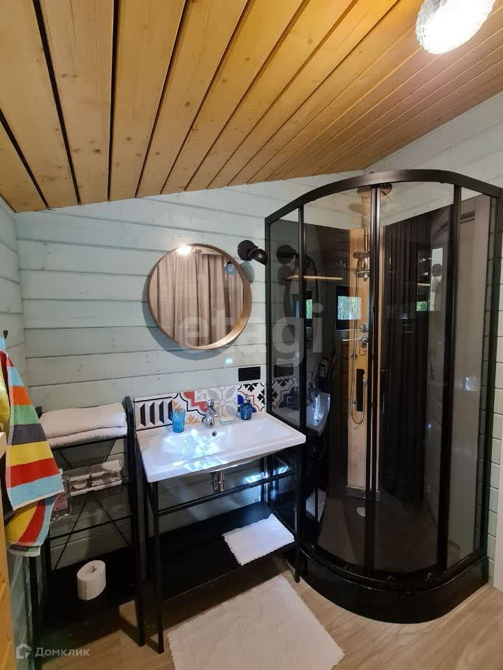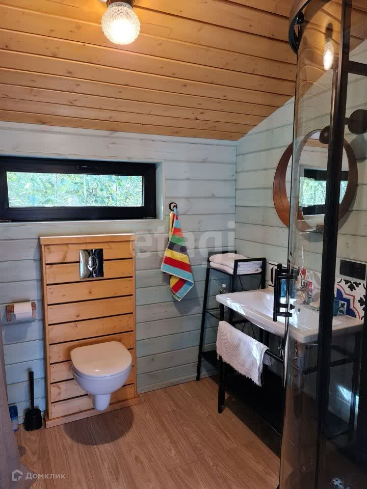 Дом отапливается печью-камином + электрическое отопление, имеется совмещенный санузел (раковина, унитаз, душевая кабина).