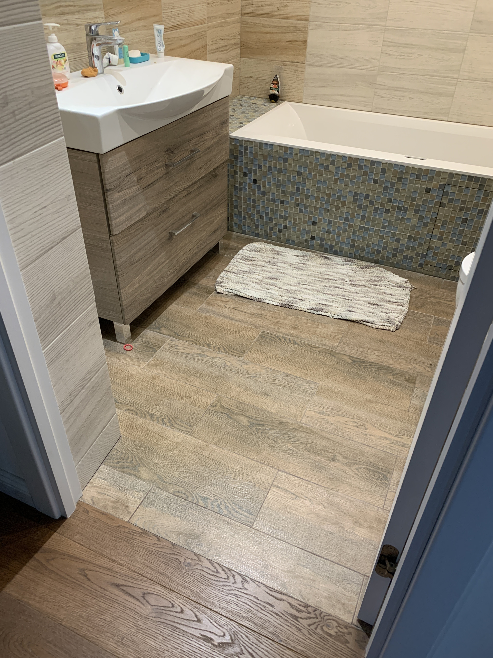 Второй этаж: керамогранит и теплый пол в санузле, дорогая инженерная доска с дубовым шпоном в комнатах и холле. В полу сделаны незаметные деформационные швы, никаких порожков.