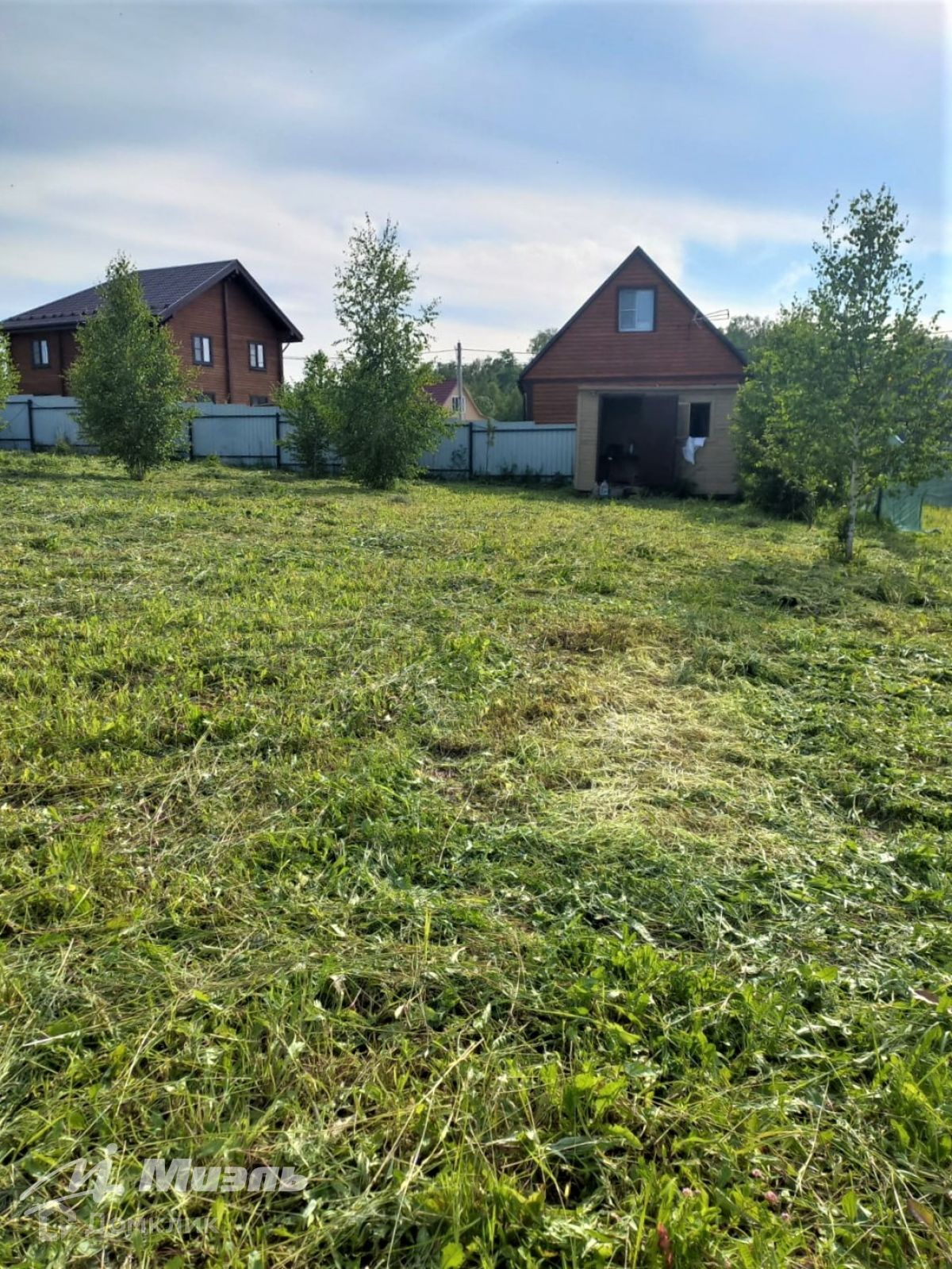На участке бытовка,2 яблони,молодые березки