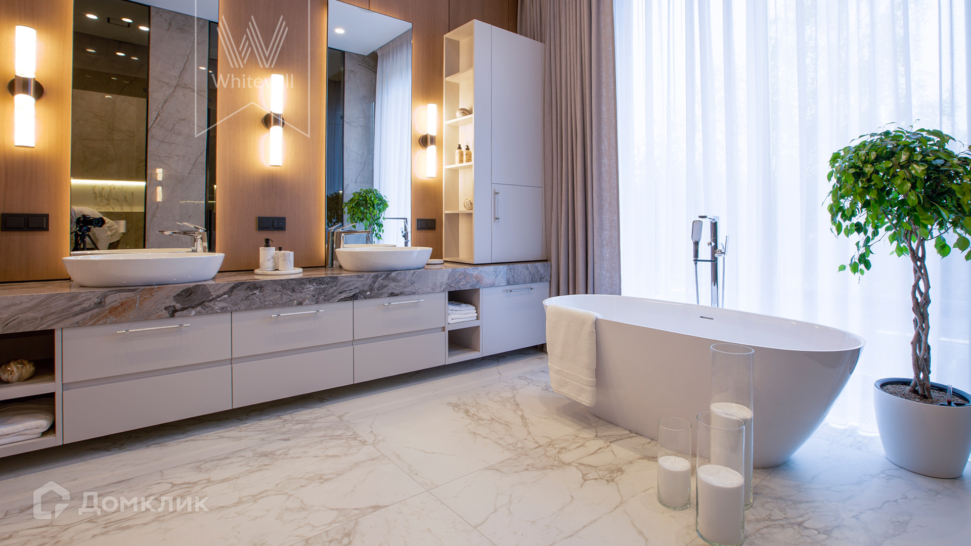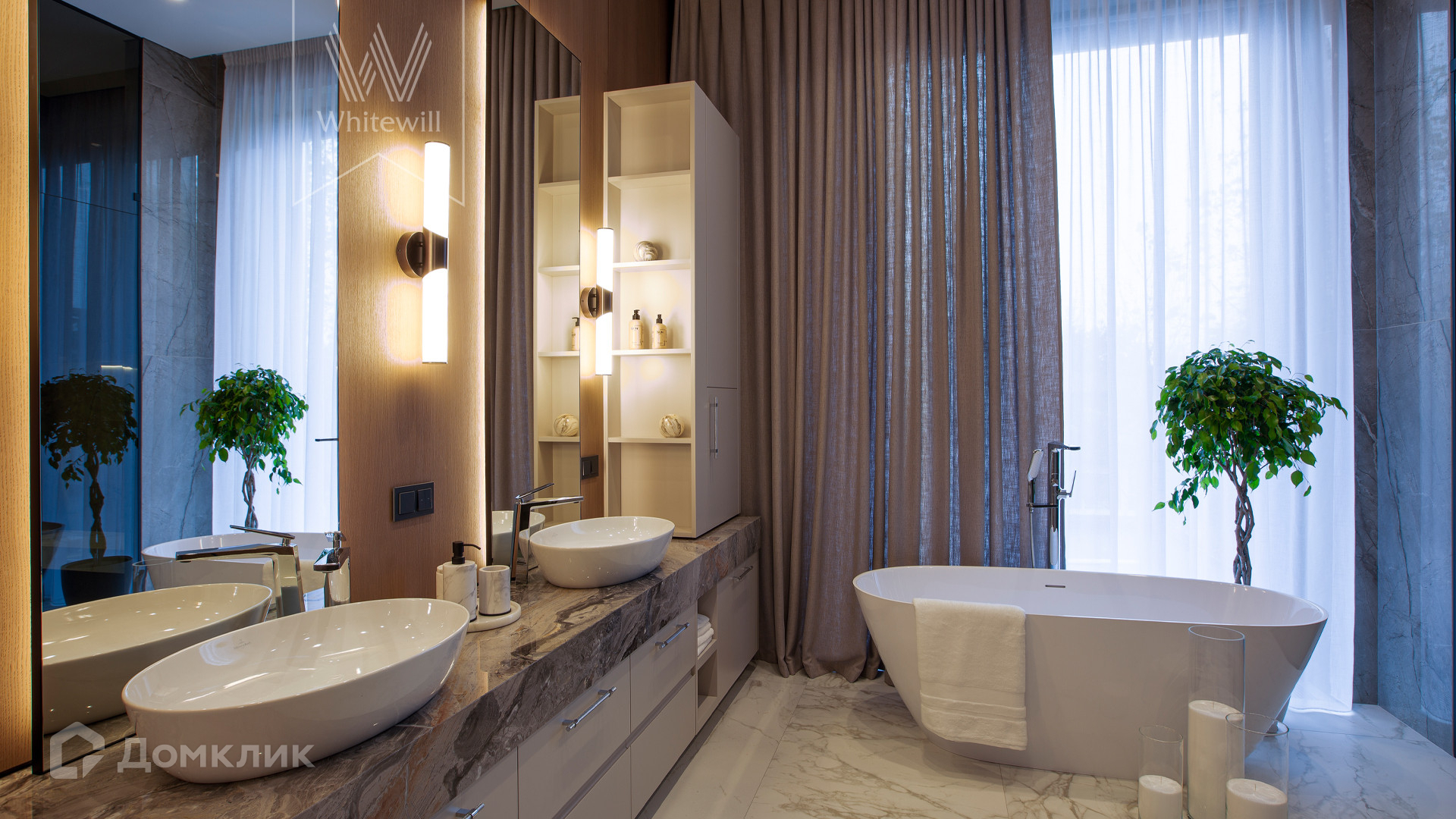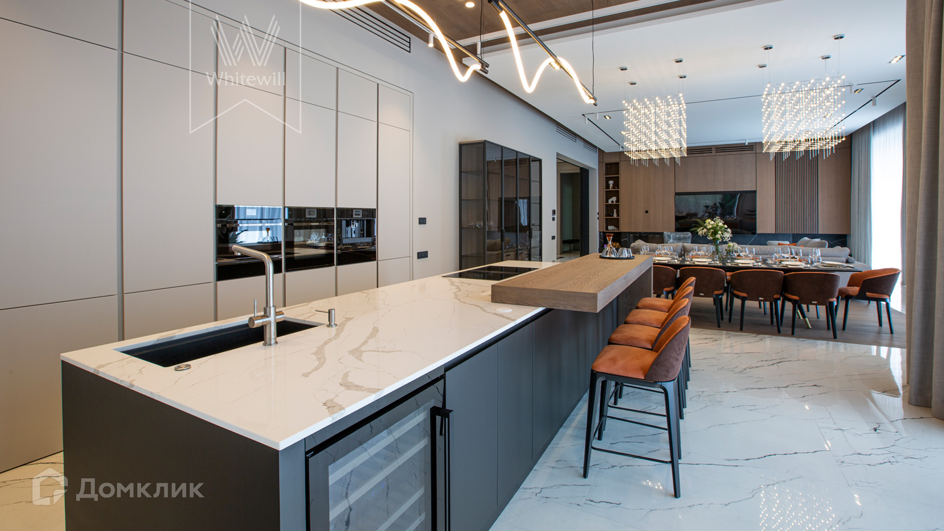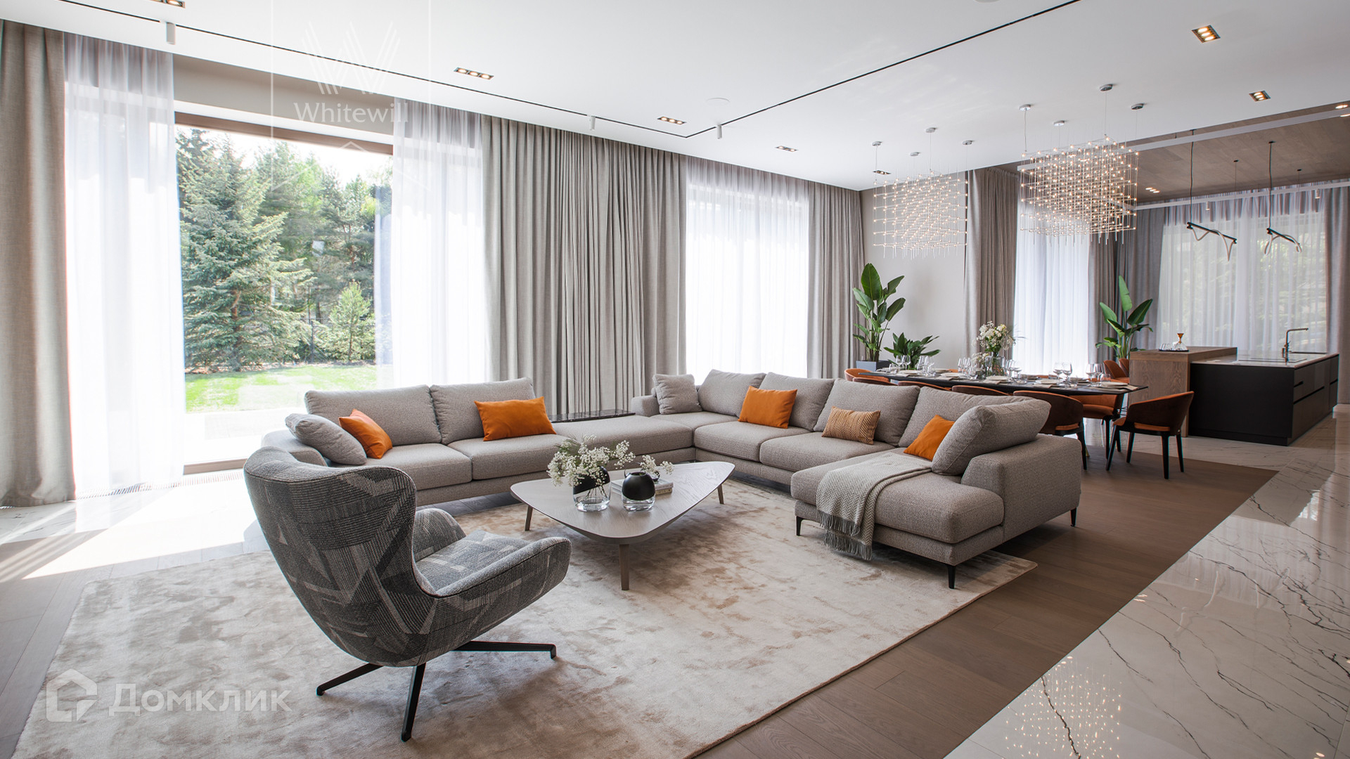 ID 11 686. Никольская слобода. Загородная резиденция площадью 910 м² построена на лесном участке 21,5 сотки. Светлый фасад с большими окнами выполнен в современном стиле, облицован гранитом, известняком, керамогранитом и планкеном из ясеня. В отделке интерьера использованы инженерная доска Coswick, мрамор, плитка, сантехника Timo, Boheme, светильники Arlight, Gauss, FIUME. Дом укомплектован гардеробными и встроенными шкафами, кухонным гарнитуром с бытовой техникой Kuppersbusch, Miele, Gaggenau. В планировке предусмотрены 5 спален с ванными комнатами, просторная гостиная с камином, кухня-столовая, SPA-зона с бассейном и сауной, гараж на 2 машины. На участке выполнен ландшафтный дизайн, перед домом организована парковка на 3 машины, вымощены дорожки, установлено освещение.