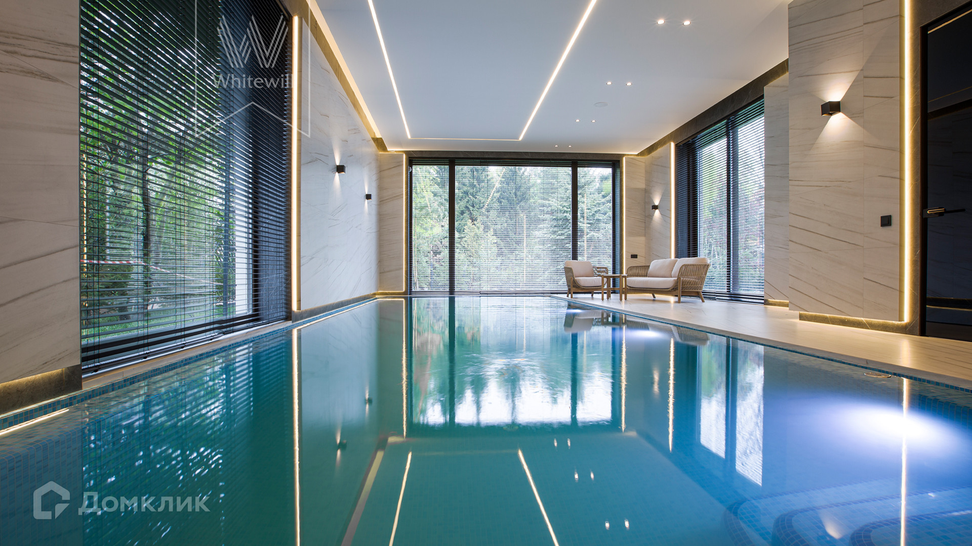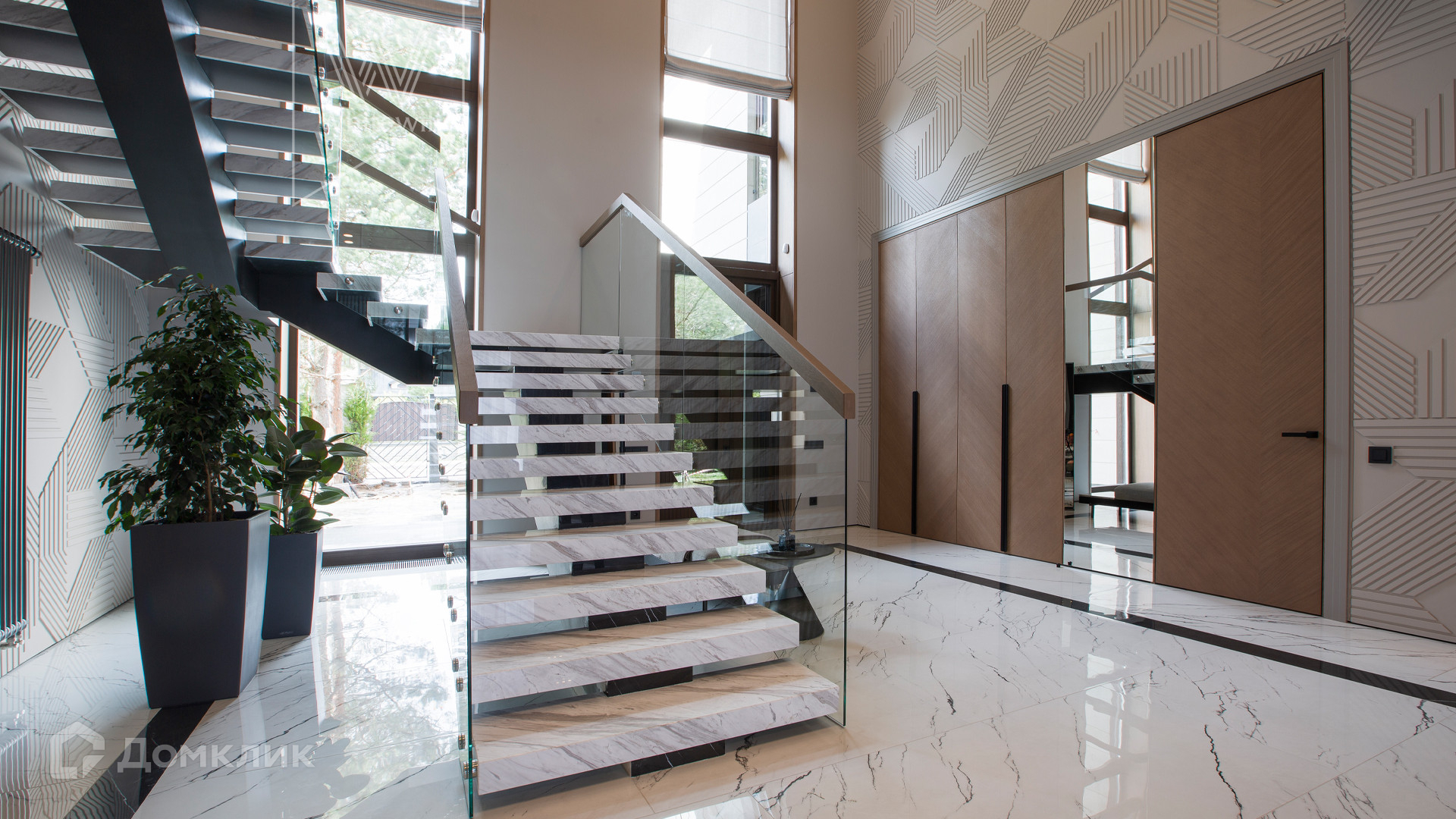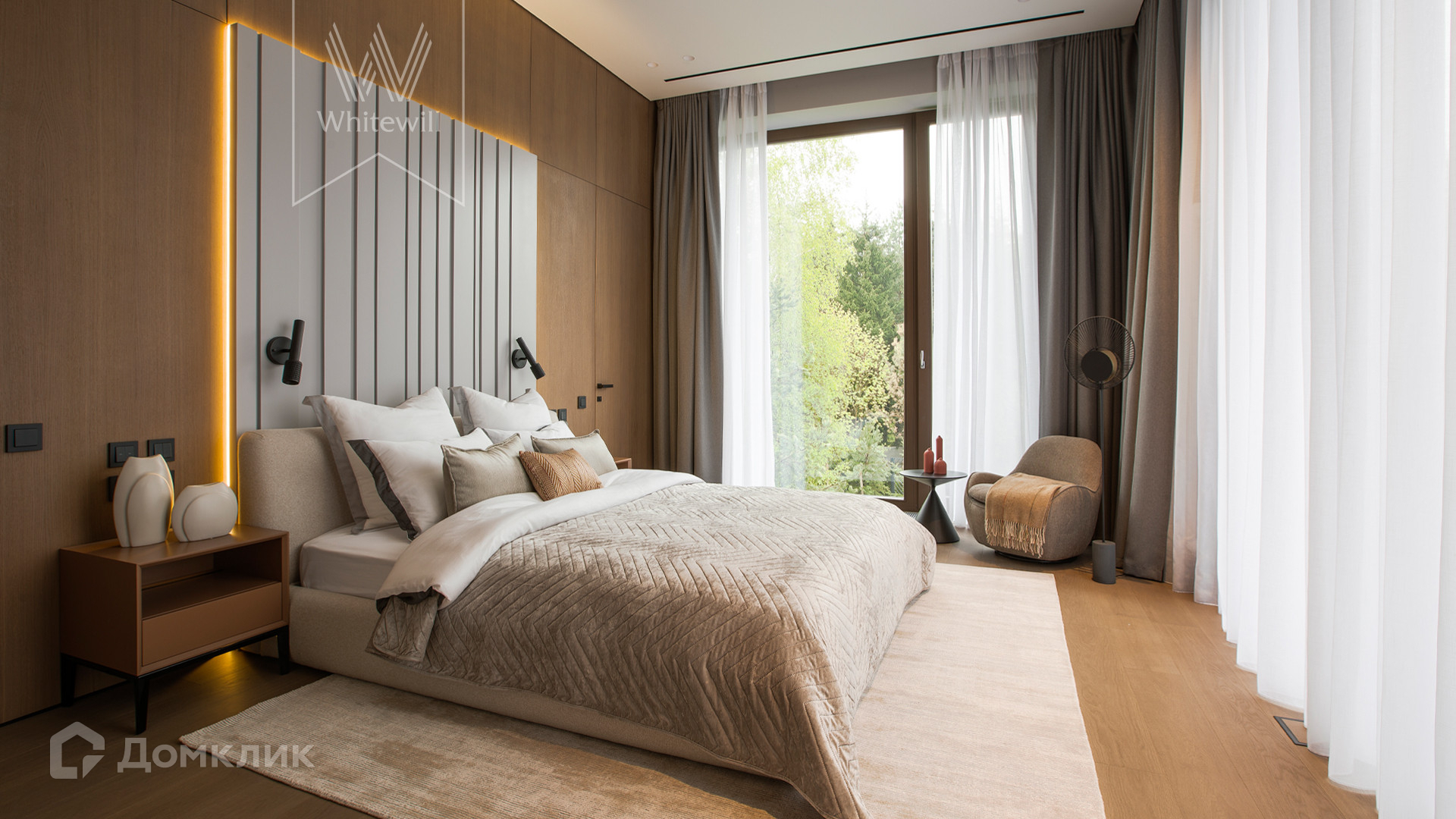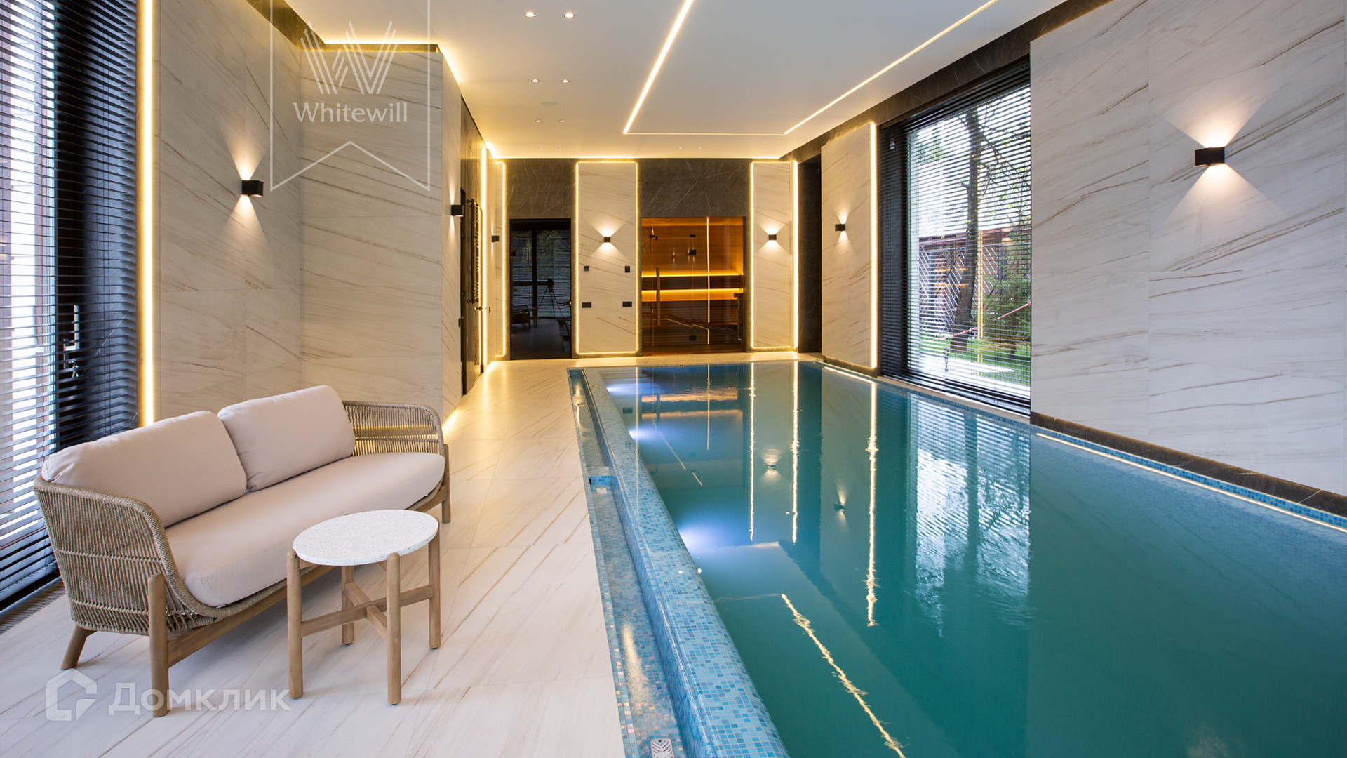 ID 11 686. Никольская слобода. Загородная резиденция площадью 910 м² построена на лесном участке 21,5 сотки. Светлый фасад с большими окнами выполнен в современном стиле, облицован гранитом, известняком, керамогранитом и планкеном из ясеня. В отделке интерьера использованы инженерная доска Coswick, мрамор, плитка, сантехника Timo, Boheme, светильники Arlight, Gauss, FIUME. Дом укомплектован гардеробными и встроенными шкафами, кухонным гарнитуром с бытовой техникой Kuppersbusch, Miele, Gaggenau. В планировке предусмотрены 5 спален с ванными комнатами, просторная гостиная с камином, кухня-столовая, SPA-зона с бассейном и сауной, гараж на 2 машины. На участке выполнен ландшафтный дизайн, перед домом организована парковка на 3 машины, вымощены дорожки, установлено освещение.