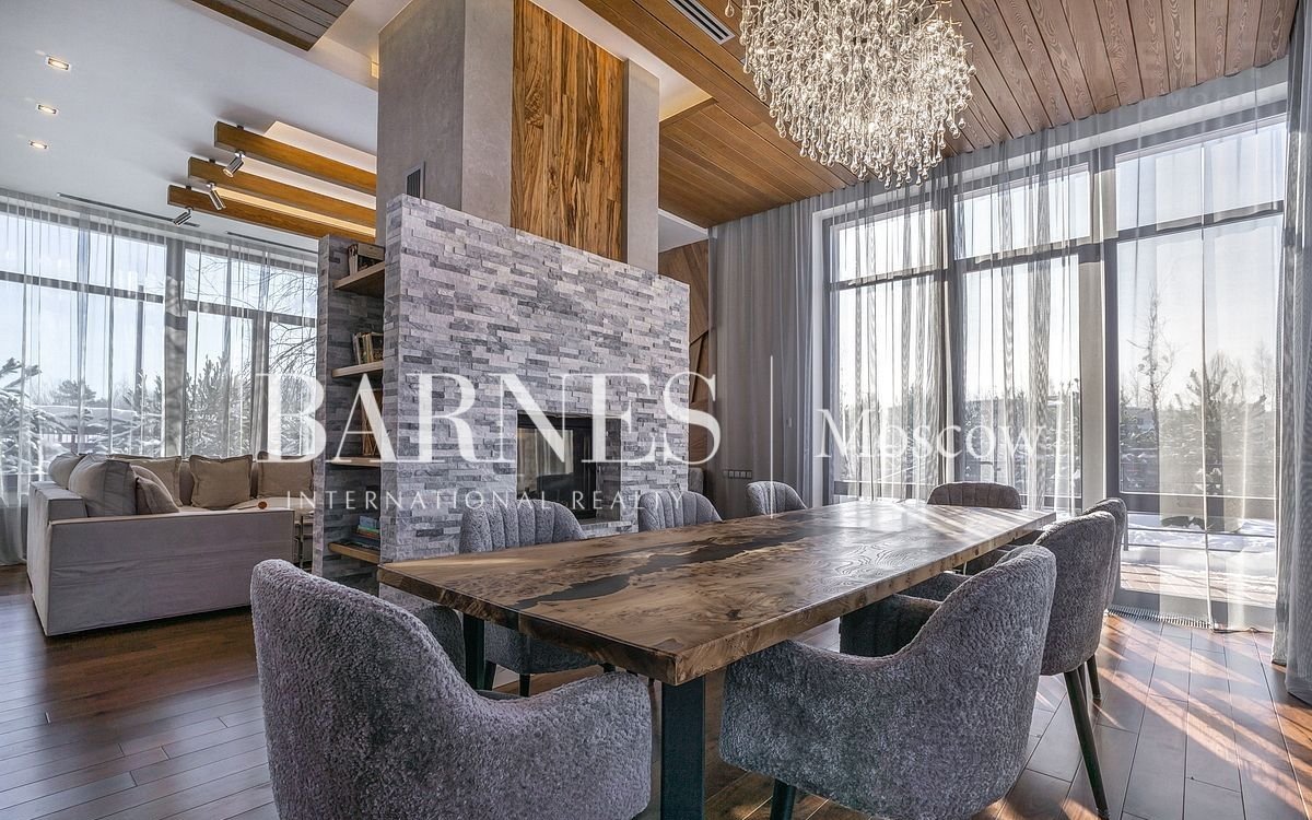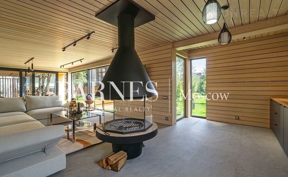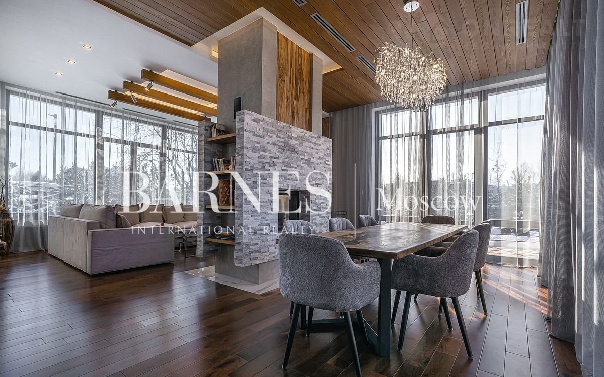 Внутренняя отделка выполнена из дорогостоящих материалов: полы массив американского ореха, стеновые панели из ореха и дуба с подсветкой, отделка камина натуральный камень, французский камин suрrа, крупноформатный современный керамогранит.