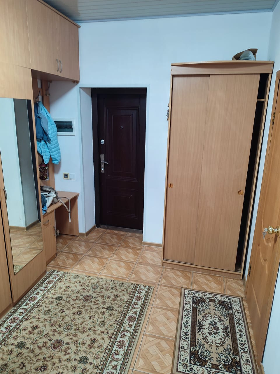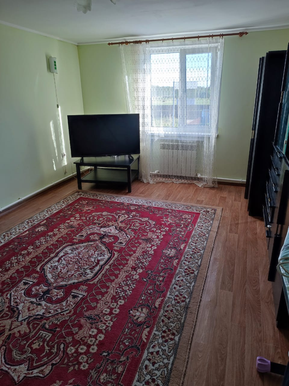 На 1ом этаже санузел с душевой кабиной, просторной кухней, огромный вместительный зал, спальная комната. На полу плитка (санузел, прихожая, кухня)