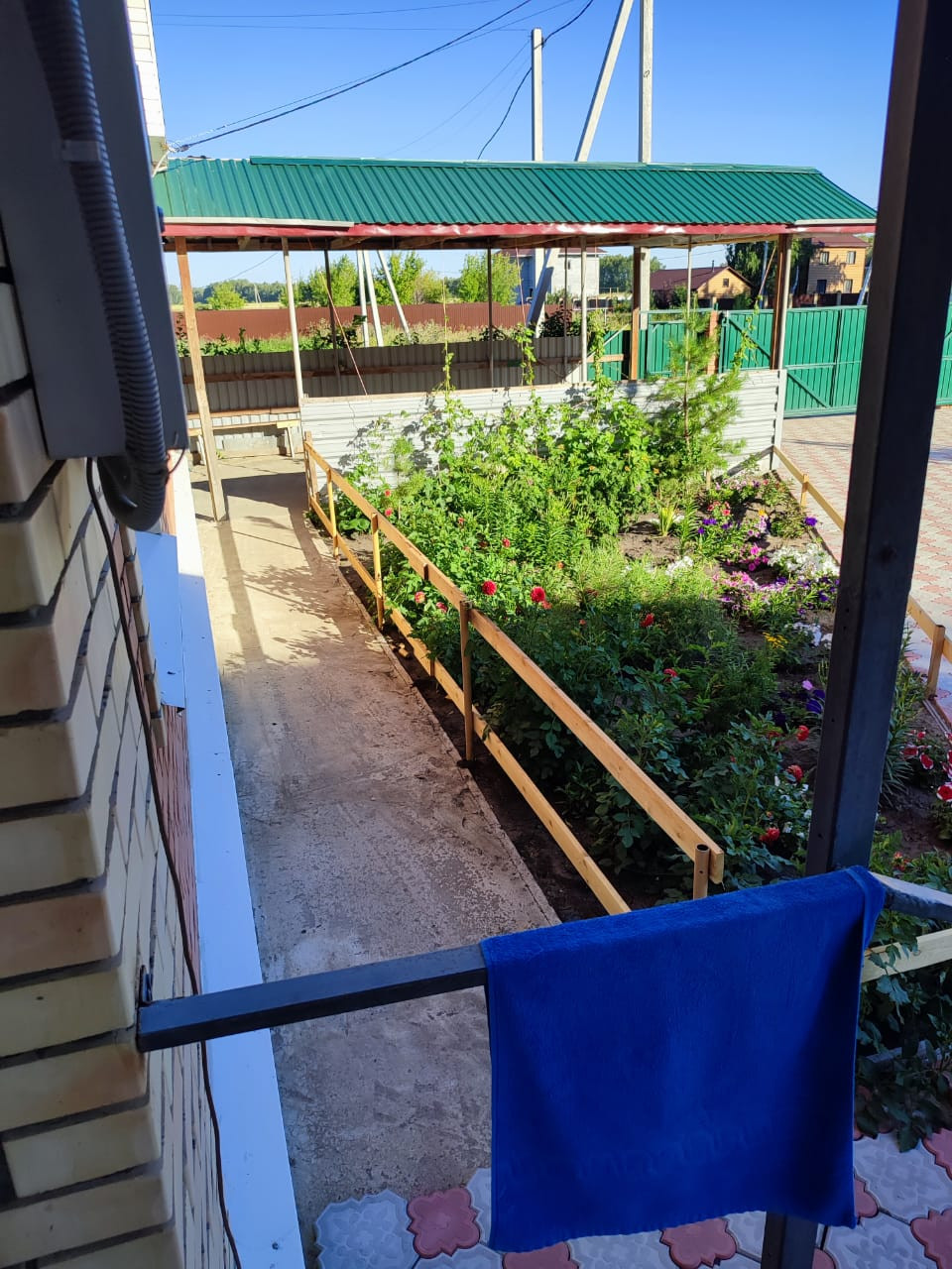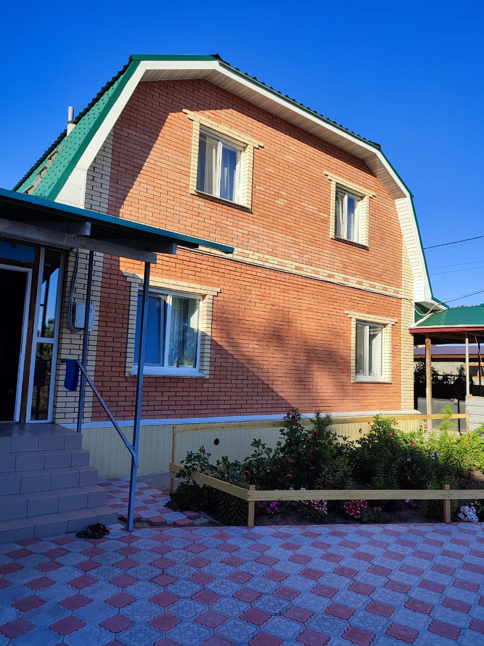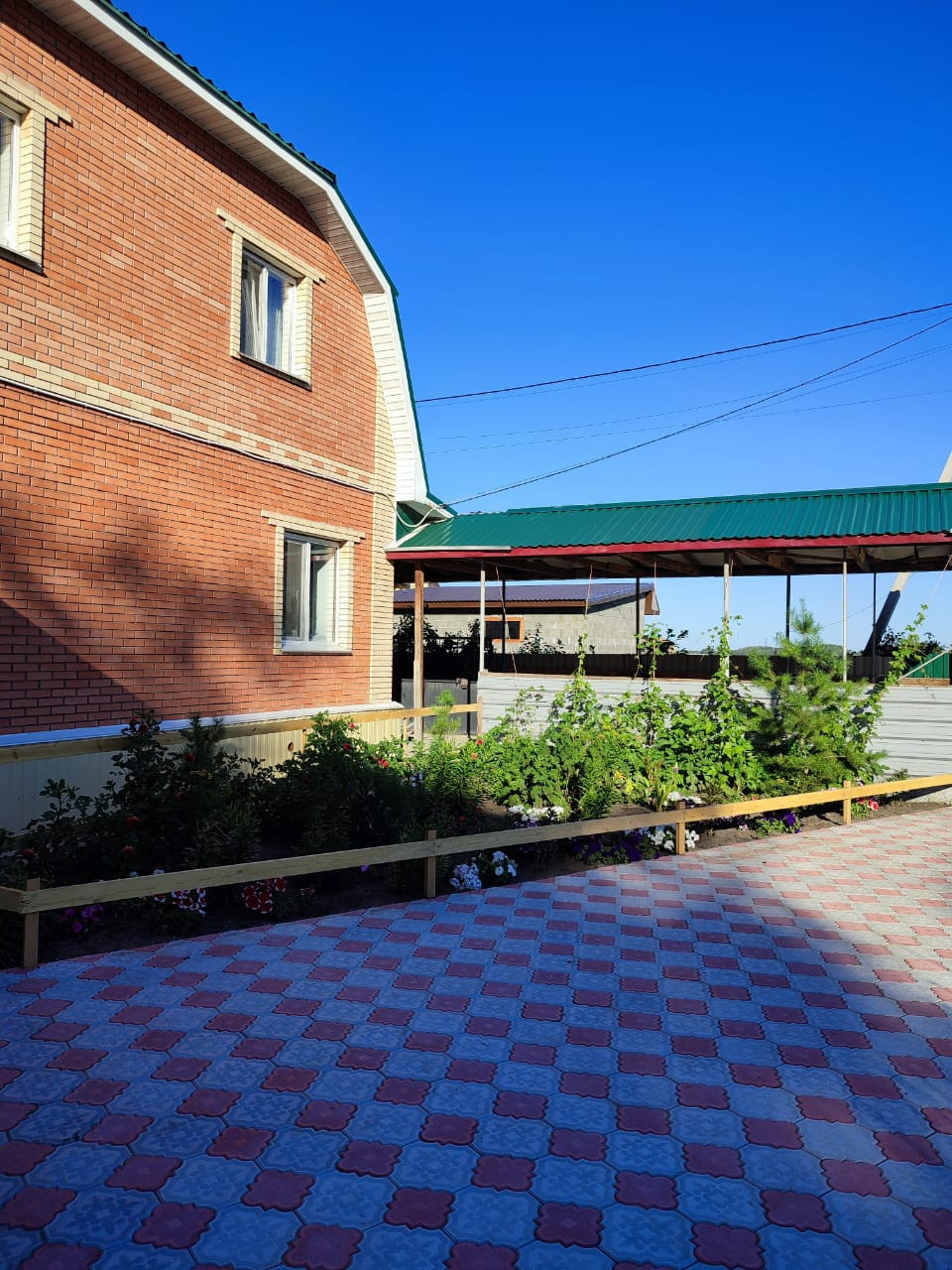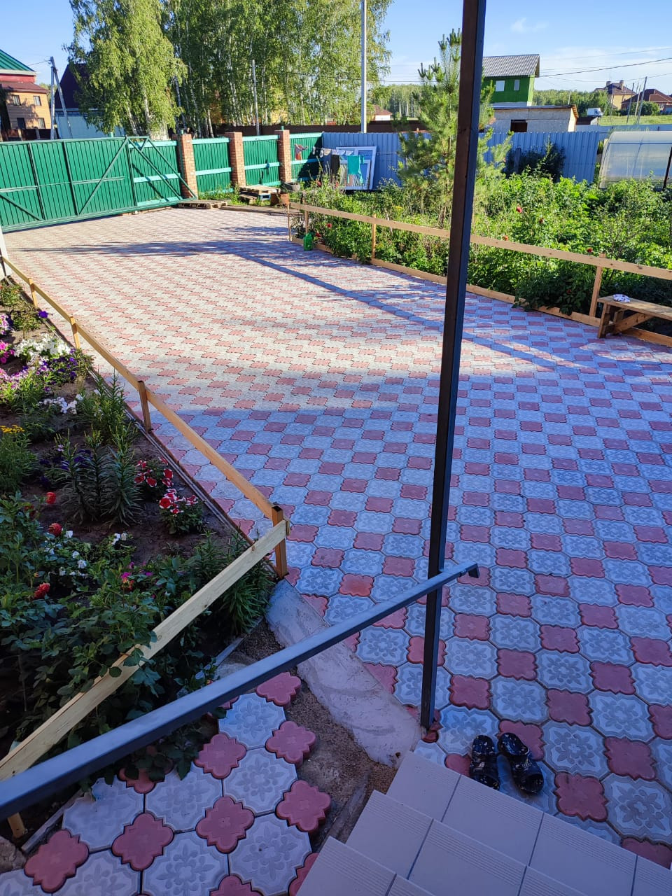 Вокруг дома выложили плиткой. Очень ухоженный сад, плодово-ягодные посадки, много цветов.