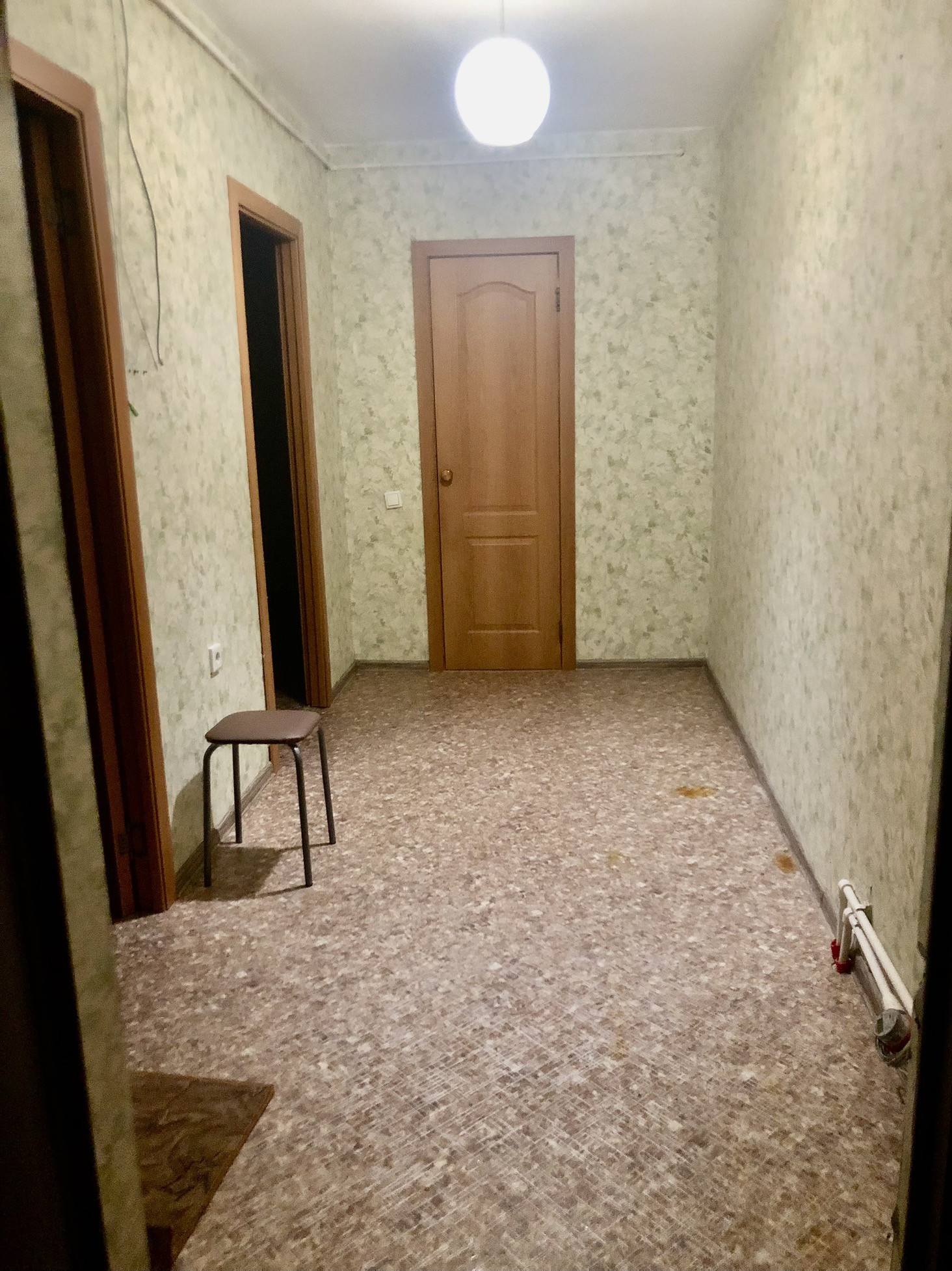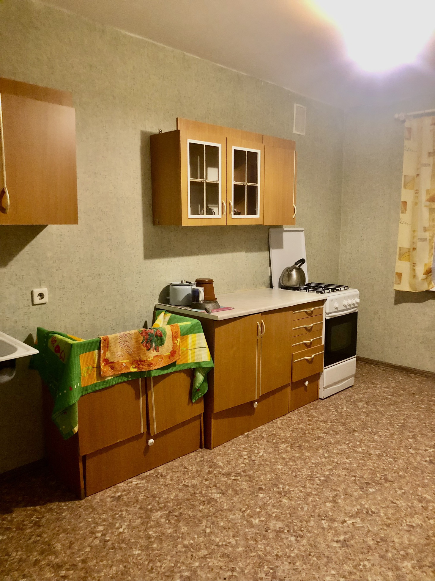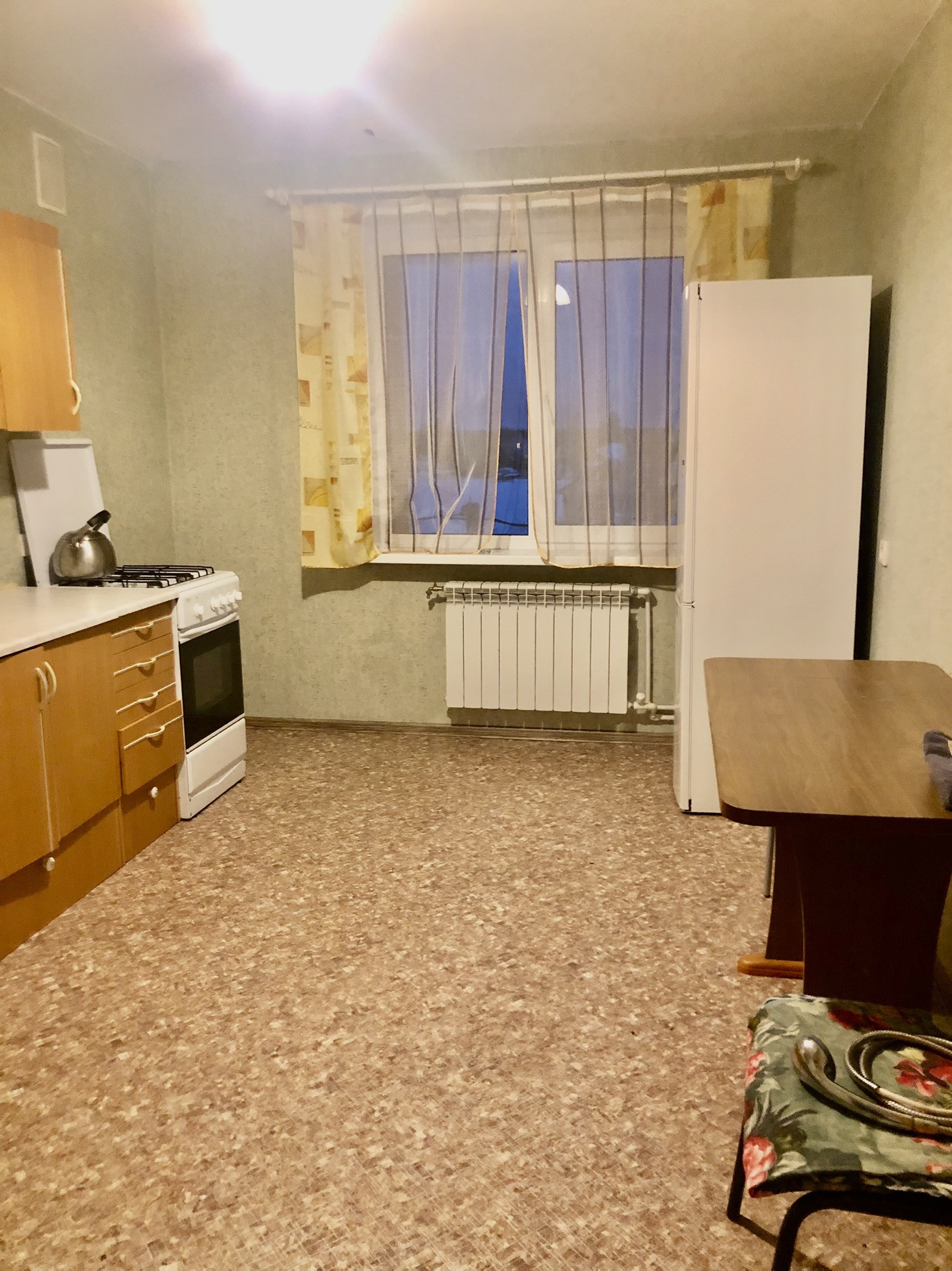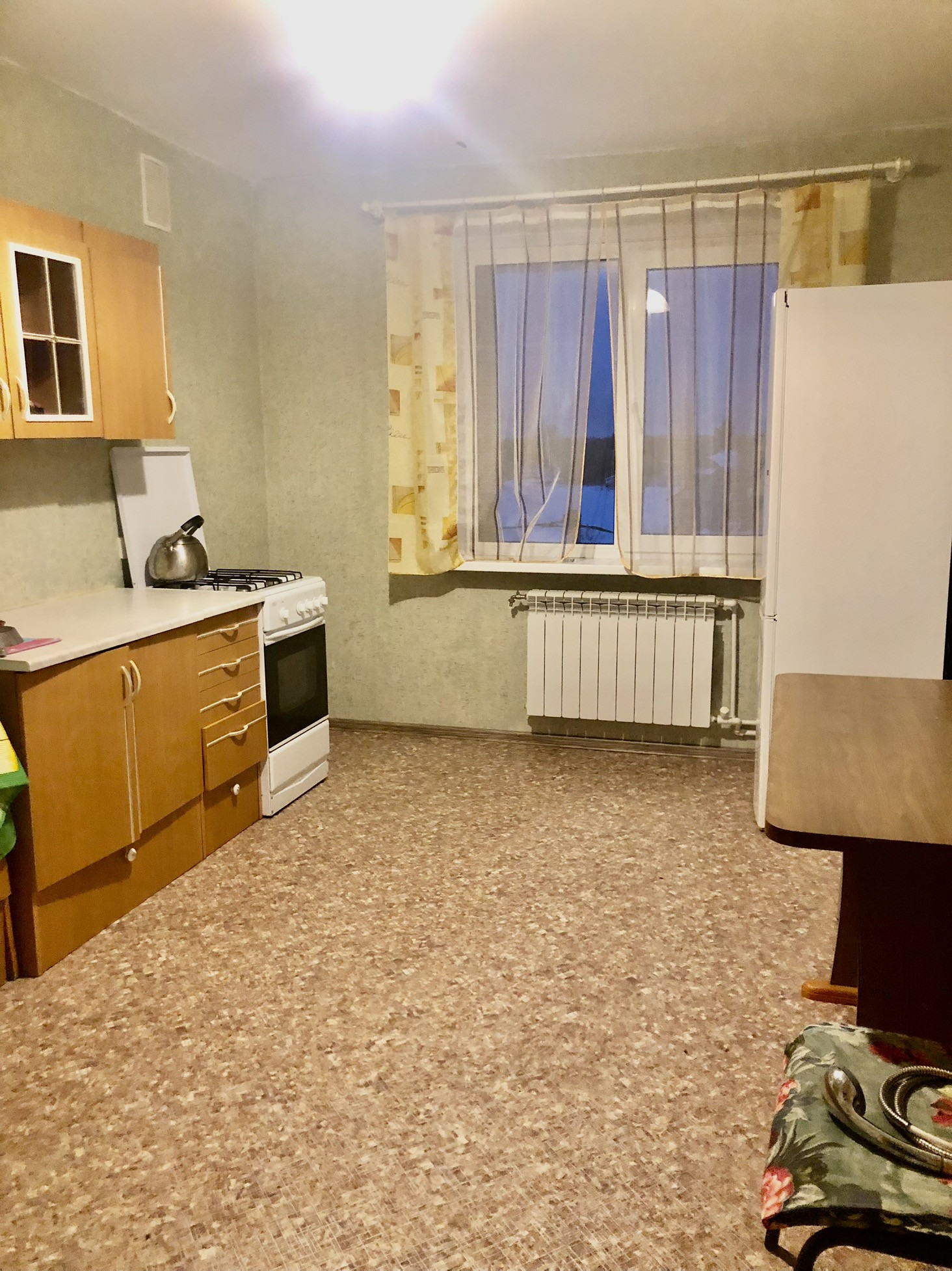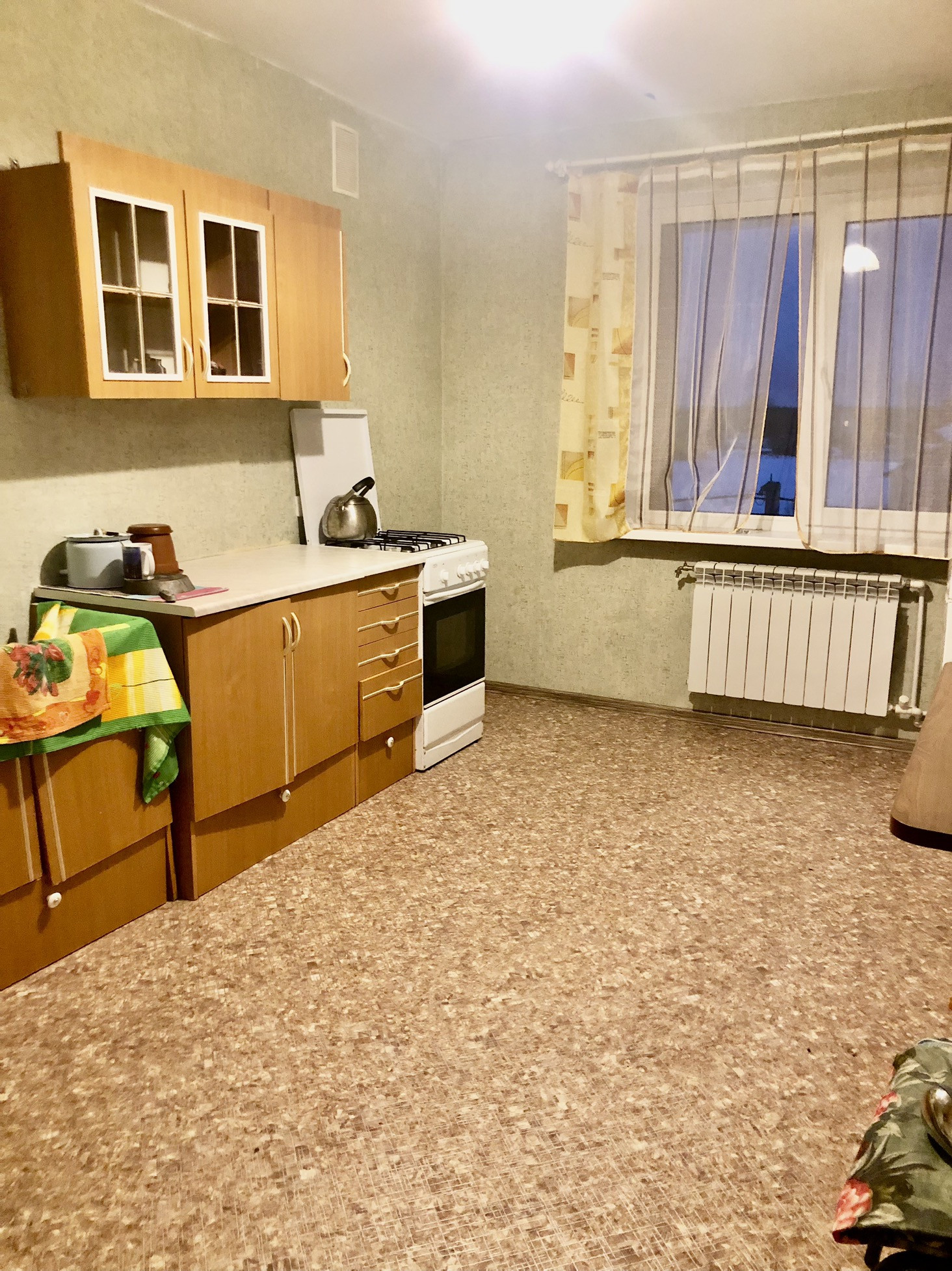 В квартире стеклопакеты. Потолки натяжные. Пол ламинат( комнаты), линолеум. Балкон 3,5 м.Кухонный гарнитур останется новым собственникам. Санузел совмещен: плитка, трубы пластик ( счетчики).