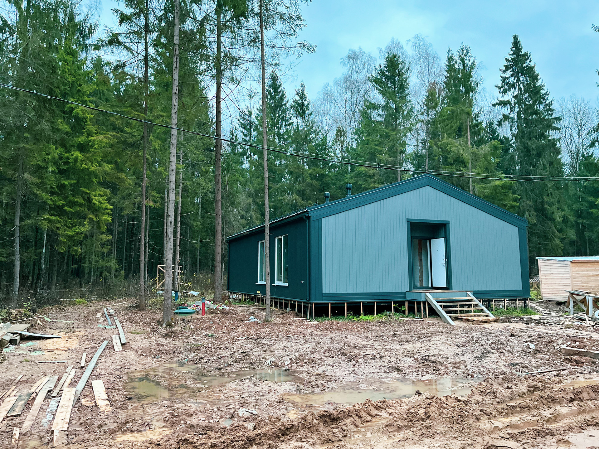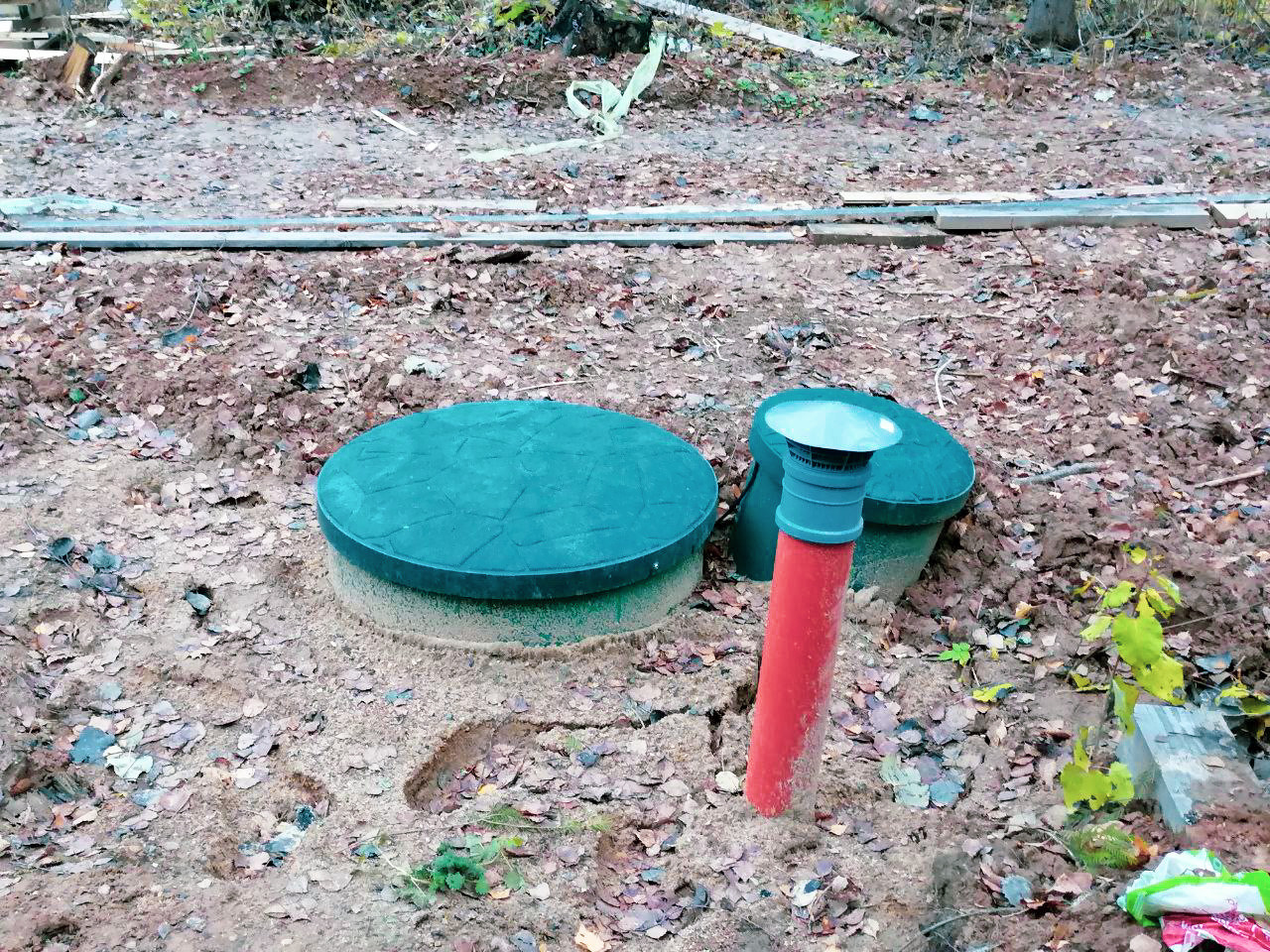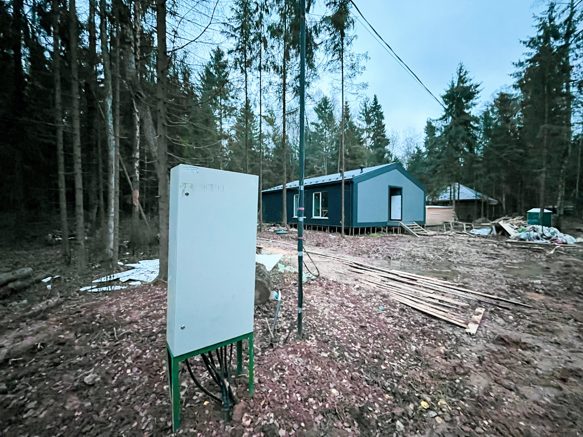 Установлен септик на 5 человек, пробурена скважина, выделенная линия на 15 кВт.