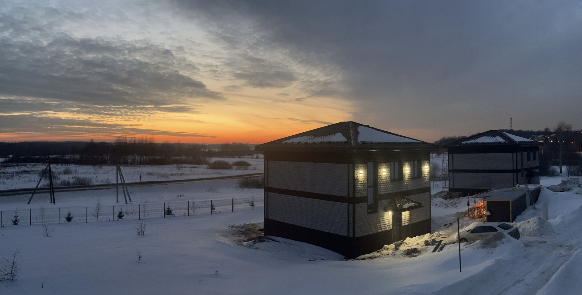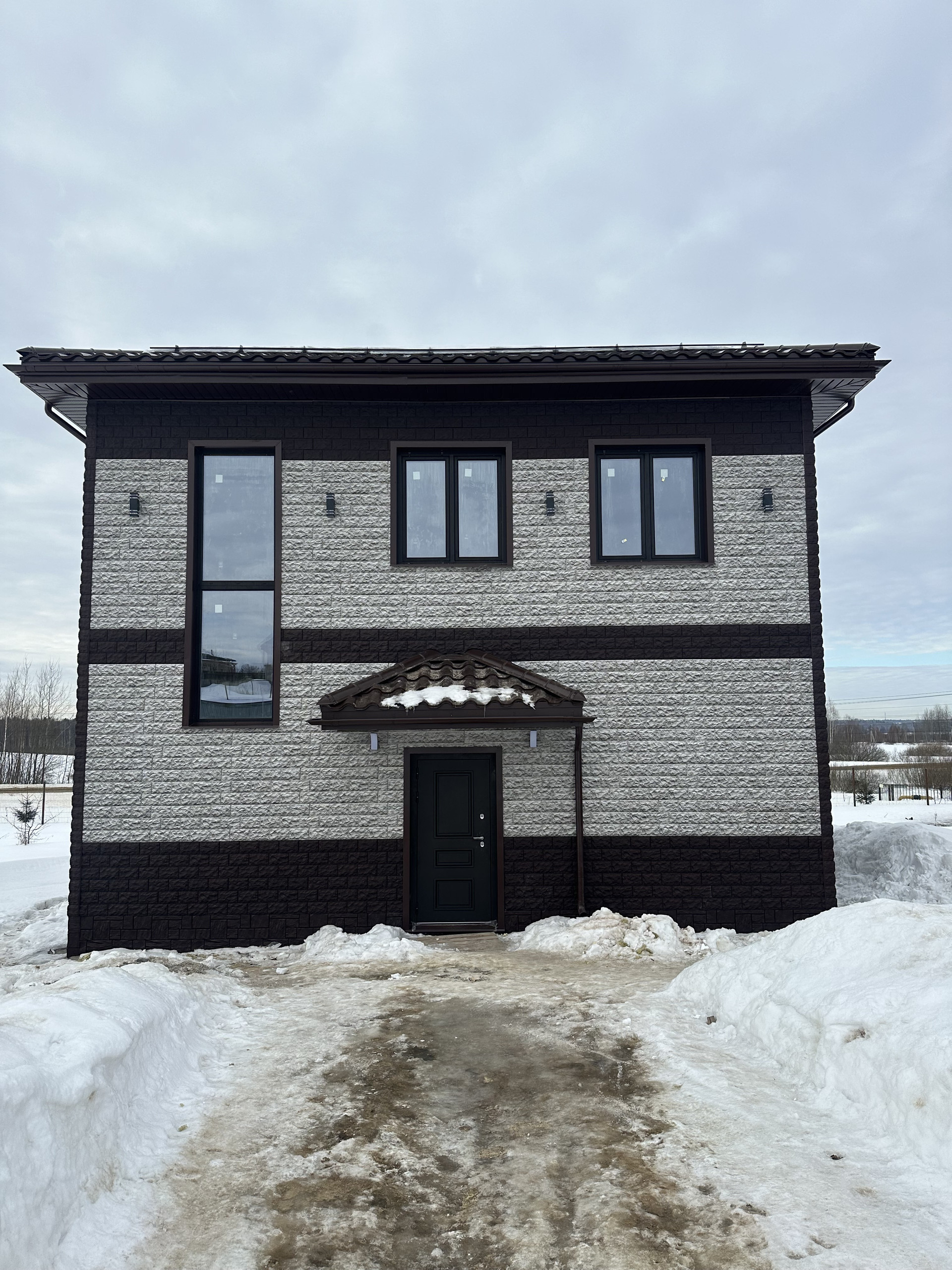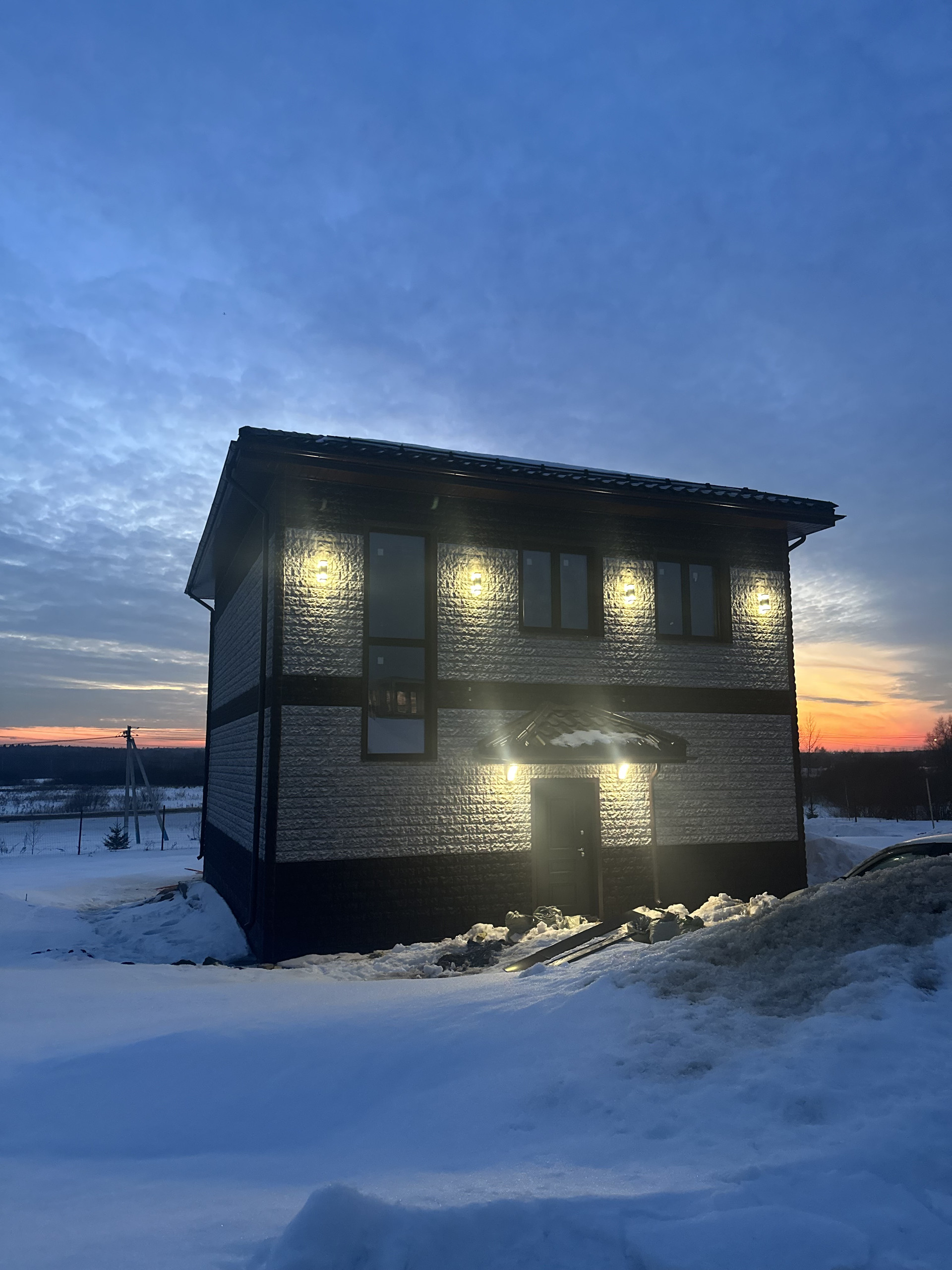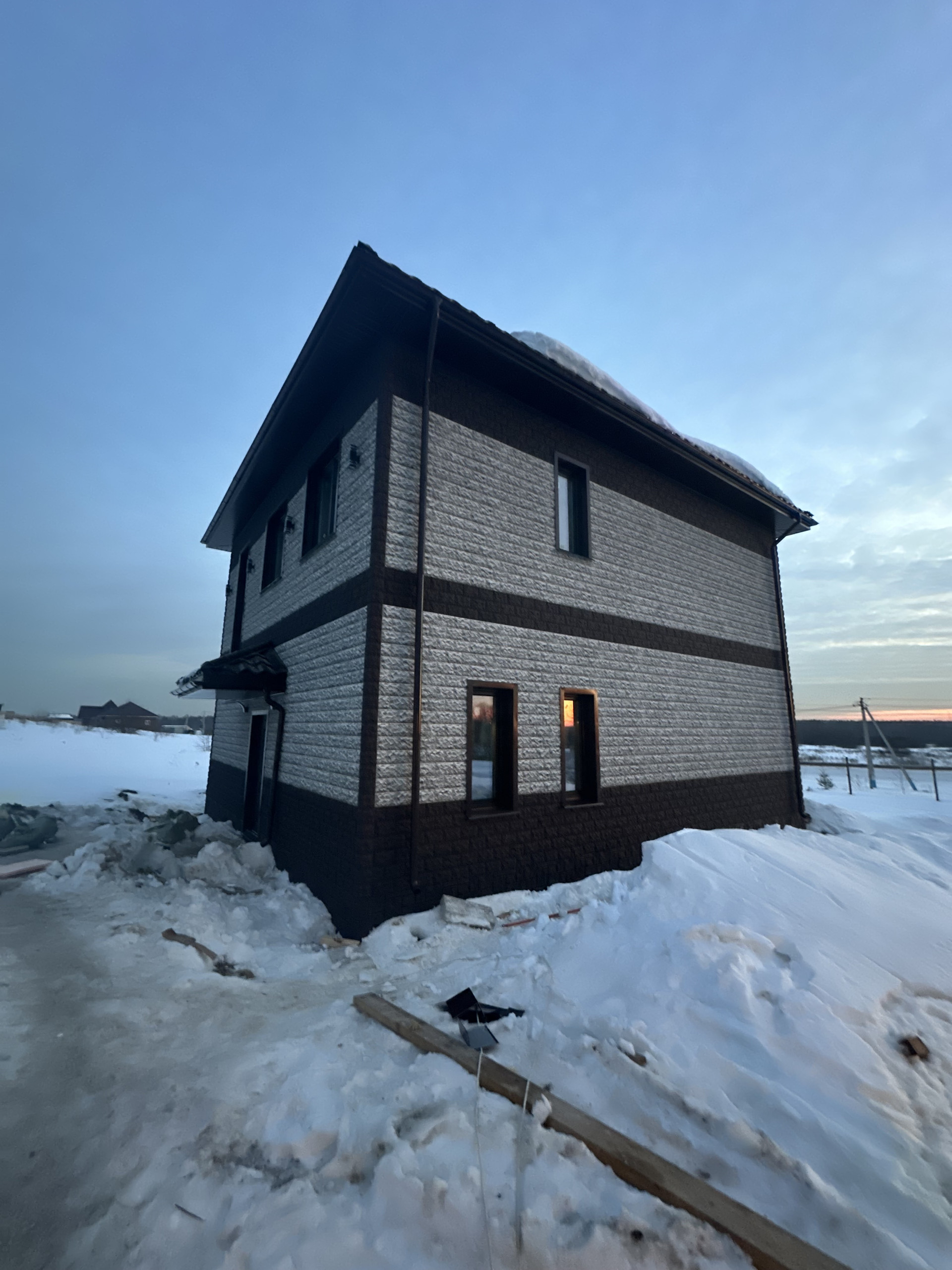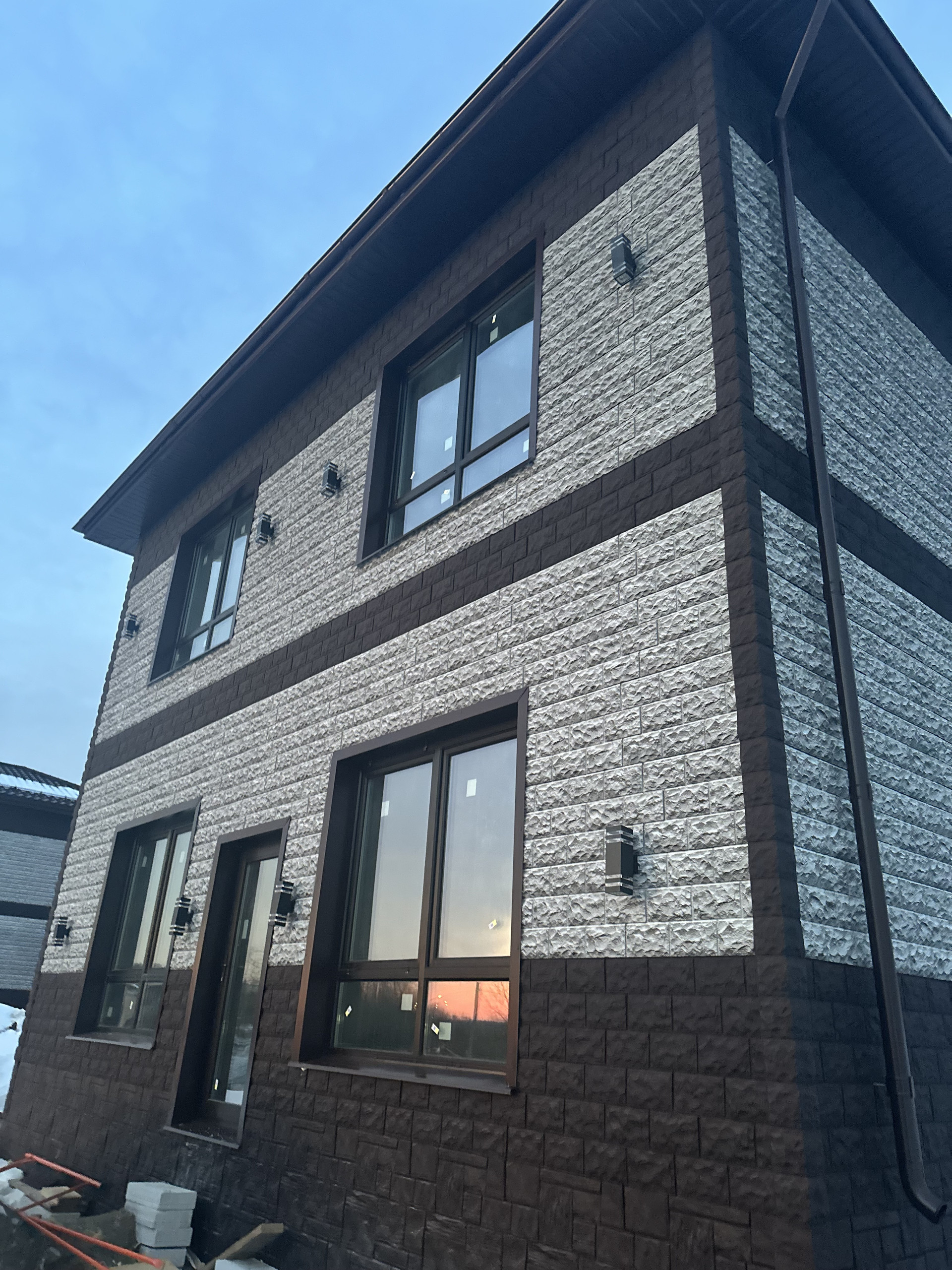 6. Собран вентилируемый фасад из бруса и металл профиля с утеплителем 100 мм плотностью 50 фирмы Изолайт минвата, она же закрыта дышащей пленкой Изоспан, категории А, фасадные панели от фирмы Fineber , модель дачный доломит , который придает безупречный вид ! Проведна электрика в дом и собран щиток для продолжении электромонтажных работ , подключено освещение на фасад дома