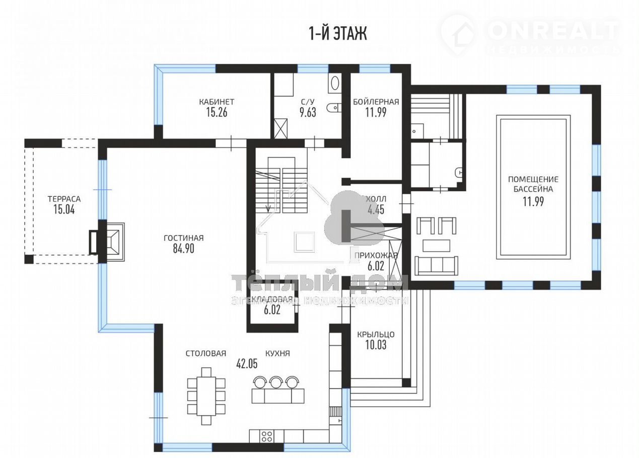 * 1 этаж: Просторная гостиная с панорамными окнами, кухня-столовая, кабинет для работы, бассейн с возможностью обустройства SРА-зоны и сауны, холл, санузел, бойлерная.
