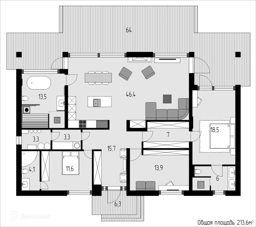 В доме большая гостиная с кухней-столовой, высотой потолков 4, 7 метра и огромными мансардными окнами, создающими ощущение воздушности и заполняющими все пространство светом. Одна мастер-спальня, со своим с/у и входом через гардеробную комнату, изолирующую спальню от общественных помещений и придающую ей больше приватности. Большой с/у с сауной и панорамным окном на задний двор. Кабинет, детская со своим с/у, котельная и воздушная прихожая. Перед домом залиты стенки двухуровневой просторной террасы с выходами на нее из зала, общего с/у и мастер-спальни.