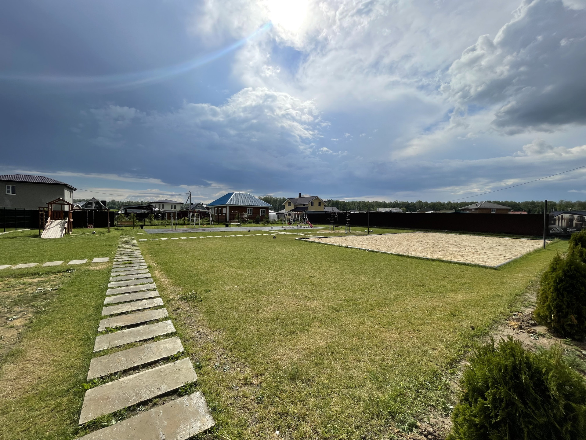 Участок правильной формы, ширина участка 26,5 метров, длина 34 метра. Ландшафт ровный. С двух сторон участок огорожен. Находится в центре коттеджного поселка. Территория огорожена, имеется охранное КПП со шлагбаумом.